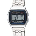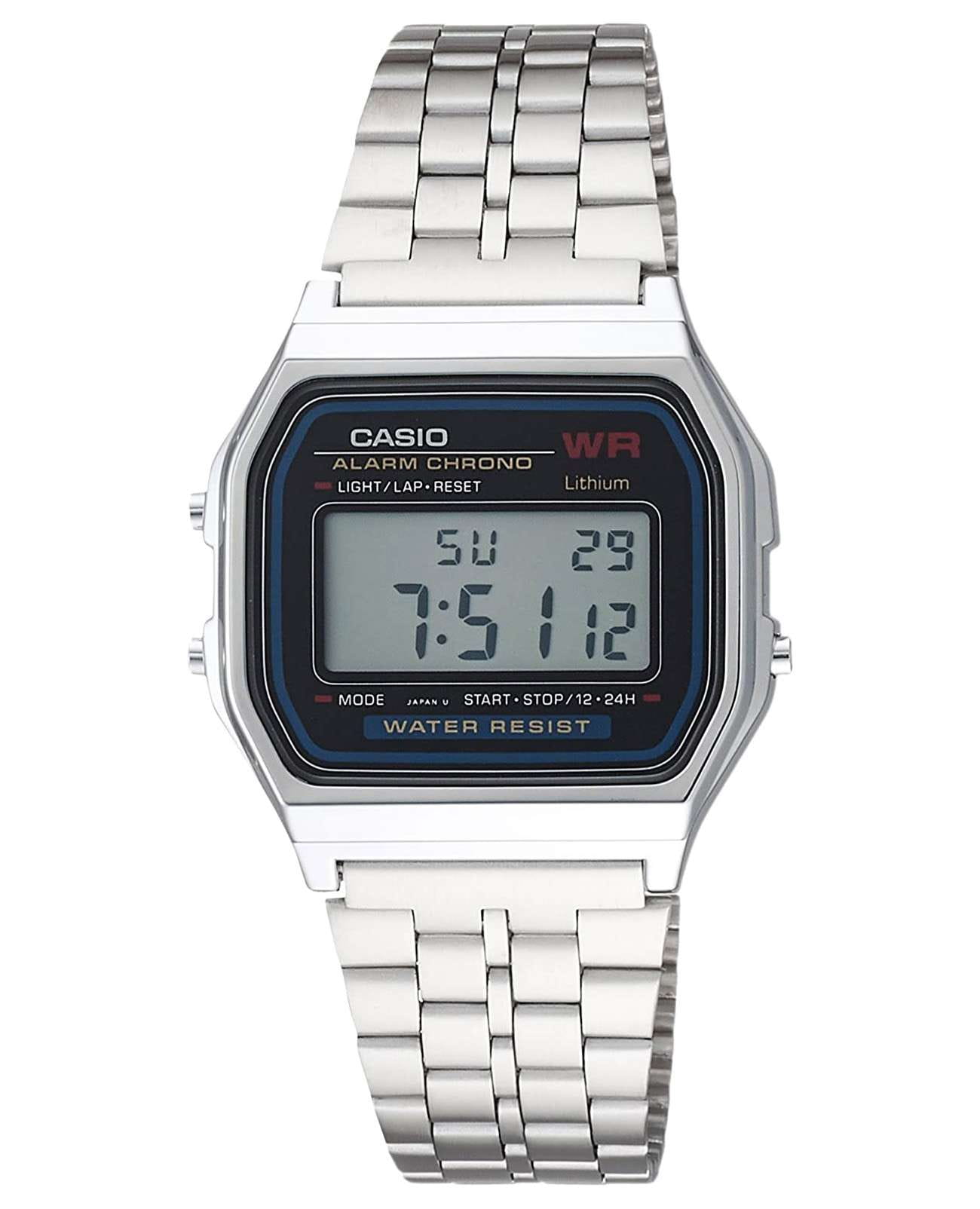 Японские наручные часы с хронографом Casio Vintage A159W-N1, кварцевый механизм с высокой точностью. Класс водозащиты: 30 метров, позволит защитить корпус от случайных брызг или капель дождя. Корпус часов изготовлен из стали, серебристого цвета. ХронографХронографФункция позволяет измерять отрезки времени с особой точностью: часы, минуты, секунды. Верным признаком хронографа является наличие на циферблате 3 дополнительных окошек-счётчиков.. Циферблат подсвечивается светодиодом. СекундомерСекундомерСекундоме́р — прибор, способный измерять интервалы времени с точностью до долей секунды. с точностью показаний 1/100 сек и временем измерения 1 ч. 12-ти и 24-х часовой формат времени. Раскладывающаяся застежка.