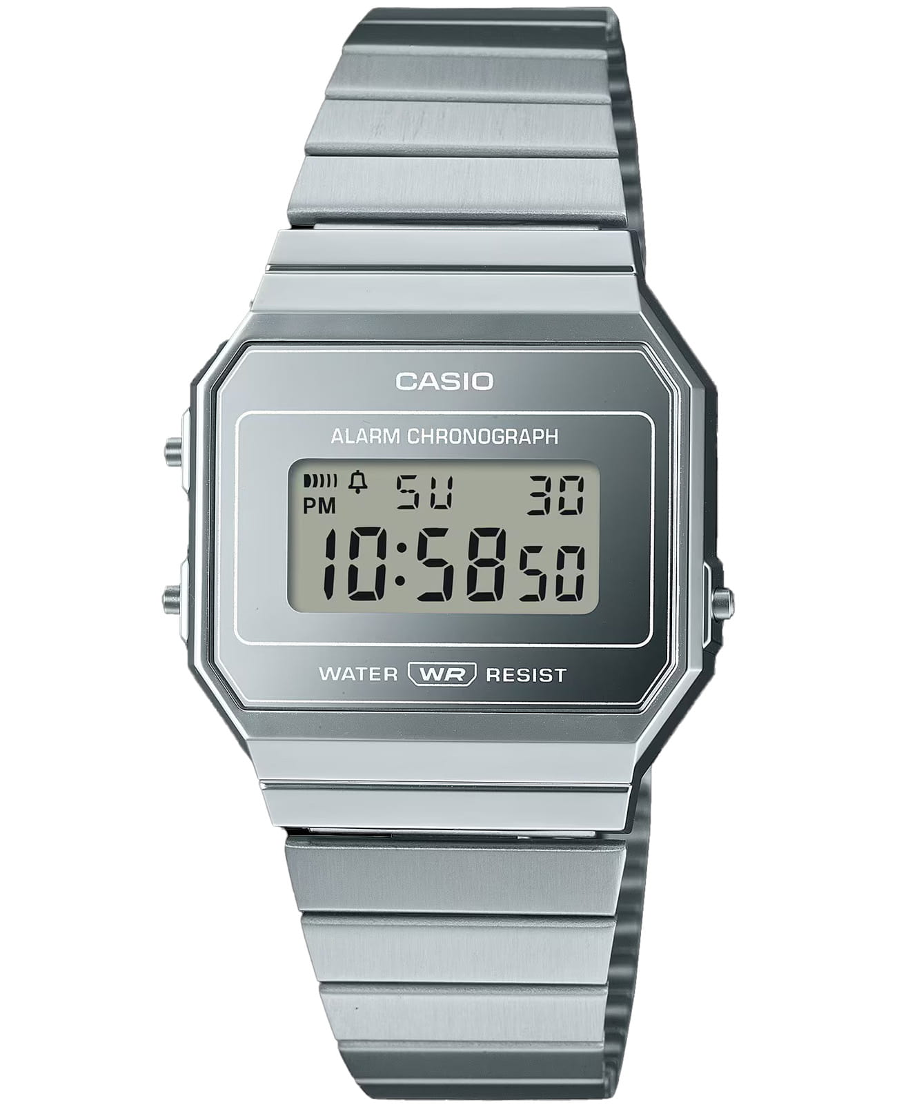 Спортивные японские мужские часы с секундомеромСекундомерСекундоме́р — прибор, способный измерять интервалы времени с точностью до долей секунды. Casio Vintage A700WEV-7A, кварцевый механизм с высокой точностью. Издавая звуковой сигнал в установленное время, будильникБудильникБуди́льник — часы, в заданный момент времени подающие звуковой, световой и/или в редких случаях другой сигнал. напоминает о событиях, которые повторяются каждый день. Корпус из полимерного пластика. Класс водозащиты: 30 метров, позволит защитить корпус от случайных брызг или капель дождя. Браслет из нержавеющей стали на раскладной застёжкеРаскладная застёжкаТакой тип застёжки используется только на браслетах из металла. Она никогда не раскрывается полностью, происходит разделение на 2 и более частей. Раскладывающая застёжка снизит вероятность потери часов к минимуму..