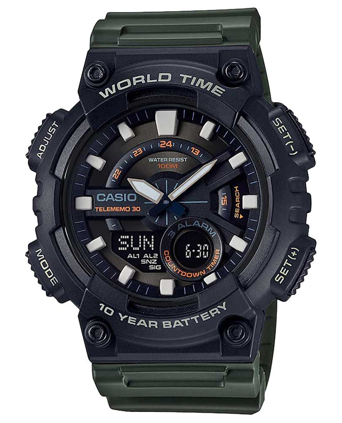 Спортивные японские мужские наручные часы Casio Collection AEQ-110W-3AVDF (AEQ-110W-3A), кварцевый механизм с высокой точностью. Класс водозащиты: 100 метров, позволит плавать, нырять и заниматься другими водными видами спорта. Корпус часов изготовлен из пластика, цвета.