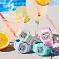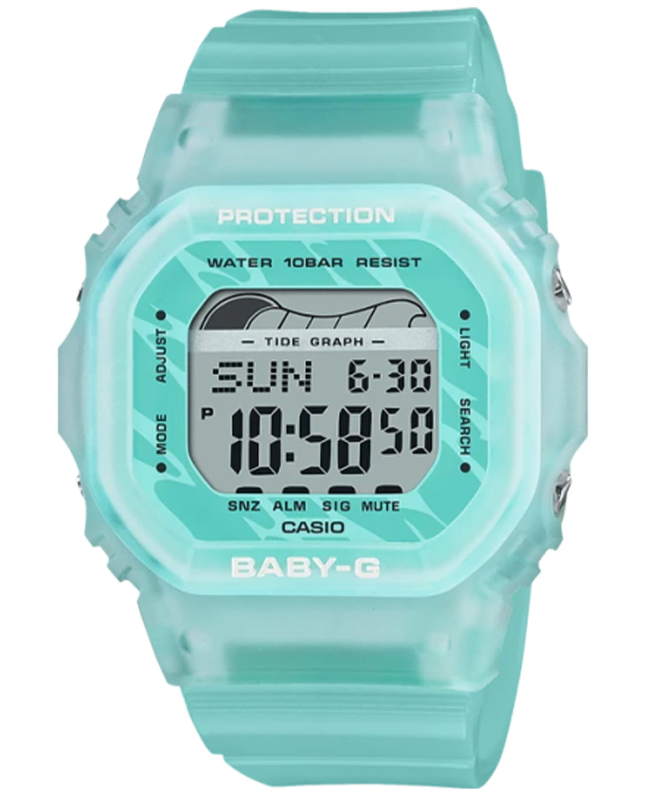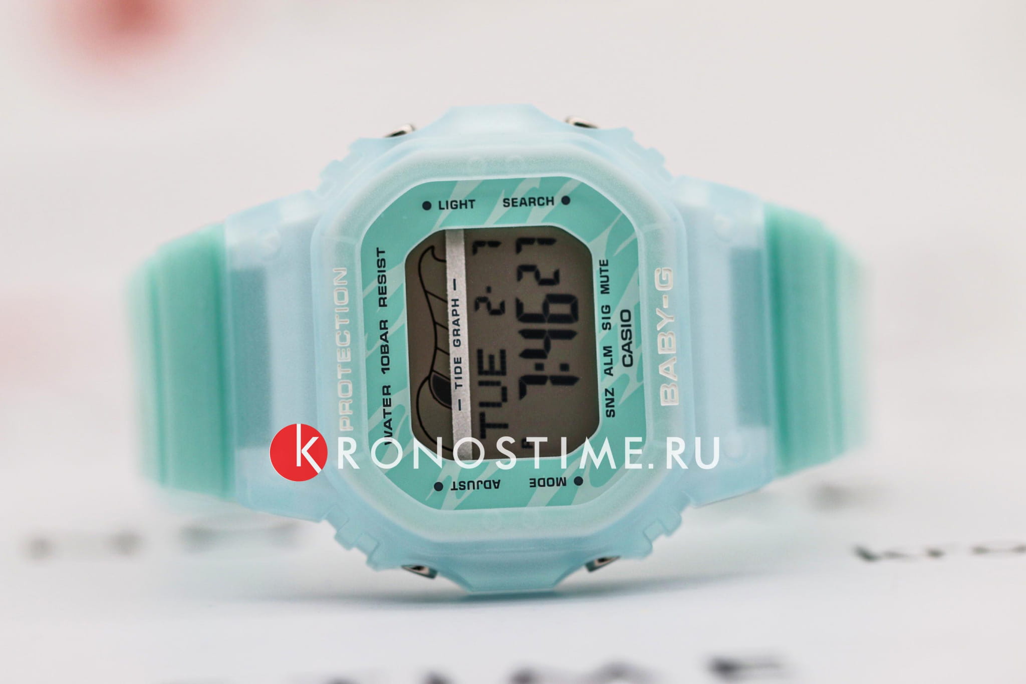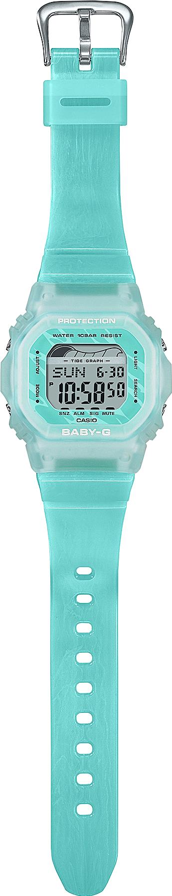 Женские противоударные японские часы с лунным календарем Casio Baby-G BLX-565S-2, кварцевый механизм с высокой точностью. Класс водозащиты: 100 метров, позволит плавать, нырять и заниматься другими водными видами спорта. Корпус часов изготовлен из пластика бирюзовацвета. Ударопрочный корпусУдаропрочный корпусМеханизм заключён в корпус, выполненный из современных материалов, устойчивых к ударам, механическим повреждениям и падению с высоты: инновационный пластик, карбон, нержавеющая сталь, титан. защищает механизм от ударов и вибрации. Светодиодная подсветкаСветодиодная подсветкаСветодиодная или LED-подсветка обеспечивает появление яркого холодного свечения за счёт LED-элементов - маленьких лампочек. Они потребляют минимальное количество энергии, чаще всего можно встретить 1 светодиод, в нижней части циферблата. освещает весь циферблат, после отпускания кнопки свечение продолжается еще некоторое время. Особенность модели в функциях будильникаБудильникБуди́льник — часы, в заданный момент времени подающие звуковой, световой и/или в редких случаях другой сигнал., секундомераСекундомерСекундоме́р — прибор, способный измерять интервалы времени с точностью до долей секунды., таймера и мирового времениМировое время Полезное часовое усложнение, отображающее время в основных городах и известных областях по всему миру, оно связано с часовыми поясами, удобно для путешественников и бизнесменов. .