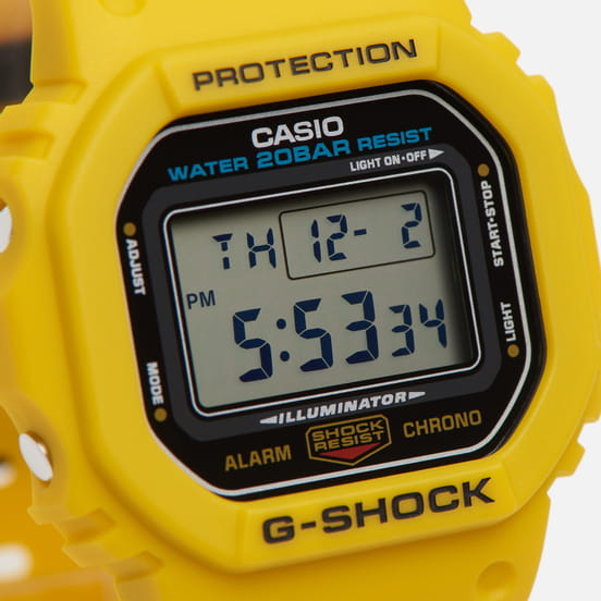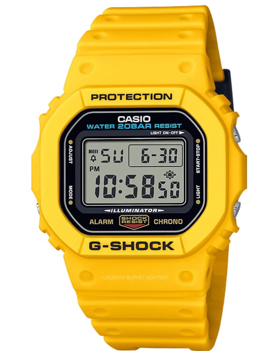 Японские мужские часы противоударные Casio G-Shock DW-5600REC-9, электронный механизм с высокой точностью. Класс водозащиты: 200 метров, позволит плавать, нырять и заниматься другими водными видами спорта. Корпус часов изготовлен из пластика, желтого цвета.