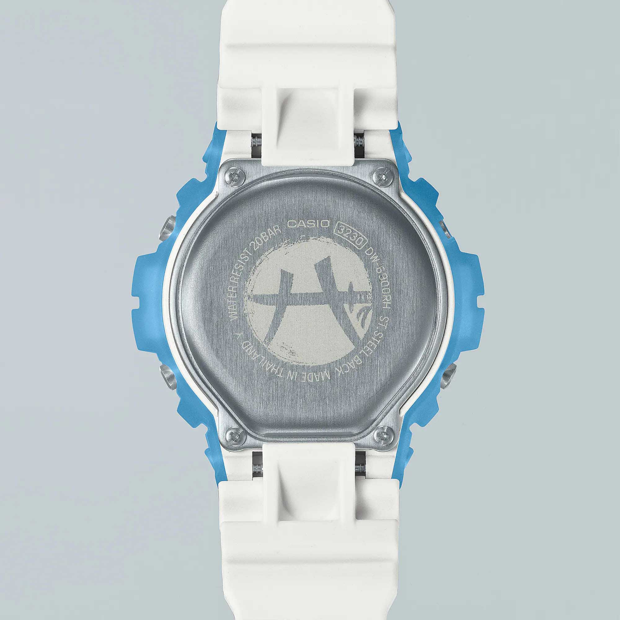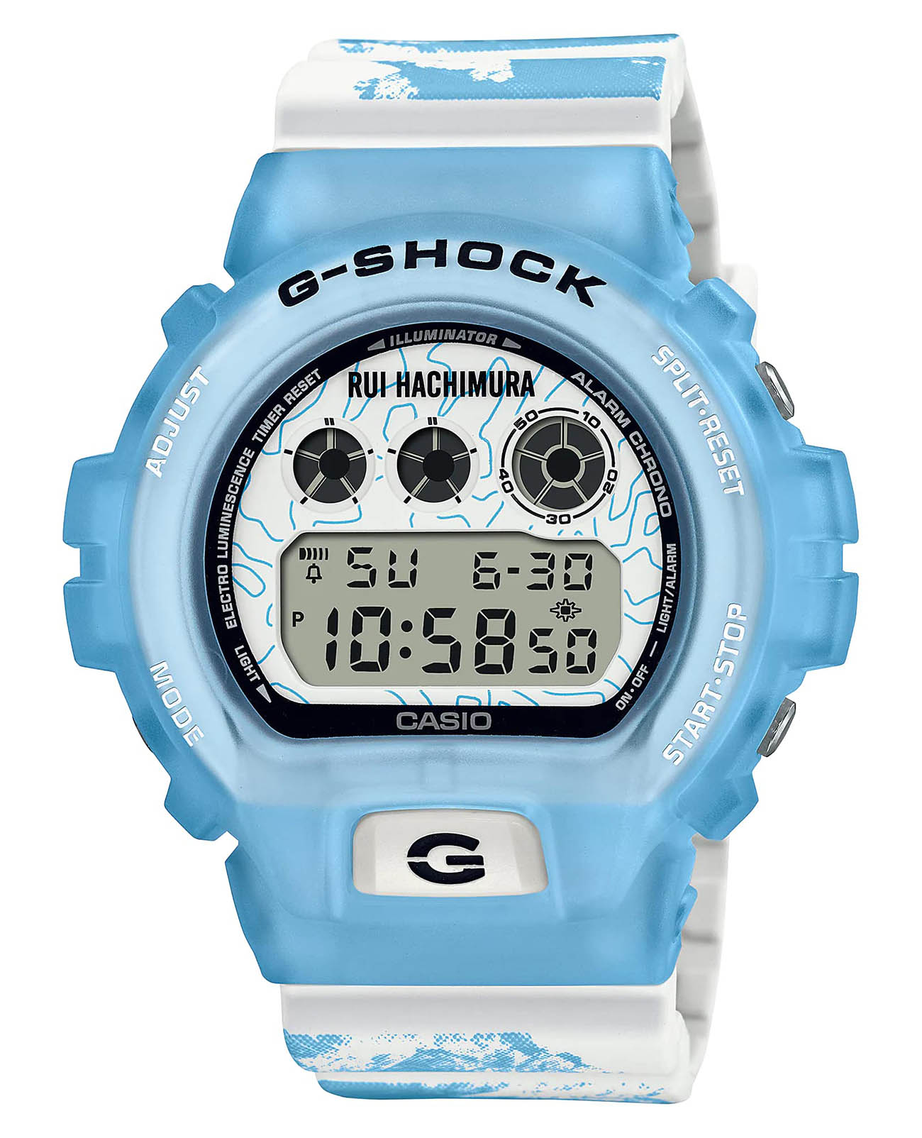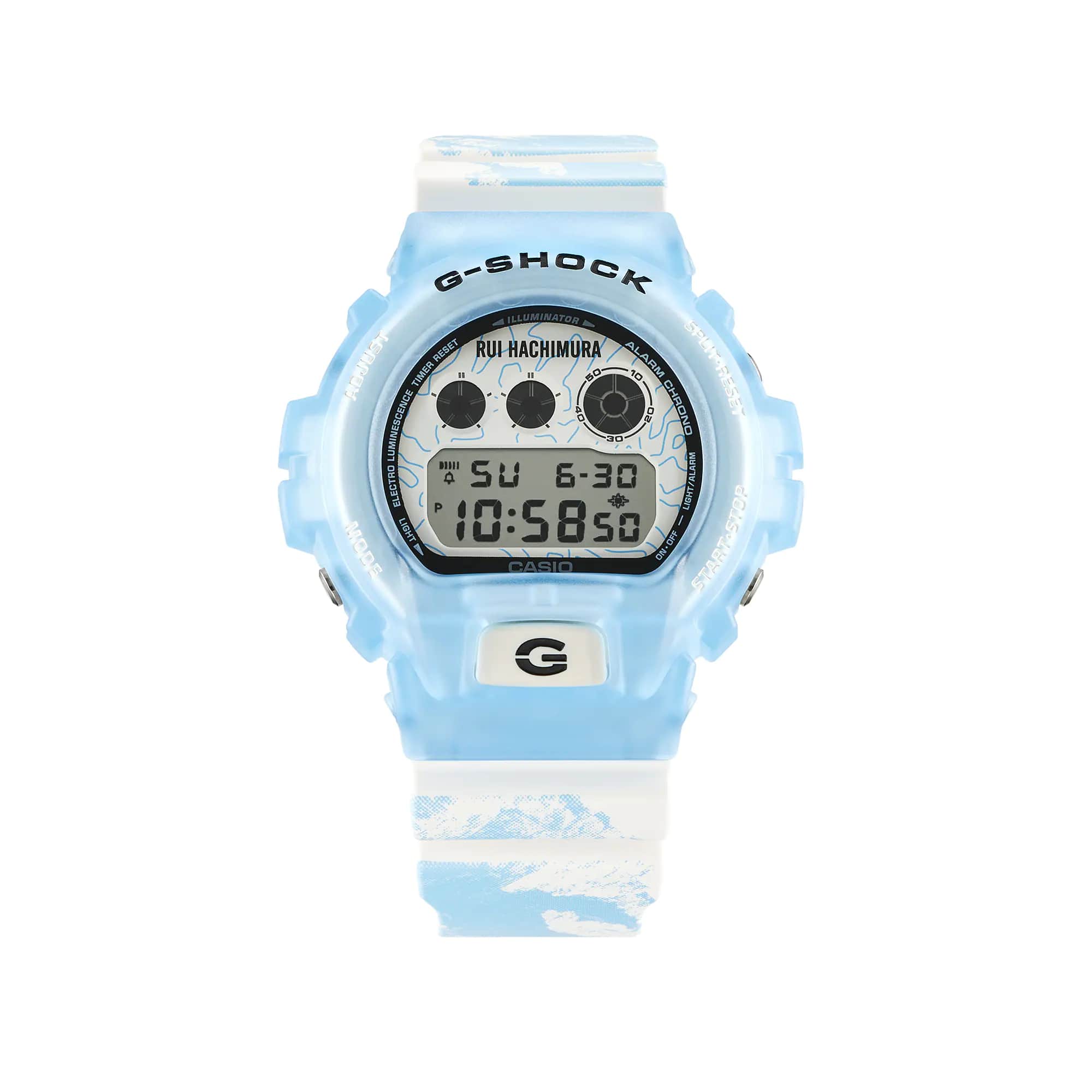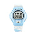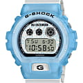 Мужские японские противоударные часы с хронографом Casio G-Shock DW-6900RH-2, электронный механизм с высокой точностью. Класс водозащиты: 200 метров, позволит плавать, нырять и заниматься другими водными видами спорта. Корпус часов изготовлен из пластика, прозрачного цвета.
