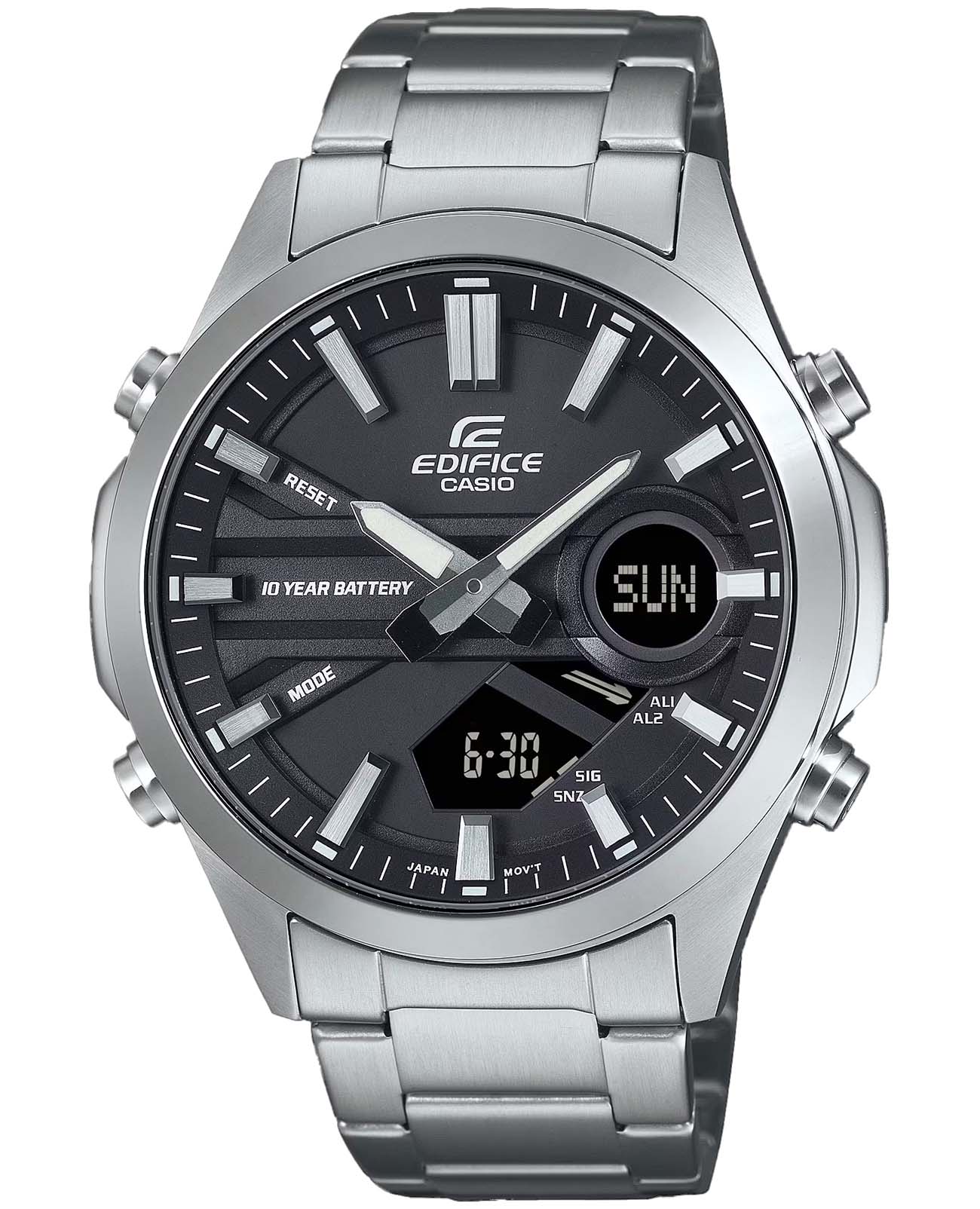 Японские мужские кварцевые часы c хронографомХронографФункция позволяет измерять отрезки времени с особой точностью: часы, минуты, секунды. Верным признаком хронографа является наличие на циферблате 3 дополнительных окошек-счётчиков. Casio Edifice EFV-C120D-1ADF (EFV-C120D-1A), кварцевый механизм с высокой точностью. Класс водозащиты: 100 метров, позволит плавать, нырять и заниматься другими водными видами спорта. Корпус часов изготовлен из стали. Стальной браслет на раскладной застёжкеРаскладная застёжкаТакой тип застёжки используется только на браслетах из металла. Она никогда не раскрывается полностью, происходит разделение на 2 и более частей. Раскладывающая застёжка снизит вероятность потери часов к минимуму., расстегиваемой одним касанием. Подсветка NeobriteПодсветка NeobriteИспользование светонакопительных составов на основе сульфида цинка или алюмината стронция, яркий свет можно наблюдать на протяжении 6-10 часов после «зарядки» часов около источника света. обеспечивает длительное послесвечение в темноте даже после кратковременного нахождения на свету. Циферблат с метками в виде штрихов. 12-ти и 24-х часовой формат времени. СекундомерСекундомерСекундоме́р — прибор, способный измерять интервалы времени с точностью до долей секунды. с точностью показаний 1/100с и временем измерения 24ч. Сплит-хронографСплит-хронографИспользуется для измерения продолжительности нескольких временных отрезков, начинающихся одновременно, а заканчивающихся в разное время.. ТаймерТаймерОтсчитывает секунды в обратном направлении в заданном интервале времени. обратного отсчета от 1мин до 24ч. Мировое времяМировое время Полезное часовое усложнение, отображающее время в основных городах и известных областях по всему миру, оно связано с часовыми поясами, удобно для путешественников и бизнесменов. – 30 городов (29 часовых поясов), возможность включения/отключения летнего времени. Записная книжка на 30 ячеек памяти для записи имен и телефонных номеров, каждая запись может включать в себя текст из 8 букв и 16 цифр. Класс водозащиты: 100 метров, позволит плавать, нырять и заниматься другими водными видами спорта.