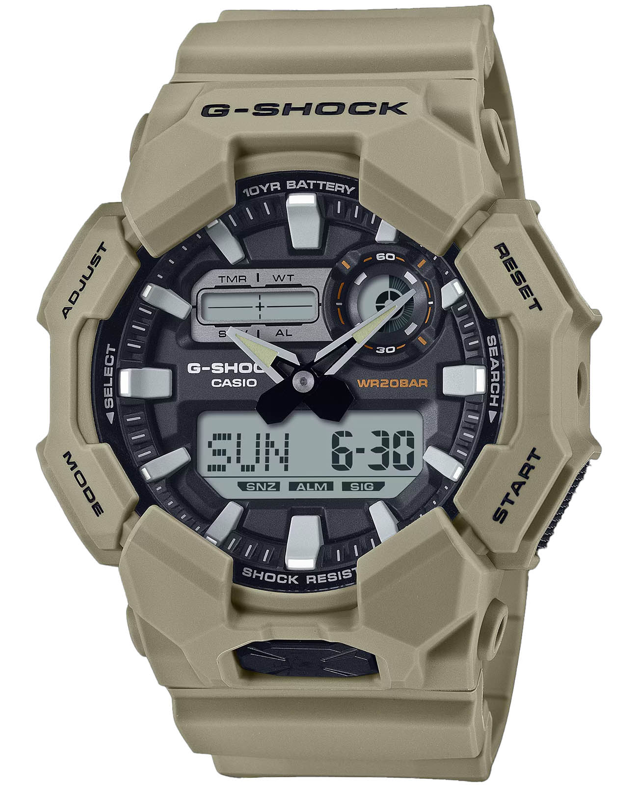 Японские мужские многофункциональные часы Casio GA-010-5A. Функции: автоматическая светодиодная подсветка, ударопрочный корпусУдаропрочный корпусМеханизм заключён в корпус, выполненный из современных материалов, устойчивых к ударам, механическим повреждениям и падению с высоты: инновационный пластик, карбон, нержавеющая сталь, титан., функция Мирового времениМировое время Полезное часовое усложнение, отображающее время в основных городах и известных областях по всему миру, оно связано с часовыми поясами, удобно для путешественников и бизнесменов. , секундомерСекундомерСекундоме́р — прибор, способный измерять интервалы времени с точностью до долей секунды., таймерТаймерОтсчитывает секунды в обратном направлении в заданном интервале времени., 5 будильниковБудильникБуди́льник — часы, в заданный момент времени подающие звуковой, световой и/или в редких случаях другой сигнал., автоматический календарь, 12/24 отображение времени. Минеральное стеклоМинеральное стеклоМинеральное стекло представляет собой искусственно выращенный минерал кварца. Такое стекло отличается особой устойчивостью к повреждениям и царапинам. Уступает по некоторым качествам сапфировому стеклу. устойчивое к появлению царапин, обладающее высокой прозрачностью. Класс водозащиты: 200 метров, позволит плавать, нырять и заниматься другими водными видами спорта. Срок жизни батареи 10 лет. Габариты (Ш x В x Г) 55,1 х 51,9 х 17,5. Вес 67 г.