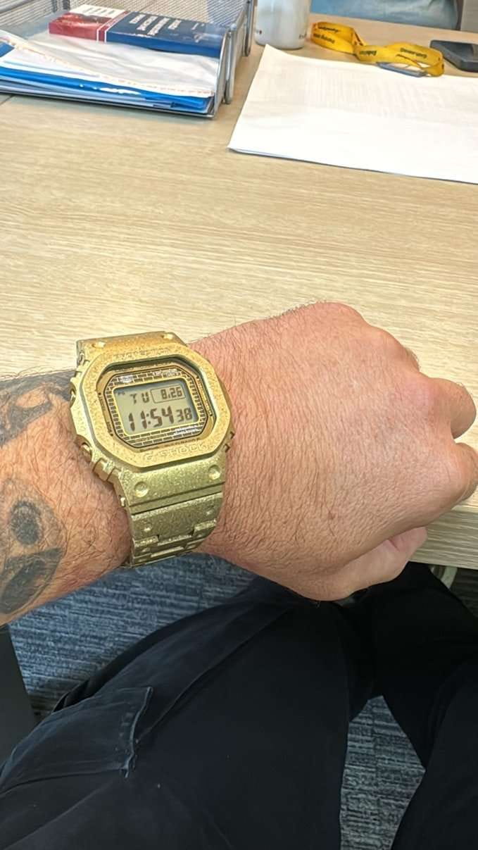 После перекристаллизации и многослойной закалки безель и ремешок покрыты ионным золотом, а задняя крышка с винтовым замком покрыта DLC-покрытием для придания смелого, сияющего вида. В знак особого уважения к DW-5000 на циферблате выгравирована фраза “С 1983 года”.