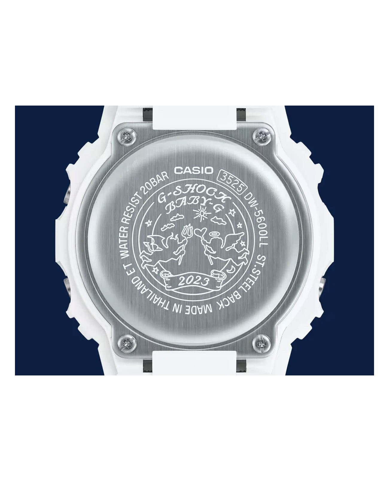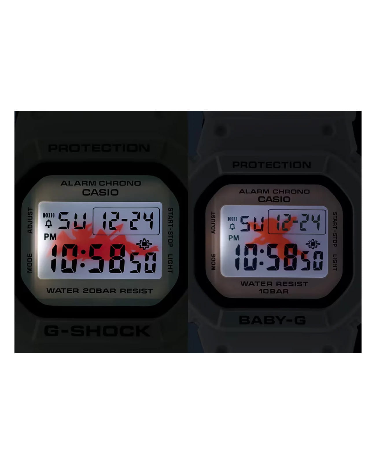 В этом году G представляет коллекцию Lover's Collection LOV-23A-7, в которую входят G-Shock DW-5600 и Baby-G BGD-565. В часах использованы белый и синий цвета и тканевые ремешки первой коллекции Lover's, выпущенной в 1996 году. Эти часы, выпущенные ограниченным тиражом, украшены вышитыми ангелом и дьяволом бирками на нижних ремешках, графическими изображениями red angel (BGD-565) и devil (DW-5600) на светодиодной подсветкеСветодиодная подсветкаСветодиодная или LED-подсветка обеспечивает появление яркого холодного свечения за счёт LED-элементов - маленьких лампочек. Они потребляют минимальное количество энергии, чаще всего можно встретить 1 светодиод, в нижней части циферблата. и специальной гравировкой Lover's Collection на задней крышке корпуса из нержавеющей стали. Обе пары имеют ударопрочный корпусУдаропрочный корпусМеханизм заключён в корпус, выполненный из современных материалов, устойчивых к ударам, механическим повреждениям и падению с высоты: инновационный пластик, карбон, нержавеющая сталь, титан., часовой сигнал времени, секундомерСекундомерСекундоме́р — прибор, способный измерять интервалы времени с точностью до долей секунды., таймерТаймерОтсчитывает секунды в обратном направлении в заданном интервале времени., многофункциональный будильникБудильникБуди́льник — часы, в заданный момент времени подающие звуковой, световой и/или в редких случаях другой сигнал., 12 и 24-часовой формат времени, вечный календарьВечный календарьКлассическое часовое усложнение, представляющее собой календарь, рассчитанный на несколько лет вперёд (стандартно – до 2099 года). Определяет текущую дату, день недели, месяц.. Стилизованная светодиодная подсветкаСветодиодная подсветкаСветодиодная или LED-подсветка обеспечивает появление яркого холодного свечения за счёт LED-элементов - маленьких лампочек. Они потребляют минимальное количество энергии, чаще всего можно встретить 1 светодиод, в нижней части циферблата. освещает весь циферблат, после отпускания кнопки свечение продолжается еще некоторое время. Тканевый ремешок на стандартной застежке. G-Shock DW-5600 имеет вес 57гр, парметры: 48.9 × 42.8 × 13.4 мм. Класс водозащиты: 200 метров, позволит плавать, нырять и заниматься другими водными видами спорта. Baby-G BGD-565 имеет вес 35гр, параметры: 42.1 × 37.9 × 11.3 мм. Класс водозащиты: 100 метров, позволит плавать, нырять и заниматься другими водными видами спорта.