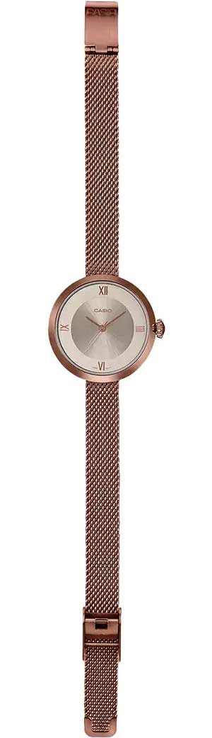Японские женские часы LTP-E154MR-9A с минеральным стекломМинеральное стеклоМинеральное стекло представляет собой искусственно выращенный минерал кварца. Такое стекло отличается особой устойчивостью к повреждениям и царапинам. Уступает по некоторым качествам сапфировому стеклу. из коллекции LTP являются представителем линейки минималистичных и лаконичных моделей, подходящих для дополнения делового, повседневного образа, наряда для торжественных случаев.