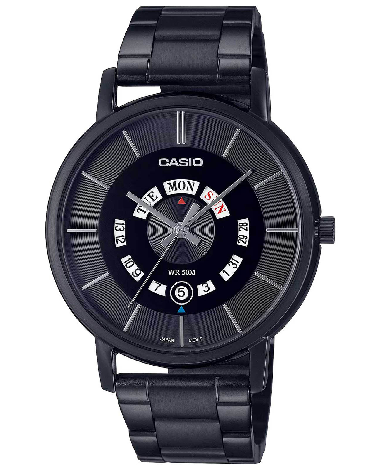 Японские мужские часы Casio Collection MTP-B135B-1A с минеральным стекломМинеральное стеклоМинеральное стекло представляет собой искусственно выращенный минерал кварца. Такое стекло отличается особой устойчивостью к повреждениям и царапинам. Уступает по некоторым качествам сапфировому стеклу. изящно смотрятся на запястье, они привлекают классическим исполнением и правильной геометрией. Минималистичная модель станет отличным решением для любого случая: на работу, переговоры с деловыми партнёрами, прогулку с друзьями или праздничный вечер. Отсутствуют лишние детали, что позволяет часам быть актуальными на долгие годы. Корпус и браслет выполнены из нержавеющей стали с IP-покрытиемIP-покрытиеМетод ионного напыления. Демонстрирует повышенную устойчивость к истиранию, окислению и химическим веществам. Под воздействием высокого давления и температуры около 1500°C молекулы металла надёжно соединяются с частицами корпуса часов.. Модель комплектуется надёжным механизмом, точность хода которого составляет +/- 20 сек/мес. Раскладная застёжкаРаскладная застёжкаТакой тип застёжки используется только на браслетах из металла. Она никогда не раскрывается полностью, происходит разделение на 2 и более частей. Раскладывающая застёжка снизит вероятность потери часов к минимуму.