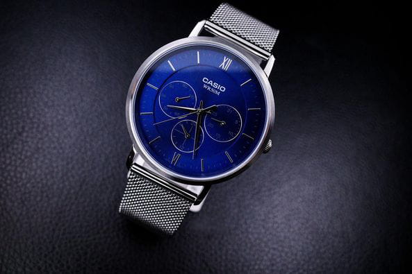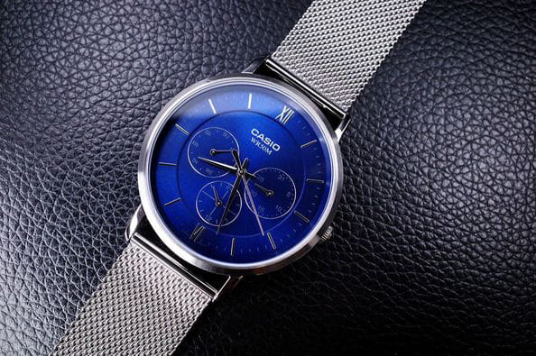 Японские мужские наручные часы с минеральным стекломМинеральное стеклоМинеральное стекло представляет собой искусственно выращенный минерал кварца. Такое стекло отличается особой устойчивостью к повреждениям и царапинам. Уступает по некоторым качествам сапфировому стеклу. Casio Collection MTP-B300D-2A, кварцевый механизм с высокой точностью. Класс водозащиты: 50 метров, позволит защитить корпус от случайных брызг или капель дождя. Корпус часов изготовлен из стали серебристого цвета. Стальной браслет на раскладной застёжкеРаскладная застёжкаТакой тип застёжки используется только на браслетах из металла. Она никогда не раскрывается полностью, происходит разделение на 2 и более частей. Раскладывающая застёжка снизит вероятность потери часов к минимуму.. 12-ти и 24-х часовой формат времени, число и день недели вынесены на отдельные циферблаты. Метки в виде штрихов и двух римских цифр. Батарея рассчитана на 2 года.