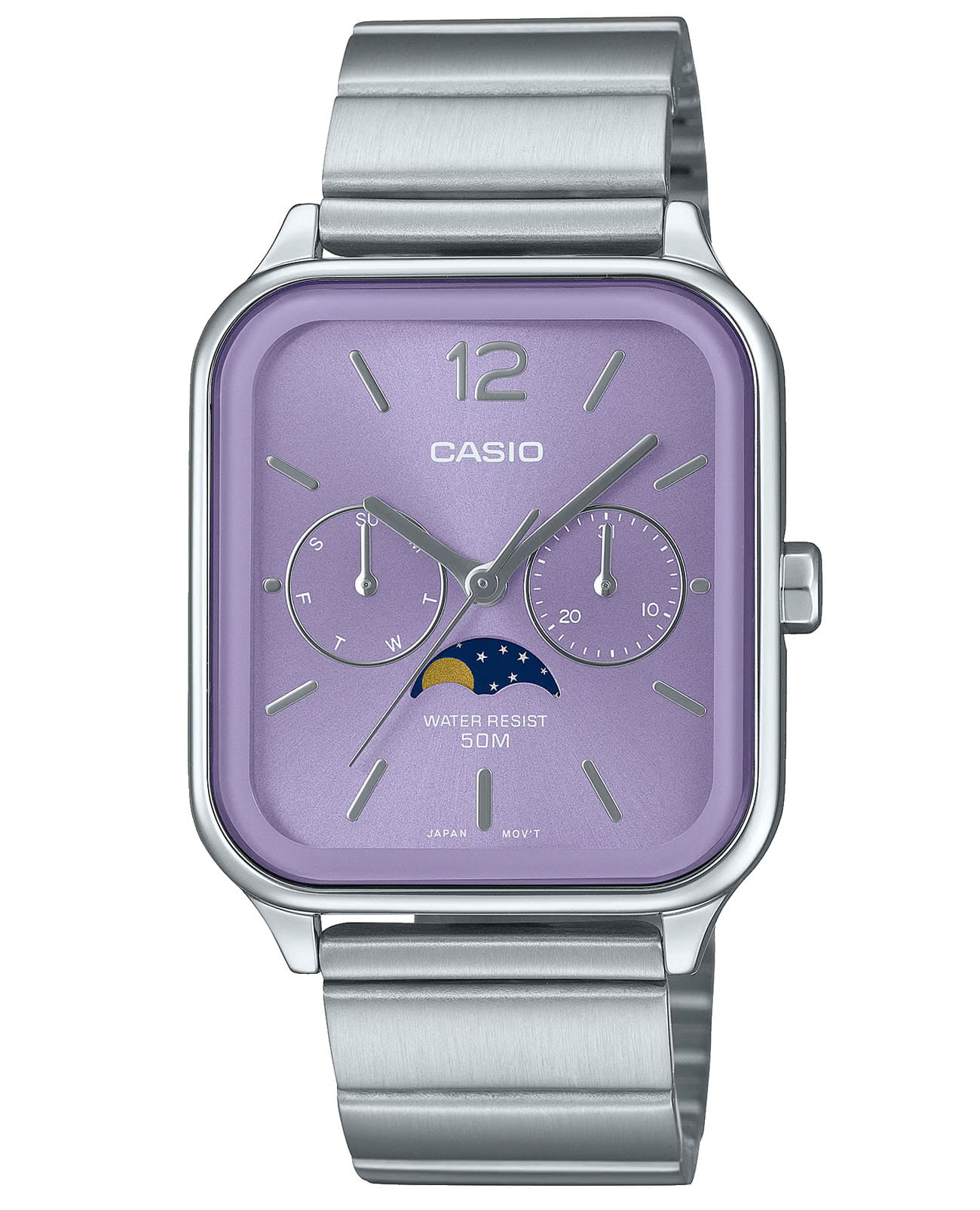 Японские мужские кварцевые часы с минеральным стекломМинеральное стеклоМинеральное стекло представляет собой искусственно выращенный минерал кварца. Такое стекло отличается особой устойчивостью к повреждениям и царапинам. Уступает по некоторым качествам сапфировому стеклу. Casio Collection MTP-M305D-6AVDF (MTP-M305D-6A), кварцевый механизм с высокой точностью. Корпус часов изготовлен из нержавеющей стали. Циферблат с метками в виде штрихов. Особенностью модели является наличие индикатора фазы луны над шестью часами по циферблату. Индикатор имеет 4 положения и отображается новолуние и полнолуние, а также растущую и убывающую Луну. Батарейка рассчитана на 3 года. Класс водозащиты: 50 метров, позволит защитить корпус от случайных брызг или капель дождя. Стальной браслет на раскладной застёжкеРаскладная застёжкаТакой тип застёжки используется только на браслетах из металла. Она никогда не раскрывается полностью, происходит разделение на 2 и более частей. Раскладывающая застёжка снизит вероятность потери часов к минимуму..