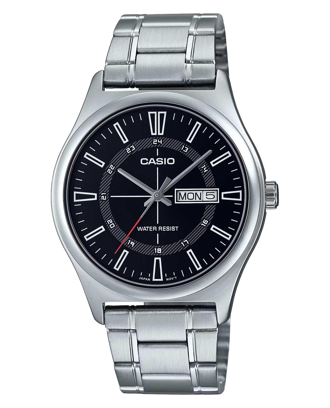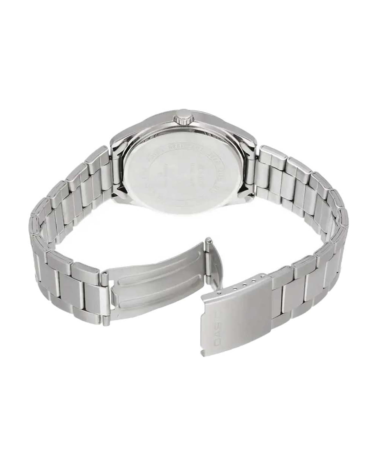 Японские мужские кварцевые часы с минеральным стекломМинеральное стеклоМинеральное стекло представляет собой искусственно выращенный минерал кварца. Такое стекло отличается особой устойчивостью к повреждениям и царапинам. Уступает по некоторым качествам сапфировому стеклу. Casio Collection MTP-V006D-1C, кварцевый механизм с высокой точностью. Корпус и браслет часов изготовлен из нержавеющей стали. Циферблат с метками в виде штрихов. Окошко даты находится в положении 3 часа. Класс водозащиты: 30 метров, позволит защитить корпус от случайных брызг или капель дождя. Стальной браслет на раскладной застёжкеРаскладная застёжкаТакой тип застёжки используется только на браслетах из металла. Она никогда не раскрывается полностью, происходит разделение на 2 и более частей. Раскладывающая застёжка снизит вероятность потери часов к минимуму..