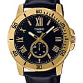 Кварцевый механизм с высокой точностью. Минеральное стеклоМинеральное стеклоМинеральное стекло представляет собой искусственно выращенный минерал кварца. Такое стекло отличается особой устойчивостью к повреждениям и царапинам. Уступает по некоторым качествам сапфировому стеклу. устойчивое к появлению царапин, обладающее высокой прозрачностью. Стрелки с люминесцентным покрытиемЛюминесцентное покрытиеПозволяет считывать показания времени в темноте. Производители наносят на стрелки, часовые индексы, безель или поверхность циферблата светонакопительный состав, дающий холодное свечение.. Класс водозащиты: 20 метров, позволит защитить корпус от случайных брызг или капель дождя. Корпус часов изготовлен из нержавеющей стали с PVD-покрытиемPVDУльтратонкое покрытие наносится в технике вакуумного напыления, сочетает в себе нитрид титана особой прочности со слоем золота или оксида хрома. Несёт в себе декоративную или защитную функцию.. Кожаный ремешок с классической застежкой.