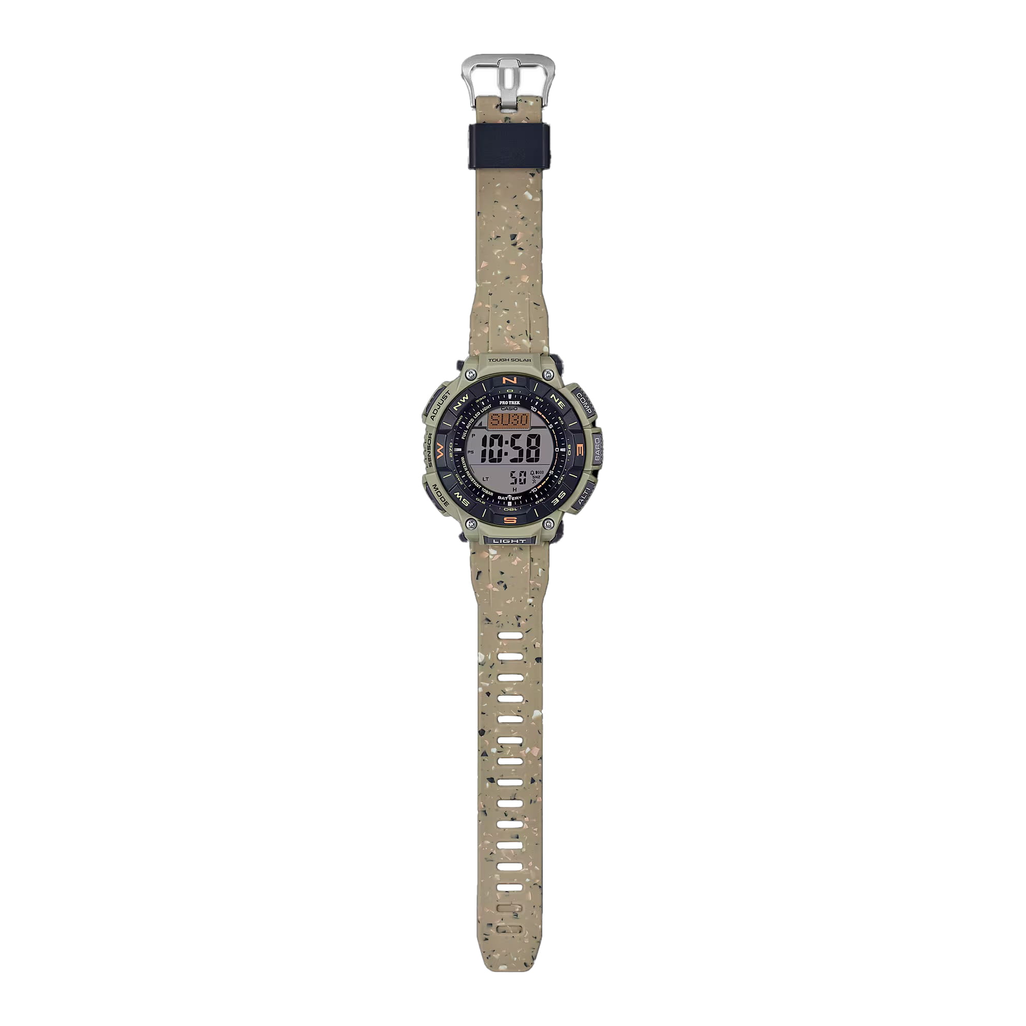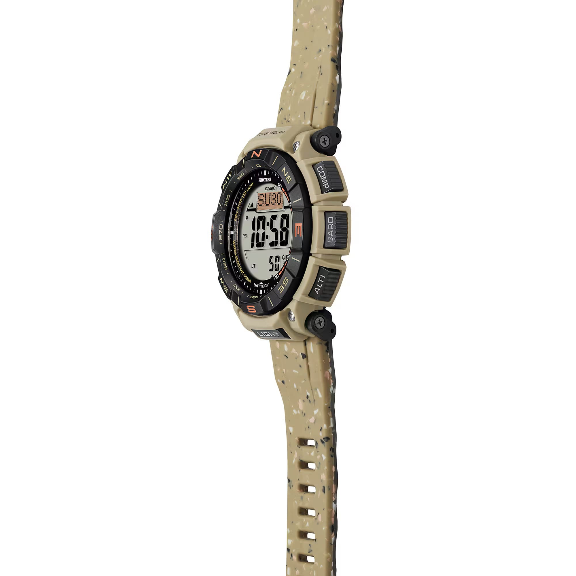 Функциональная модель с красными акцентами обладает расширенными возможностями. Каждое усложнение направляет усилия на то, чтобы ваше путешествие прошло легко и насыщенно. Среди функций компас, барометр, индикатор температуры, мировое времяМировое время Полезное часовое усложнение, отображающее время в основных городах и известных областях по всему миру, оно связано с часовыми поясами, удобно для путешественников и бизнесменов. , график восхода и заката солнца, высотомер, таймер. Японский кварцевый механизм. Технология . Индикатор состояния заряда батареи. Электролюминесцентная подсветкаЭлектролюминесцентная подсветкаЭлектролюминесцентная панель устанавливается под ЖК-экраном часов, при нажатии кнопки электричество преобразуется в свет за счёт подачи напряжения на атомы фосфора, такой тип подсветки позволяет освещать весь циферблат. циферблата. Ударопрочный корпусУдаропрочный корпусМеханизм заключён в корпус, выполненный из современных материалов, устойчивых к ударам, механическим повреждениям и падению с высоты: инновационный пластик, карбон, нержавеющая сталь, титан. и ремешок из полимерного материала. Вращающийся безельБезельВнешний ободок, закрепляющий стекло. В спортивных часах так называется поворотное кольцо с делениями на циферблате, выполняет роль таймера – замеряет отрезки времени на шкале. Неподвижный безель – элемент декора. Однонаправленно вращающийся безель на дайверских часах позволяет фиксировать моменты погружения и выныривания на поверхность.. Минеральное стеклоМинеральное стеклоМинеральное стекло представляет собой искусственно выращенный минерал кварца. Такое стекло отличается особой устойчивостью к повреждениям и царапинам. Уступает по некоторым качествам сапфировому стеклу. устойчивое к появлению царапин, обладающее высокой прозрачностью.. Водостойкость до 10 бар. Устойчивость к температуре ниже -10°C. Габариты: 54,7 x 51,7 x 15,1 мм.