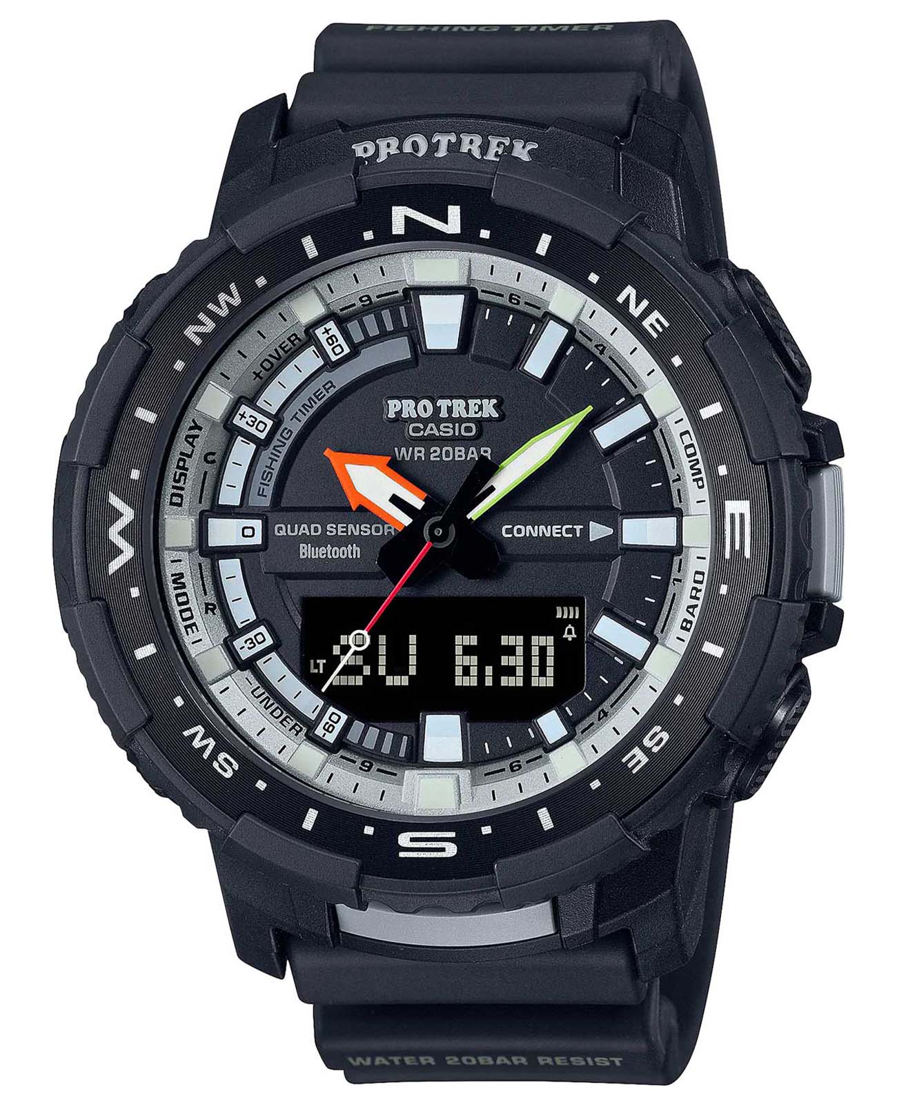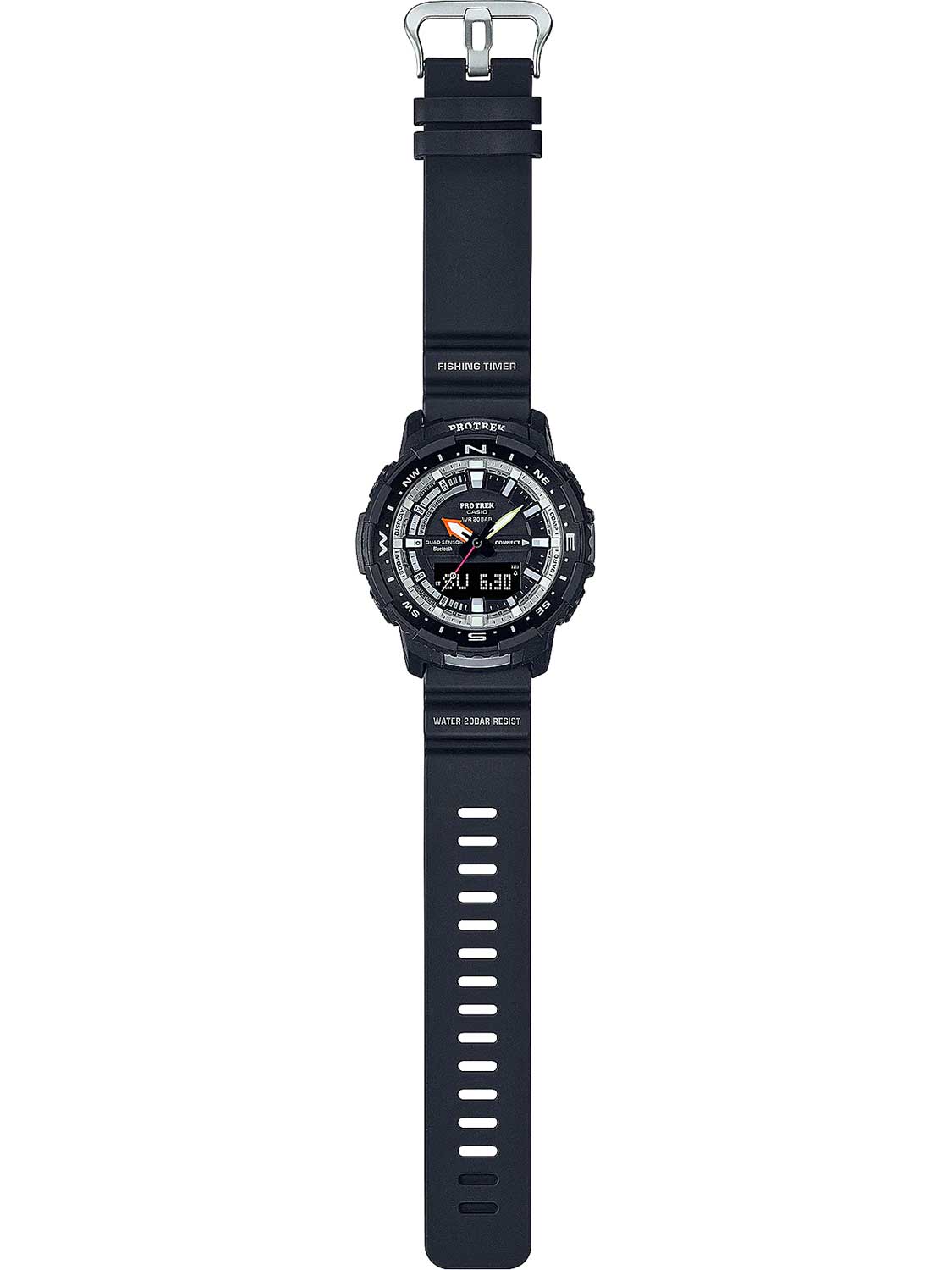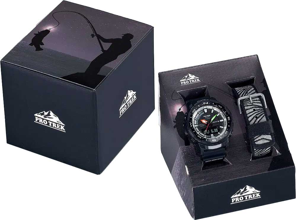 Модель в линейке Pro Trek. Чтобы получить доступ ко всем функциям, специально разработанным для рыбалки, просто синхронизируйте ваши часы по Bluetooth со смартфоном, на котором запущено приложение Pro Trek Connected. Индикатор Fishing Timer определяет время наиболее подходящее для рыбалки. На экране отображаются символы в виде рыбы в том случае, если время идеально подходит для рыбалки. Двойная подсветка: одно нажатие кнопки обеспечит подсветку не только цифрового дисплея, но и аналогового циферблата. Благодаря наличию функции задержки, после отпускания кнопки освещение горит еще несколько секунд. Цвет подсветки: белый. Модуль часов рассчитан на работу при низких температурах до -10°С. При подключении к смартфону часы корректируют текущее время и до 4 раз в день автоматически калибруют данные о высоте, на основе информации полученной через GPS. С помощью приложения можно рассчитать калории, определить местоположение, настроить дисплей получить данные о мировом времени. Встроенный цифровой компас. Время восхода и захода солнца. Технология Quad Sensor позволяет точно и легко определять сторону света, температуру, атмосферное давление и количество шагов. 3-осевой акселерометр автоматически начинает отсчет шагов на дисплее, когда вы начинаете бегать или участвовать в других действиях во время ношения часов. Шагомер измеряет количество шагов от 0 до 999999.