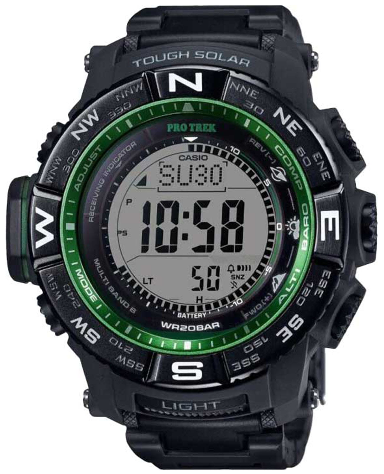 Описание часов Casio Protrek PRW-3510FC-1 - многофункциональные японские мужские наручные часы. Круглый корпус часов выполнен из темного пластика, безель из стали, резиновый браслет. Инверсионный, жидкокристаллический дисплей. Часы оснащены такими дополнительными функциями как cекундомерСекундомерСекундоме́р — прибор, способный измерять интервалы времени с точностью до долей секунды., таймерТаймерОтсчитывает секунды в обратном направлении в заданном интервале времени., высотометр, термометр, компас, альтиметр. Минеральное стеклоМинеральное стеклоМинеральное стекло представляет собой искусственно выращенный минерал кварца. Такое стекло отличается особой устойчивостью к повреждениям и царапинам. Уступает по некоторым качествам сапфировому стеклу. устойчивое к мелким механическим повреждениям. Магнитоустойчивая, ударопрочная модель. Источником энергии служат солнечные батареи Tough SolarTough SolarТехнология основана на подзарядке аккумулятора от источника солнечного света, специальная панель улавливает солнечные лучи и преобразует их в энергию для работы часов. Достаточно пары минут нахождения на солнце для функционирования часов в течении суток.. Синхронизация времени по радиосигналу.