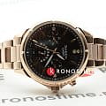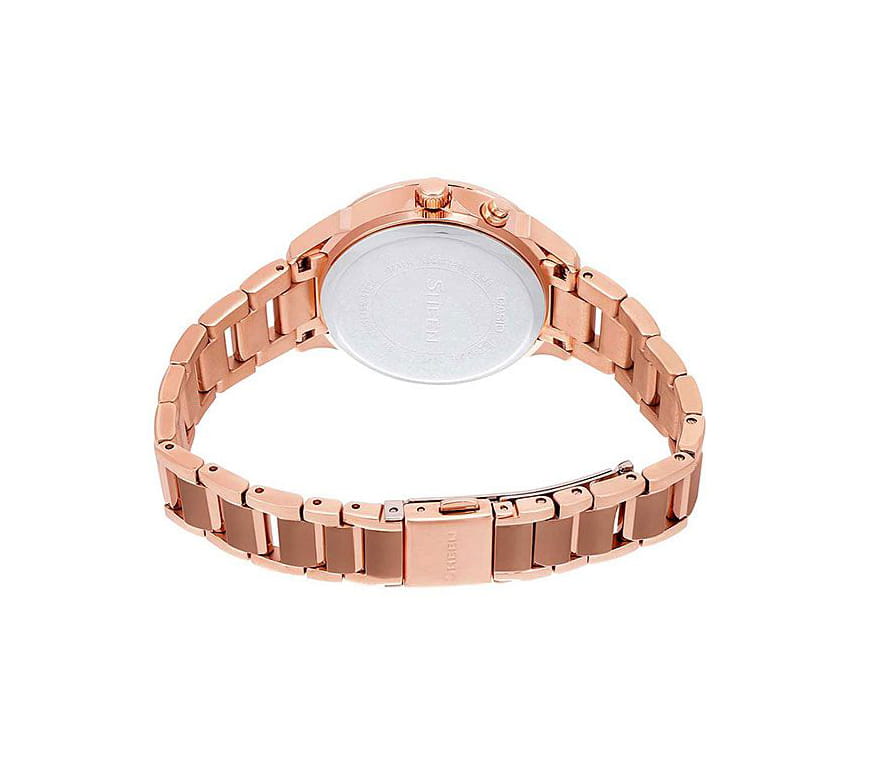 Тёмный циферблат с оригинальным узором идеально смотрится в сочетании с цветом розового золота, такой оттенок был получен благодаря нанесению IP-покрытияIP-покрытиеМетод ионного напыления. Демонстрирует повышенную устойчивость к истиранию, окислению и химическим веществам. Под воздействием высокого давления и температуры около 1500°C молекулы металла надёжно соединяются с частицами корпуса часов.. В качестве декорирующих элементов использованы оригинальные кристаллы Swarovski с роскошным сиянием. Корпус и браслет выполнены из долговечной хирургической стали 316L. Минеральное стекло. Индикация даты и дня недели. Люминесцентная подсветкаЛюминесцентное покрытиеПозволяет считывать показания времени в темноте. Производители наносят на стрелки, часовые индексы, безель или поверхность циферблата светонакопительный состав, дающий холодное свечение.. Водозащита до 50 метров. Габариты: 41,4 x 45,3 x 11,2 мм.