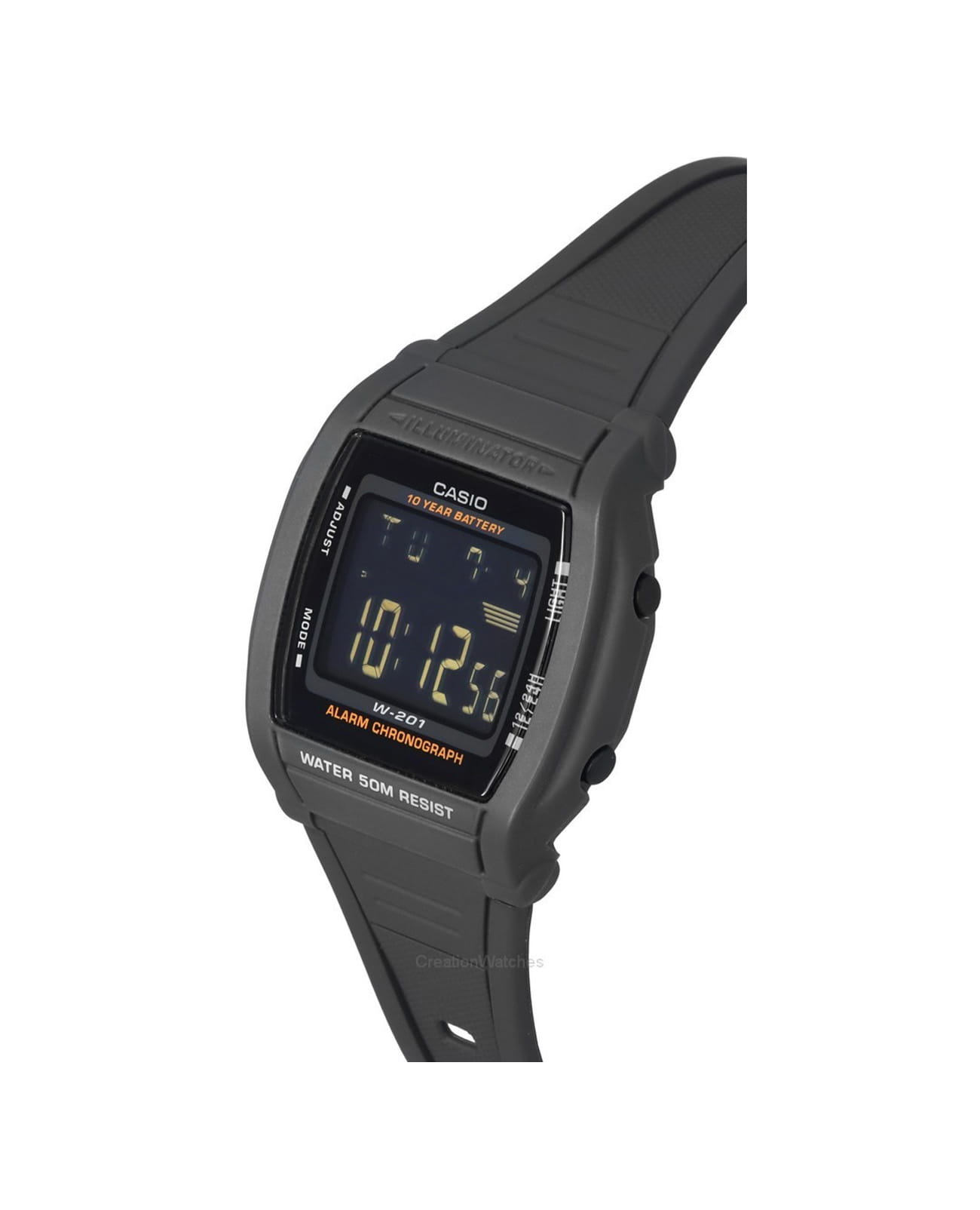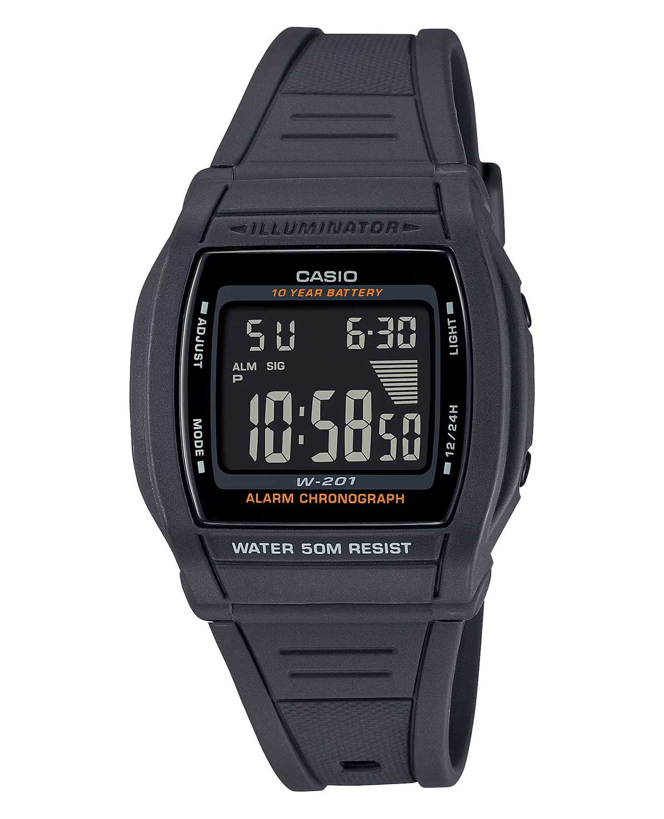 Спортивные японские мужские часы-хронографХронографФункция позволяет измерять отрезки времени с особой точностью: часы, минуты, секунды. Верным признаком хронографа является наличие на циферблате 3 дополнительных окошек-счётчиков. Casio Collection W-201-1BVEG, кварцевый механизм с высокой точностью, органическое стекло. Корпус часов изготовлен из стали и пластика. Светодиодная подсветкаСветодиодная подсветкаСветодиодная или LED-подсветка обеспечивает появление яркого холодного свечения за счёт LED-элементов - маленьких лампочек. Они потребляют минимальное количество энергии, чаще всего можно встретить 1 светодиод, в нижней части циферблата. освещает весь циферблат. Цвет подсветки: оранжевый. 12-ти и 24-х часовой формат времени. Второй часовой пояс. СекундомерСекундомерСекундоме́р — прибор, способный измерять интервалы времени с точностью до долей секунды. с точностью показаний 1/100с и временем измерения 1ч. Сплит-хронографСплит-хронографИспользуется для измерения продолжительности нескольких временных отрезков, начинающихся одновременно, а заканчивающихся в разное время.. Батарейка рассчитана на 10 лет. БудильникБудильникБуди́льник — часы, в заданный момент времени подающие звуковой, световой и/или в редких случаях другой сигнал., ежечасный сигнал. Класс водозащиты: 50 метров, позволит защитить корпус от случайных брызг или капель дождя. Ремешок из полимерного материала на стандартной застежке.