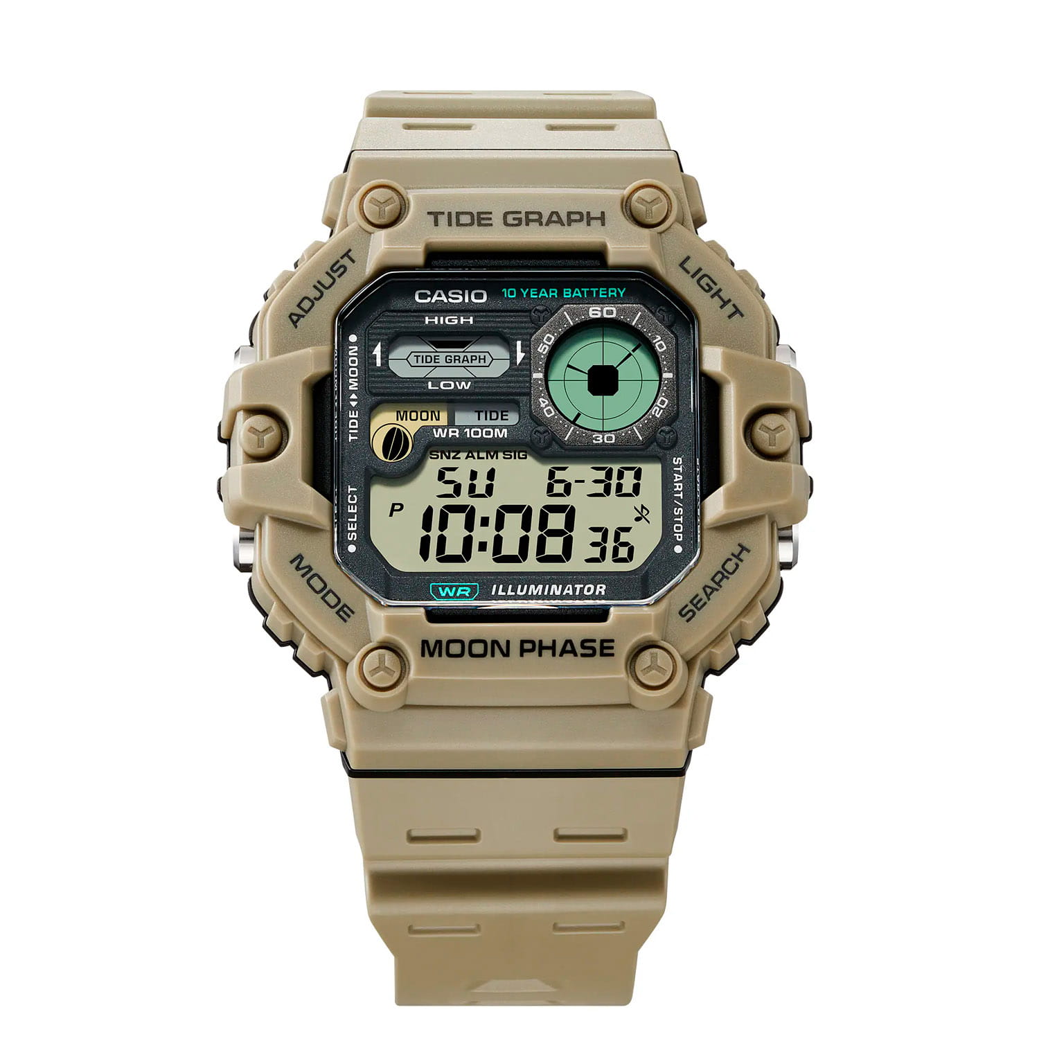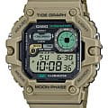 Многофункциональные часы Casio WS-1700H-5A с секундомеромСекундомерСекундоме́р — прибор, способный измерять интервалы времени с точностью до долей секунды. и таймеромТаймерОтсчитывает секунды в обратном направлении в заданном интервале времени. отлично подойдут для занятий спортом. Часы выдерживают давление до 10 АТМ и имеют впечатляющий срок службы батареи — около 10 лет. Используется батарея CR2025. Кварцевый механизм с высокой точностью. Модель оснащена двойным временем, секундомером с точностью до 1/100 секунды, таймером и мульти-будильником. Органическое стекло. Класс водозащиты: 100 метров, позволит плавать, нырять и заниматься другими водными видами спорта. Корпус из пластика. На ЖК-экране отображаются не только время и дата, но и дополнительная информация, такая как график приливов и отливов, данные о фазах Луны и аналоговое время. Добавлена светодиодная подсветкаСветодиодная подсветкаСветодиодная или LED-подсветка обеспечивает появление яркого холодного свечения за счёт LED-элементов - маленьких лампочек. Они потребляют минимальное количество энергии, чаще всего можно встретить 1 светодиод, в нижней части циферблата. янтарного цвета для улучшения видимости в темноте. Силикованный ремень с классической застежкой.