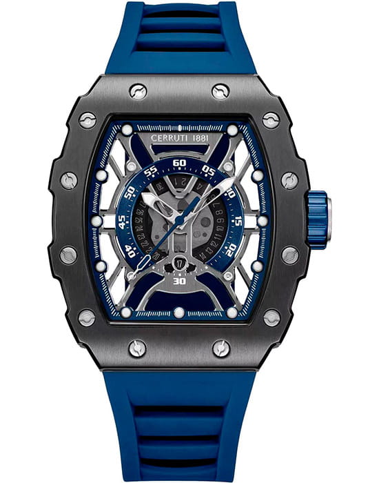 Cerruti 1881 CIWGN0057702 — эффектные мужские часы с дерзким современным дизайном, в которых сочетаются геометрическая точность линий и выразительная динамика формы. Корпус из нержавеющей стали с матовым PVD-покрытиемPVDУльтратонкое покрытие наносится в технике вакуумного напыления, сочетает в себе нитрид титана особой прочности со слоем золота или оксида хрома. Несёт в себе декоративную или защитную функцию. и мощным шестигранным безелемБезельВнешний ободок, закрепляющий стекло. В спортивных часах так называется поворотное кольцо с делениями на циферблате, выполняет роль таймера – замеряет отрезки времени на шкале. Неподвижный безель – элемент декора. Однонаправленно вращающийся безель на дайверских часах позволяет фиксировать моменты погружения и выныривания на поверхность. подчёркивает технический характер модели. Полупрозрачный скелетонизированный циферблат открывает детали механизма, придавая часам индустриальный и технологичный облик. Контрастные стрелки и метки с люминесцентным покрытиемЛюминесцентное покрытиеПозволяет считывать показания времени в темноте. Производители наносят на стрелки, часовые индексы, безель или поверхность циферблата светонакопительный состав, дающий холодное свечение. обеспечивают отличную читаемость, а прочное минеральное стеклоМинеральное стеклоМинеральное стекло представляет собой искусственно выращенный минерал кварца. Такое стекло отличается особой устойчивостью к повреждениям и царапинам. Уступает по некоторым качествам сапфировому стеклу. защищает композицию от внешних воздействий. Эластичный силиконовый ремешок насыщенного синего цвета гармонично сочетается с оттенками корпуса и обеспечивает комфорт при ежедневном ношении. Cerruti 1881 — это смелое воплощение итальянского стиля в спортивно-индустриальной эстетике, созданное для мужчин, уверенно идущих в ногу с временем.