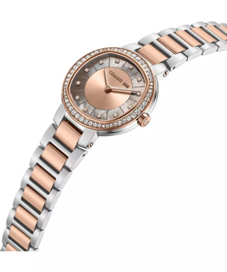 Женские кварцевые часы Cerruti 1881 Bellegra CIWLG0086503 — утончённая французская элегантность с перламутровым сиянием. Корпус из нержавеющей стали 316L. БезельБезельВнешний ободок, закрепляющий стекло. В спортивных часах так называется поворотное кольцо с делениями на циферблате, выполняет роль таймера – замеряет отрезки времени на шкале. Неподвижный безель – элемент декора. Однонаправленно вращающийся безель на дайверских часах позволяет фиксировать моменты погружения и выныривания на поверхность. с PVD-покрытиемPVDУльтратонкое покрытие наносится в технике вакуумного напыления, сочетает в себе нитрид титана особой прочности со слоем золота или оксида хрома. Несёт в себе декоративную или защитную функцию. золотистого цвета, диаметром 32 мм. Циферблат — золотой перламутровый с тиснением и точечными метками, инкрустированными кристаллами. Стекло — минеральноеМинеральное стеклоМинеральное стекло представляет собой искусственно выращенный минерал кварца. Такое стекло отличается особой устойчивостью к повреждениям и царапинам. Уступает по некоторым качествам сапфировому стеклу. с сапфировым покрытием. Браслет — стальной с PVD-покрытиемPVDУльтратонкое покрытие наносится в технике вакуумного напыления, сочетает в себе нитрид титана особой прочности со слоем золота или оксида хрома. Несёт в себе декоративную или защитную функцию. на застёжке «бабочка» с кнопкамиЗастёжка "бабочка"Такой вид застёжки дополняется предохранителями, помогающими избежать случайного раскрытия браслета. Обладают изящным исполнением. . Водонепроницаемость 50 м. Идеальный выбор для тех, кто ценит французский дизайн и изысканную женственность.