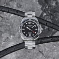 Это превосходная модель в серебристо-чёрной расцветке для тех, кто не готов соглашаться на меньшее. Наручные часы отличаются безупречными характеристиками по всем параметрам: ударопрочный корпусУдаропрочный корпусМеханизм заключён в корпус, выполненный из современных материалов, устойчивых к ударам, механическим повреждениям и падению с высоты: инновационный пластик, карбон, нержавеющая сталь, титан. из хирургической стали 316L, устойчивое к царапинам сапфировое стекло с антибликовой поверхностью, водостойкость до 30 бар, повышенная точность хода кварцевого швейцарского калибра ETA F07.412 Precidrive™Precidrive™Инновационный кварцевый механизм Certina. Часы, оснащённые этим швейцарским калибром, приравниваются к точности к сертифицированным хронометрам, точность хода составляет +/-10 секунд в год., подтверждённая сертификатом COSCСертификат COSCОфициальный сертификат, подтверждающий то, что часы ходят с особо высокой точностью. Для получения документа часы подвергаются тестовым испытаниям, разработанным швейцарским институтом тестирования хронометров COSC. Допустимая норма для механических часов -4/+6 секунд в день, для кварцевых моделей +/- 0,07 секунд в день.. Алюминиевый вращающийся безельБезельВнешний ободок, закрепляющий стекло. В спортивных часах так называется поворотное кольцо с делениями на циферблате, выполняет роль таймера – замеряет отрезки времени на шкале. Неподвижный безель – элемент декора. Однонаправленно вращающийся безель на дайверских часах позволяет фиксировать моменты погружения и выныривания на поверхность.. Закручивающиеся кнопки, заводная головка с системой защиты, задняя крышка. Индикатор EOLEOLПредставляет собой систему, уведомляющую владельца часов о необходимости замены элемента питания. За 2 недели до полного разряда батарейки секундная стрелка перестаёт ходить чётко и начинает перепрыгивать на 3-4 деления.. Апертура даты. Застёжка с фиксатором и удлинением для дайверовУдлинение для дайверовЗастёжка с удлинением для дайверов представляет собой безопасное крепление, которое позволяет надевать часы поверх гидрокостюма. Гибкая застёжка удлиняется на 1-2 миллиметра.. Диаметр корпуса: 43 мм.