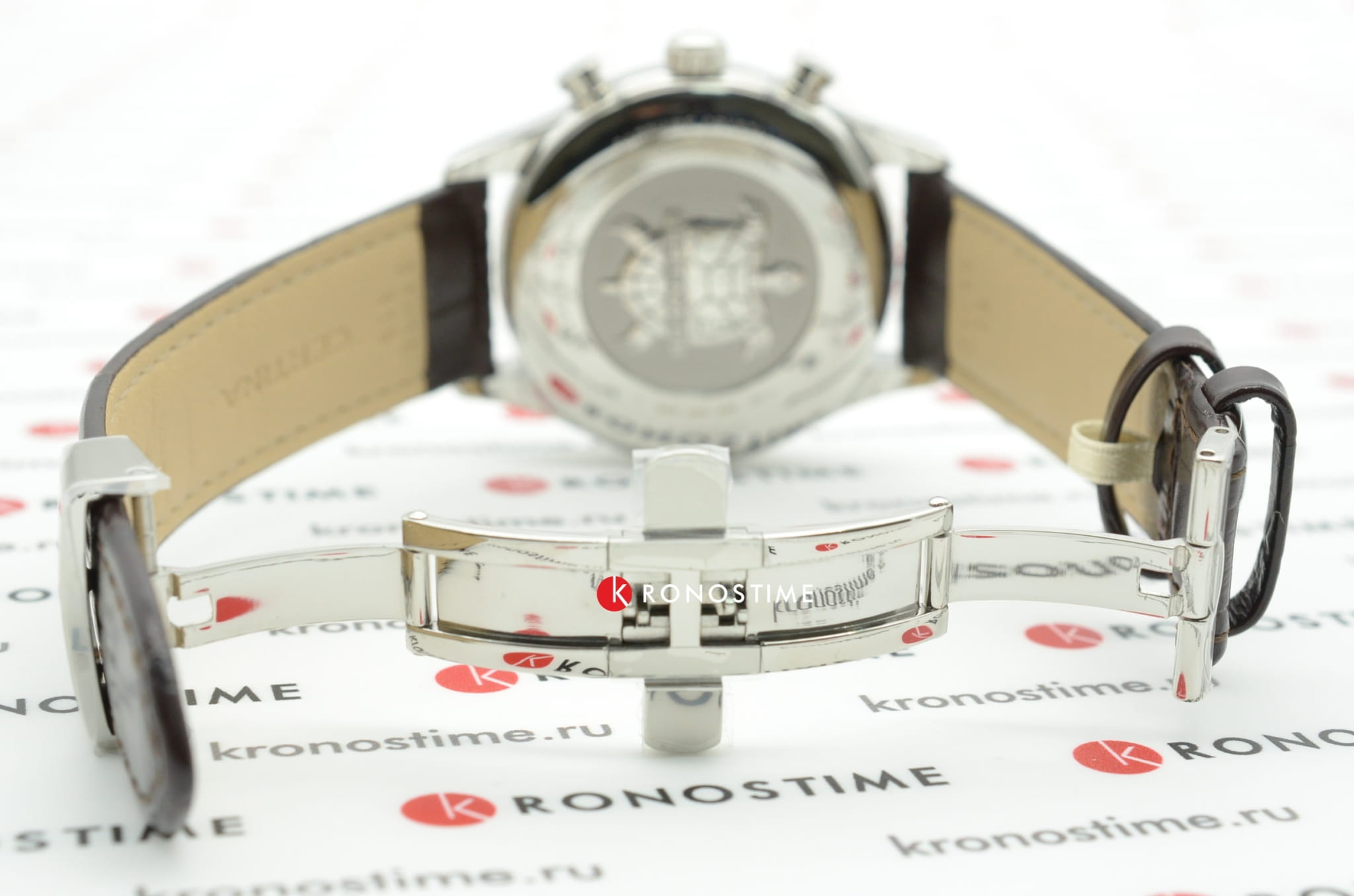 Модель, благодаря классической цветовой гамме и отсутствию броских деталей, станет универсальным аксессуаром к вашему образу. Брендовый хронографХронографФункция позволяет измерять отрезки времени с особой точностью: часы, минуты, секунды. Верным признаком хронографа является наличие на циферблате 3 дополнительных окошек-счётчиков. измеряет время с высокой точностью, что обеспечивает швейцарский кварцевый калибр ETA G10.962 Precidrive™Precidrive™Инновационный кварцевый механизм Certina. Часы, оснащённые этим швейцарским калибром, приравниваются к точности к сертифицированным хронометрам, точность хода составляет +/-10 секунд в год.. Коричневый ремешок из натуральной кожи. Сапфировое стекло с двухсторонним антибликовым покрытием. Корпус из нержавеющей стали 316L. Водостойкость 10 бар. Люминесцентная подсветкаЛюминесцентное покрытиеПозволяет считывать показания времени в темноте. Производители наносят на стрелки, часовые индексы, безель или поверхность циферблата светонакопительный состав, дающий холодное свечение.. Задняя крышка с гравировкой. Секундомер, дата, индикатор EOLEOLПредставляет собой систему, уведомляющую владельца часов о необходимости замены элемента питания. За 2 недели до полного разряда батарейки секундная стрелка перестаёт ходить чётко и начинает перепрыгивать на 3-4 деления., отображение лунных фаз. Диаметр корпуса: 41 мм.