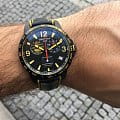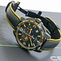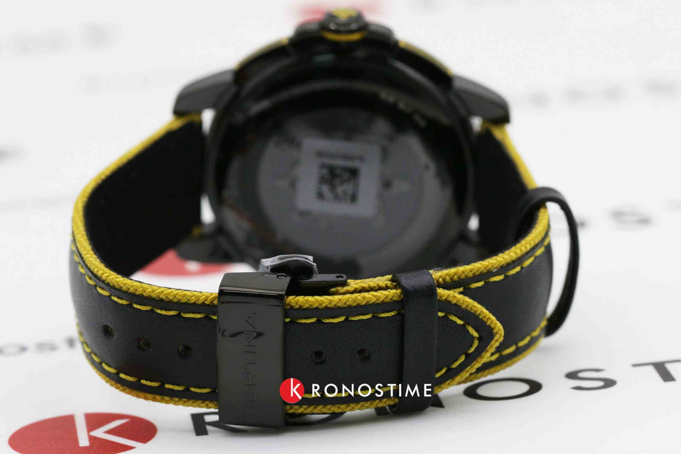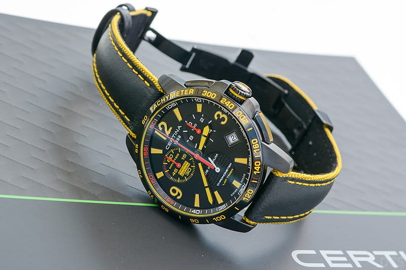 Наручные часы в спортивном стиле дополнены красными и жёлтыми деталями, что символизирует скоростное напряжение на гоночной трассе. Отличным дополнением стал кожаный ремешок. Кварцевый швейцарский механизм ETA G10.212 Precidrive™Precidrive™Инновационный кварцевый механизм Certina. Часы, оснащённые этим швейцарским калибром, приравниваются к точности к сертифицированным хронометрам, точность хода составляет +/-10 секунд в год. с повышенной точностью хода, подтверждённой сертификатом COSCСертификат COSCОфициальный сертификат, подтверждающий то, что часы ходят с особо высокой точностью. Для получения документа часы подвергаются тестовым испытаниям, разработанным швейцарским институтом тестирования хронометров COSC. Допустимая норма для механических часов -4/+6 секунд в день, для кварцевых моделей +/- 0,07 секунд в день.. Система DS ConceptDS ConceptDouble Security Concept, обозначает двойную надёжность и безупречную точность часов Certina. Двойная система защиты подразумевает обеспечение максимальной устойчивости к ударам и высоких показателей водонепроницаемости.. Двухстороннее антибликовое покрытие для стекла из сапфира. Корпус из нержавеющей стали с PVD-покрытиемPVDУльтратонкое покрытие наносится в технике вакуумного напыления, сочетает в себе нитрид титана особой прочности со слоем золота или оксида хрома. Несёт в себе декоративную или защитную функцию.. Стрелки и индексы с составом SuperLumiNovaЛюминесцентное покрытиеПозволяет считывать показания времени в темноте. Производители наносят на стрелки, часовые индексы, безель или поверхность циферблата светонакопительный состав, дающий холодное свечение.. Заводная головка с защитой. ХронографХронографФункция позволяет измерять отрезки времени с особой точностью: часы, минуты, секунды. Верным признаком хронографа является наличие на циферблате 3 дополнительных окошек-счётчиков., шкала тахиметраТахиметрРазмеченная шкала, располагается на ободке или безеле часов. Тахиметр позволяет рассчитать скорость на определённом участке пути, расстояние измеряется в километрах или милях., календарь, секундомер, индикатор EOLEOLПредставляет собой систему, уведомляющую владельца часов о необходимости замены элемента питания. За 2 недели до полного разряда батарейки секундная стрелка перестаёт ходить чётко и начинает перепрыгивать на 3-4 деления., Lap-функция измерения промежуточного времени (круга). Диаметр корпуса: 41 мм.