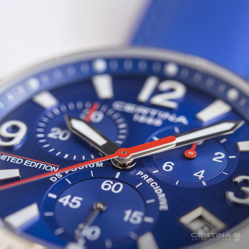 Новые пронумерованные модели DS Podium Chronograph 1/10sec Wilvo Limited Edition доступны в количестве 450 экземпляров Некоторые из моделей уже забронированы – и не без оснований: помимо менеджера команды Луиса Востерса эксклюзивные модели часов из рук президента Certina Адриана Боссара в Фрауэнфельде получат гонщики Wilvo Джереми Сивер, Шон Симпсон и Арно Тонус Разумеется, номера часов будут соответствовать номерам гонщиков: Джереми получит модель номер 91, Шон – 24 и Арно – номер 4 Новые модели переливаются синими бликами в официальном оттенке команды Wilvo Yamaha Official MXGP, дополненном красными стрелками хронографа Корпус из нержавеющей стали диаметром 41 мм скрывает ультрасовременный кварцевый часовой механизм Precidrive™, позволяющий отсчитывать десятые доли секунды в режиме реального времени Динамичное зрелище – как раз в духе MXGP!