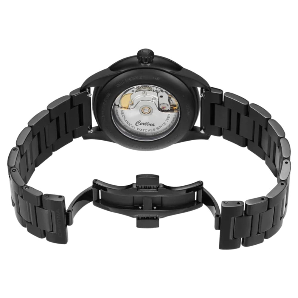 Мужские механические часы Certina C029.426.33.051.00 — это воплощение швейцарского мастерства и современной надёжности. Модель выполнена из нержавеющей стали с PVD-покрытиемPVDУльтратонкое покрытие наносится в технике вакуумного напыления, сочетает в себе нитрид титана особой прочности со слоем золота или оксида хрома. Несёт в себе декоративную или защитную функцию., что придаёт ей устойчивость к царапинам и элегантный внешний вид. Корпус диаметром 41 мм имеет толщину 11 мм, а циферблат чёрного цвета дополнен крупным окошком даты, обеспечивающим удобство считывания информации. Защиту механизма обеспечивает сапфировое стеклоСапфировое стеклоПрочный и надёжный материал из кристалла сапфира синтетического происхождения, характеризующийся особой твёрдостью и устойчивостью к царапинам и повреждениям. с антибликовым покрытием, устойчивое к повреждениям и обеспечивающее чёткую видимость показаний. Часы обладают водонепроницаемостью , что позволяет использовать их при плавании и других водных активностях. Механизм Powermatic 80Powermatic 80Эксклюзивный калибр от швейцарской компании ETA с увеличенным запасом хода до 80 часов за счёт удлинённой заводной пружины. Характеризуется улучшенной системой спуска со сниженным трением. гарантирует запас хода до 80 часов и повышенную точность. Защита от ударов и вибраций реализована благодаря технологии DS (Double Security)Ударопрочный корпусМеханизм заключён в корпус, выполненный из современных материалов, устойчивых к ударам, механическим повреждениям и падению с высоты: инновационный пластик, карбон, нержавеющая сталь, титан., что делает модель особенно надёжной в условиях активной эксплуатации. Эти часы станут универсальным аксессуаром для тех, кто ценит сочетание классического дизайна, швейцарского качества и функциональности — идеальный выбор для повседневной носки и торжественных случаев.