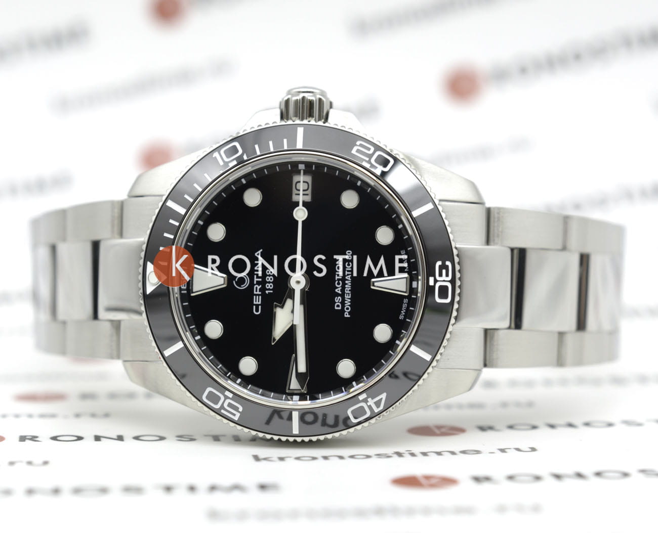 Certina DS Action Lady C032.007.11.051.00 – женские часы для поклонников ярких аксессуаров. И корпус, и браслет изготовлены из высококачественной нержавеющей стали 316L. Под твердым сапфировым стекломСапфировое стеклоПрочный и надёжный материал из кристалла сапфира синтетического происхождения, характеризующийся особой твёрдостью и устойчивостью к царапинам и повреждениям. с антибликовым покрытиемАнтибликовое покрытиеСлой оксида металла в 0,13-0,3 микрон, благодаря которому стекло часов не бликует и не отражает свет. Антибликовое покрытие уменьшает отражение света в 10 раз, обеспечивая отличную читаемость показателей циферблата. находится черный циферблат, на котором вы найдете окошко даты в положении 3 часа и маркировку, покрытую люминесцентным покрытиемЛюминесцентное покрытиеПозволяет считывать показания времени в темноте. Производители наносят на стрелки, часовые индексы, безель или поверхность циферблата светонакопительный состав, дающий холодное свечение. Super-LumiNova. Керамический безельБезельВнешний ободок, закрепляющий стекло. В спортивных часах так называется поворотное кольцо с делениями на циферблате, выполняет роль таймера – замеряет отрезки времени на шкале. Неподвижный безель – элемент декора. Однонаправленно вращающийся безель на дайверских часах позволяет фиксировать моменты погружения и выныривания на поверхность. с минутной шкалой вращается в одном направлении, что позволяет удобно измерять временные отрезки. Все это приводится в действие автоматическим механизмом Powermatic 80Powermatic 80Эксклюзивный калибр от швейцарской компании ETA с увеличенным запасом хода до 80 часов за счёт удлинённой заводной пружины. Характеризуется улучшенной системой спуска со сниженным трением..611 с пружиной Nivachron™Nivachron™Специально разработанный инновационный сплав Nivachron™ повышает устойчивость часов к воздействию магнитных полей.. Класс водозащиты: 300 метров, позволит плавать, нырять и заниматься другими водными видами спорта. Стальной браслет на застёжке-бабочке с кнопкамиЗастёжка "бабочка"Такой вид застёжки дополняется предохранителями, помогающими избежать случайного раскрытия браслета. Обладают изящным исполнением. .