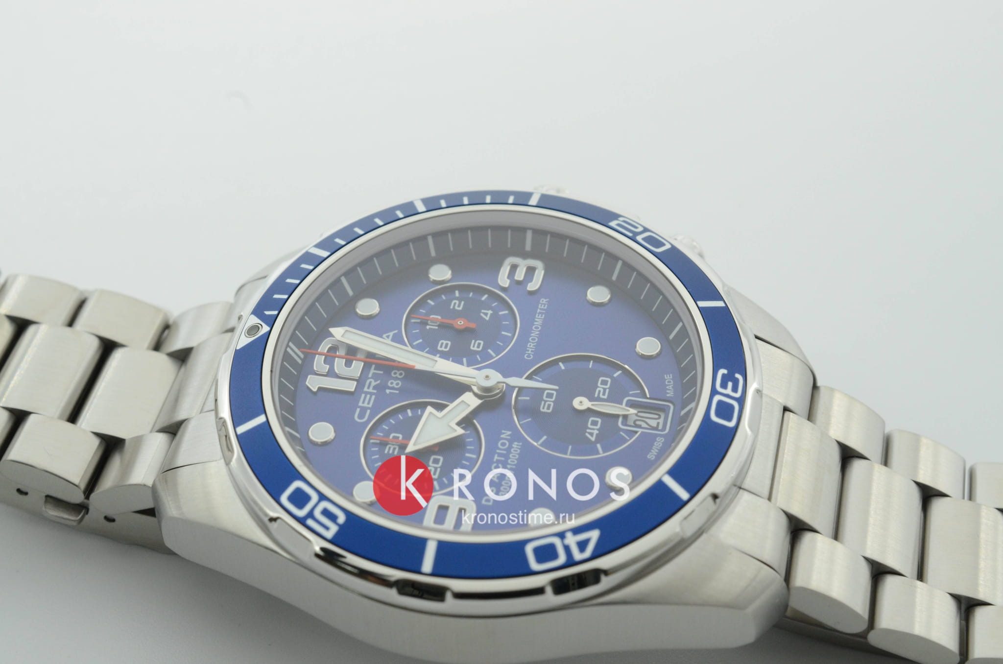 Дайверский хронографХронографФункция позволяет измерять отрезки времени с особой точностью: часы, минуты, секунды. Верным признаком хронографа является наличие на циферблате 3 дополнительных окошек-счётчиков. в сине-серебристом исполнении станет идеальным завершением делового, повседневного образа. Аксессуар дополнен безелемБезельВнешний ободок, закрепляющий стекло. В спортивных часах так называется поворотное кольцо с делениями на циферблате, выполняет роль таймера – замеряет отрезки времени на шкале. Неподвижный безель – элемент декора. Однонаправленно вращающийся безель на дайверских часах позволяет фиксировать моменты погружения и выныривания на поверхность. из анодированного алюминия, что облегчает конструкцию часов. Модель сделана из хирургической стали 316L, востребованной благодаря прочности и устойчивости к коррозии. Точность хода швейцарского автоматического механизма G10.212 AA PRECIDRIVEприравнивается к хронометрической, что подтверждено сертификатом COSCСертификат COSCОфициальный сертификат, подтверждающий то, что часы ходят с особо высокой точностью. Для получения документа часы подвергаются тестовым испытаниям, разработанным швейцарским институтом тестирования хронометров COSC. Допустимая норма для механических часов -4/+6 секунд в день, для кварцевых моделей +/- 0,07 секунд в день.. Улучшению читаемости показателей в солнечные дни способствует антибликовое покрытие сапфирового стекла. Максимальная водостойкость 300 метров. Концепция DSDS ConceptDouble Security Concept, обозначает двойную надёжность и безупречную точность часов Certina. Двойная система защиты подразумевает обеспечение максимальной устойчивости к ударам и высоких показателей водонепроницаемости.. Люминесцентная подсветкаЛюминесцентное покрытиеПозволяет считывать показания времени в темноте. Производители наносят на стрелки, часовые индексы, безель или поверхность циферблата светонакопительный состав, дающий холодное свечение.. Секундомер, отображение даты. Диаметр корпуса: 43 мм.