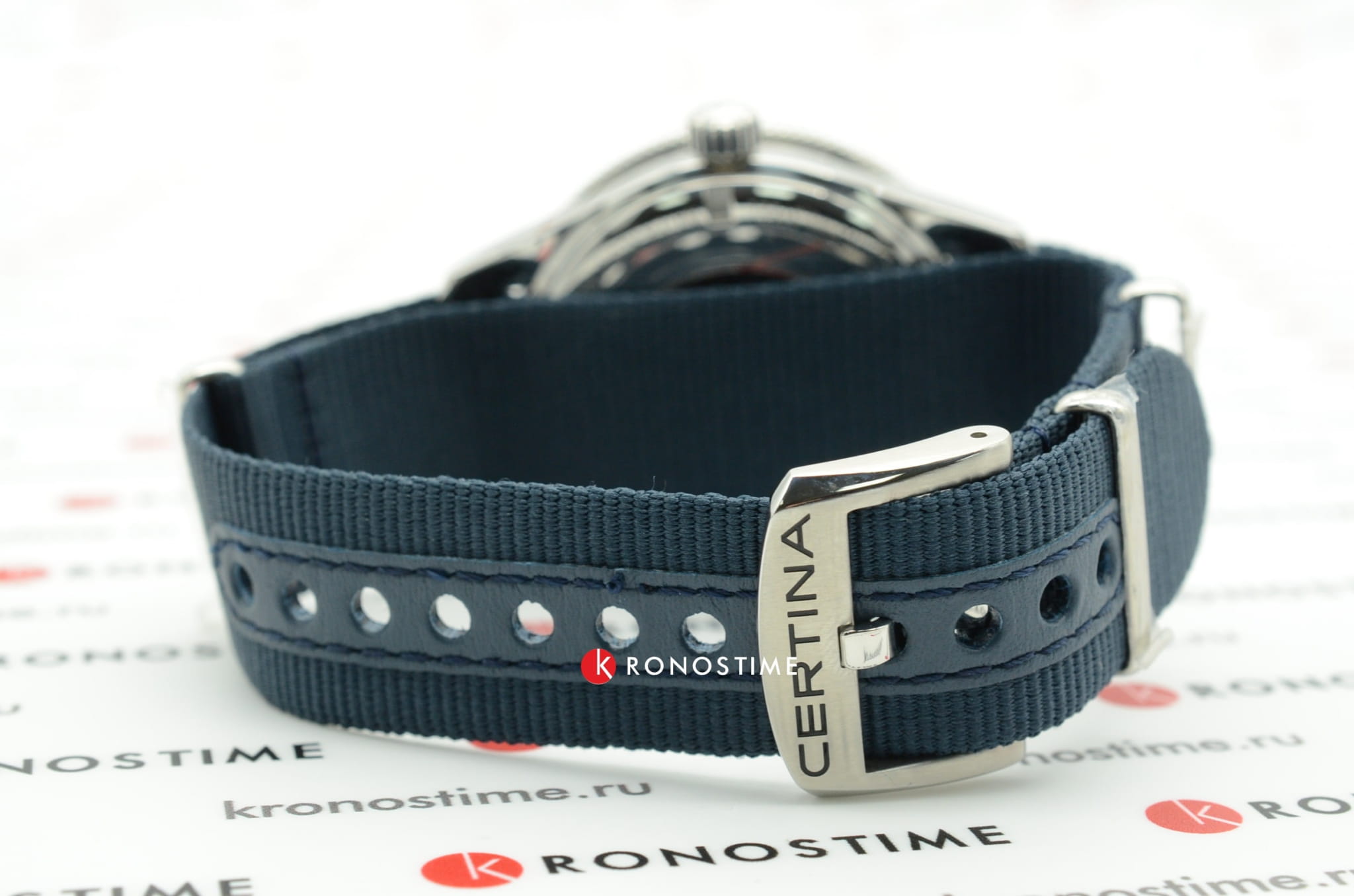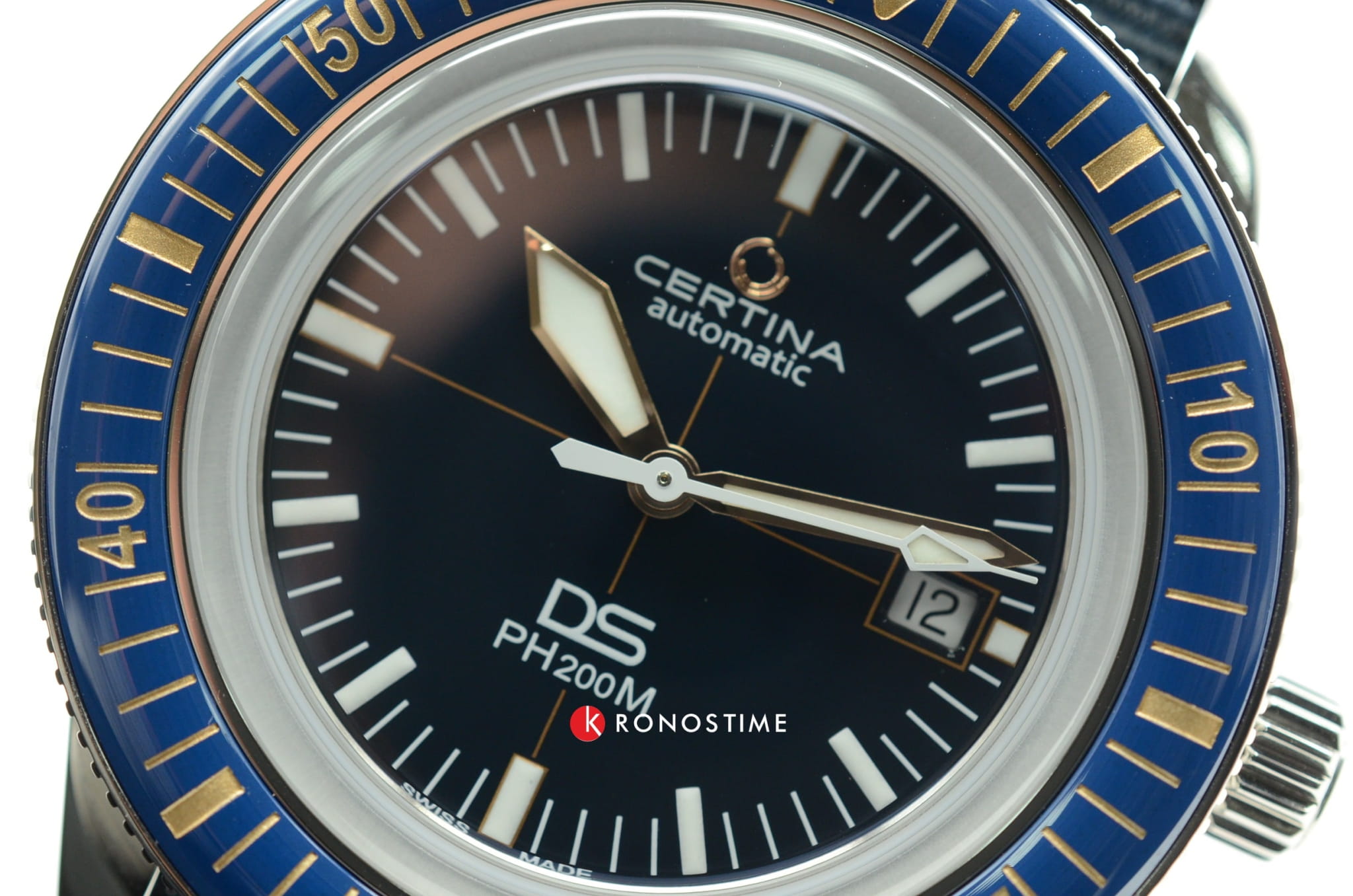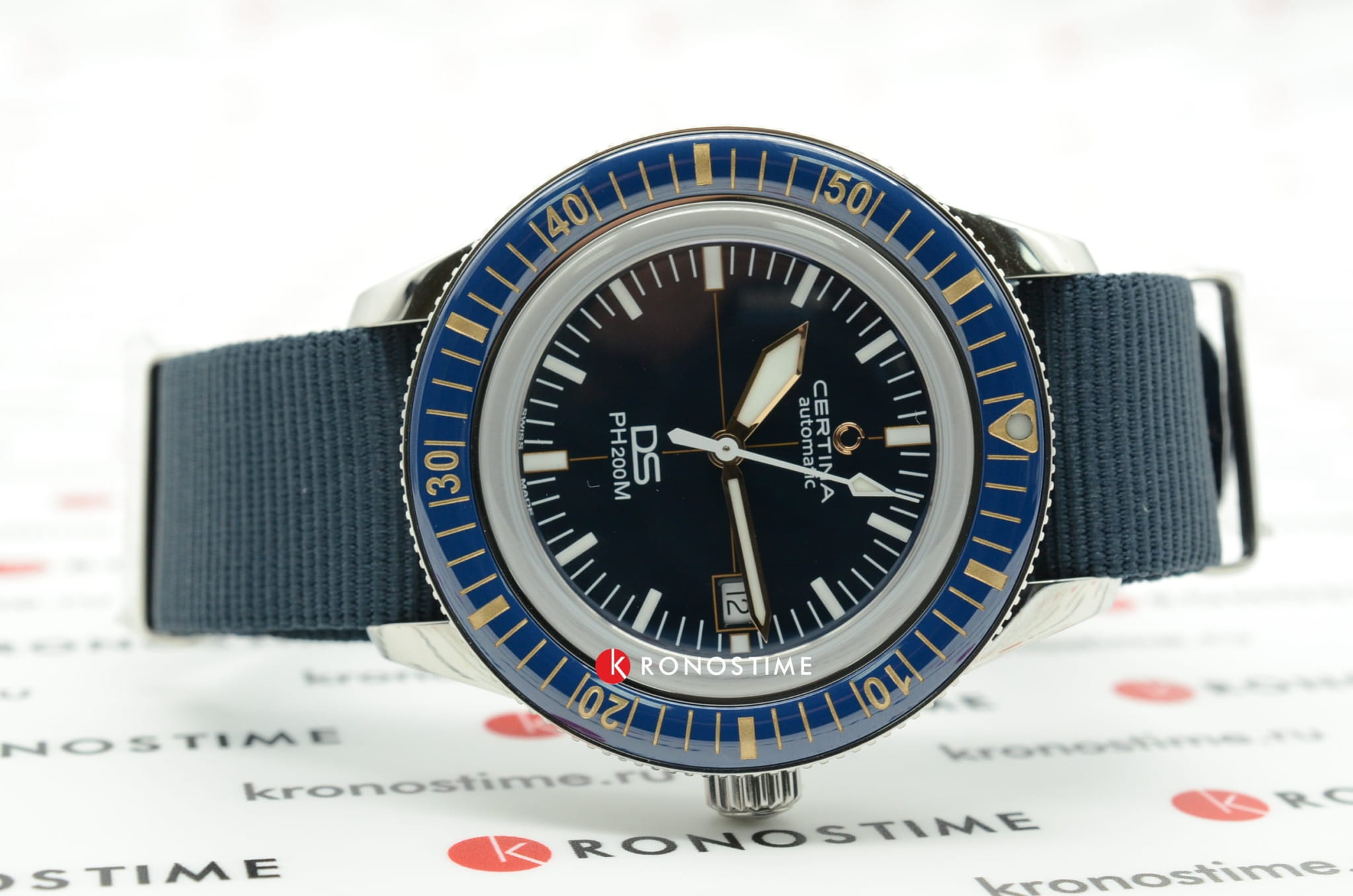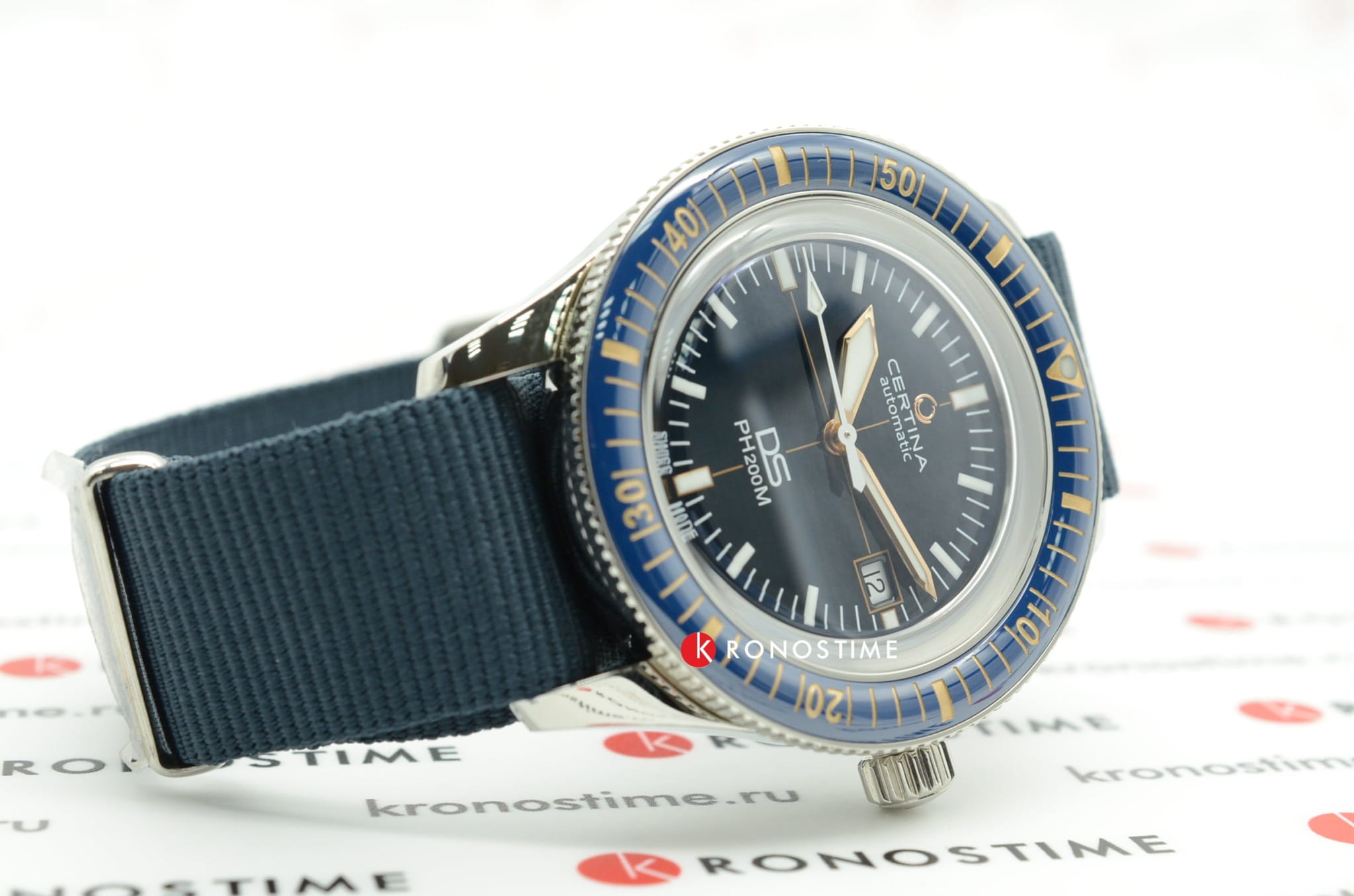 Оригинальный циферблат понравится ценителям ретро-дизайна. Уникальностью обладает не только аксессуар, но и упаковка, сделанная в виде бокса для дайвинга. Часы комплектуются автоматическим механизмом ETA Powermatic 80Powermatic 80Эксклюзивный калибр от швейцарской компании ETA с увеличенным запасом хода до 80 часов за счёт удлинённой заводной пружины. Характеризуется улучшенной системой спуска со сниженным трением. с 80-часовым запасом хода. Технология DS ConceptDS ConceptDouble Security Concept, обозначает двойную надёжность и безупречную точность часов Certina. Двойная система защиты подразумевает обеспечение максимальной устойчивости к ударам и высоких показателей водонепроницаемости.. Стекло с покрытием Nex scratchguard, устойчивым к царапинам. Вращающийся безельБезельВнешний ободок, закрепляющий стекло. В спортивных часах так называется поворотное кольцо с делениями на циферблате, выполняет роль таймера – замеряет отрезки времени на шкале. Неподвижный безель – элемент декора. Однонаправленно вращающийся безель на дайверских часах позволяет фиксировать моменты погружения и выныривания на поверхность.. Диаметр корпуса: 42,8 мм.