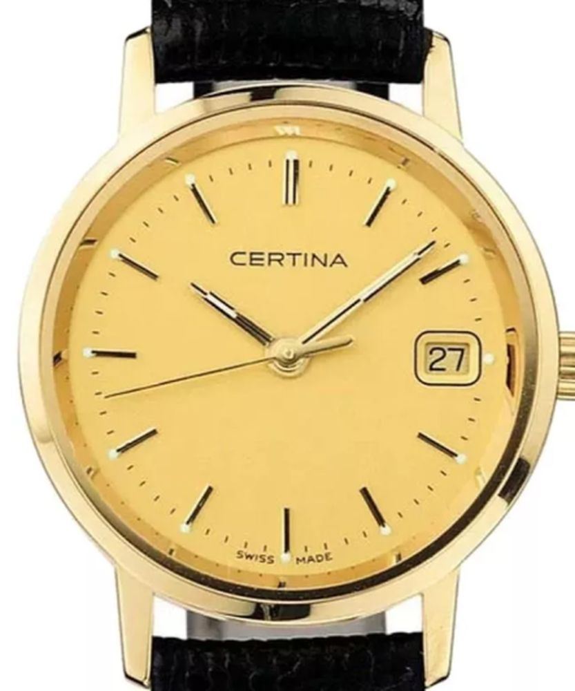 Женские швейцарские часы Certina PRISKA GOLD C158.9289.68.31. Золотой циферблат соединен с корпусом из 18-каратного желтого золота. Идеальным дополнением станет черный ремешок из натуральной кожи. За точное измерение времени отвечает швейцарский кварцевый механизм ETA 256.111 с аккумулятором EOL. Инновационная прокладка из биоматериала обеспечивает идеальное уплотнение. Наряду с часовой, минутной и секундной стрелками часы имеют окошко даты на отметке «3 часа». Водозащита 30 метров, позволит защитить корпус от случайных брызг или капель дождя. Сапфировое стеклоСапфировое стеклоПрочный и надёжный материал из кристалла сапфира синтетического происхождения, характеризующийся особой твёрдостью и устойчивостью к царапинам и повреждениям. устойчивое к появлению царапин, обладающее высокой прозрачностью. Браслет из натуральной кожи сочетает в себе стиль и долговечность. Стрелки с люминесцентным покрытиемЛюминесцентное покрытиеПозволяет считывать показания времени в темноте. Производители наносят на стрелки, часовые индексы, безель или поверхность циферблата светонакопительный состав, дающий холодное свечение..