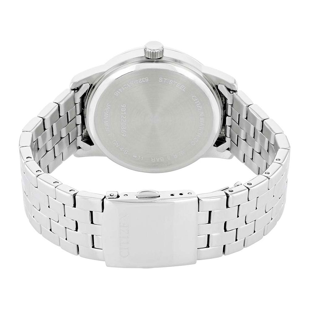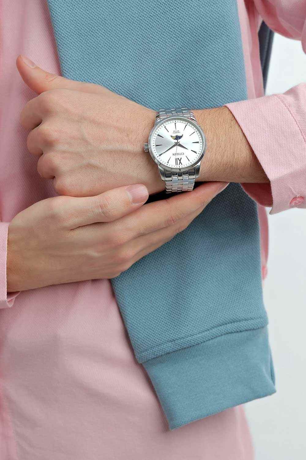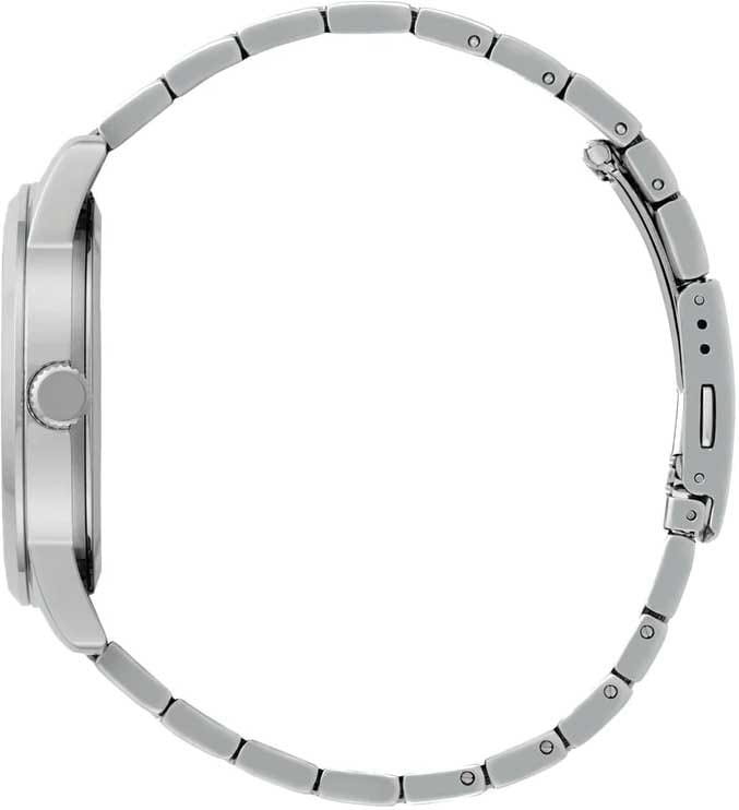Часы Citizen AK5000-54A произведены в Японии и оснащены надёжным кварцевым механизмом калибра Citizen 6324. Корпус выполнен из нержавеющей стали и имеет классическую круглую форму диаметром 42 мм. Минеральное стеклоМинеральное стеклоМинеральное стекло представляет собой искусственно выращенный минерал кварца. Такое стекло отличается особой устойчивостью к повреждениям и царапинам. Уступает по некоторым качествам сапфировому стеклу. защищает серебристый циферблат, украшенный эффектом солнечных лучей по технологии Sunray. На циферблате расположены клиновидные стрелки в стиле Dauphine, метки в виде штрихов и римская цифра в положении 12 часов, а также индикатор фазы Луны — одно из самых востребованных усложнений в часовой классике. Часы защищены от воды по стандарту 50WR, что позволяет не бояться случайных брызг и дождя. Заводная головка отличается рифлёной поверхностью для удобства использования. Стальной браслет с раскладной застёжкойРаскладная застёжкаТакой тип застёжки используется только на браслетах из металла. Она никогда не раскрывается полностью, происходит разделение на 2 и более частей. Раскладывающая застёжка снизит вероятность потери часов к минимуму. обеспечивает комфорт и надежную фиксацию на руке. В качестве элемента питания используется батарейка SR621SW, обеспечивающая автономную работу до двух лет.