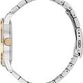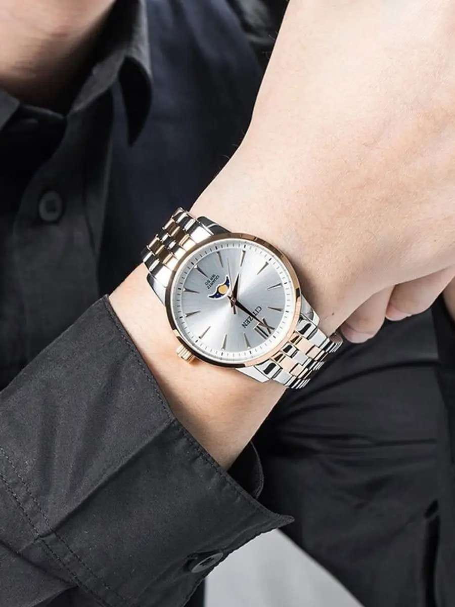 Часы Citizen AK5006-58A произведены в Японии и оснащены надёжным кварцевым механизмом калибра Citizen 6324. Корпус выполнен из нержавеющей стали и имеет классическую круглую форму диаметром 42 мм, а безельБезельВнешний ободок, закрепляющий стекло. В спортивных часах так называется поворотное кольцо с делениями на циферблате, выполняет роль таймера – замеряет отрезки времени на шкале. Неподвижный безель – элемент декора. Однонаправленно вращающийся безель на дайверских часах позволяет фиксировать моменты погружения и выныривания на поверхность. с элегантным золотистым IP-покрытиемIP-покрытиеМетод ионного напыления. Демонстрирует повышенную устойчивость к истиранию, окислению и химическим веществам. Под воздействием высокого давления и температуры около 1500°C молекулы металла надёжно соединяются с частицами корпуса часов.. Минеральное стеклоМинеральное стеклоМинеральное стекло представляет собой искусственно выращенный минерал кварца. Такое стекло отличается особой устойчивостью к повреждениям и царапинам. Уступает по некоторым качествам сапфировому стеклу. защищает серебристый циферблат, украшенный эффектом солнечных лучей по технологии Sunray. На циферблате расположены клиновидные стрелки в стиле Dauphine, метки в виде штрихов и римская цифра в положении 12 часов, а также индикатор фазы Луны — одно из самых востребованных усложнений в часовой классике. Часы защищены от воды по стандарту 50WR, что позволяет не бояться случайных брызг и дождя. Заводная головка отличается рифлёной поверхностью для удобства использования. Стальной браслет с частичным золотистым IP-покрытиемIP-покрытиеМетод ионного напыления. Демонстрирует повышенную устойчивость к истиранию, окислению и химическим веществам. Под воздействием высокого давления и температуры около 1500°C молекулы металла надёжно соединяются с частицами корпуса часов. и раскладной застёжкойРаскладная застёжкаТакой тип застёжки используется только на браслетах из металла. Она никогда не раскрывается полностью, происходит разделение на 2 и более частей. Раскладывающая застёжка снизит вероятность потери часов к минимуму. обеспечивает комфорт и надежную фиксацию на руке. В качестве элемента питания используется батарейка SR621SW, обеспечивающая автономную работу до двух лет.
