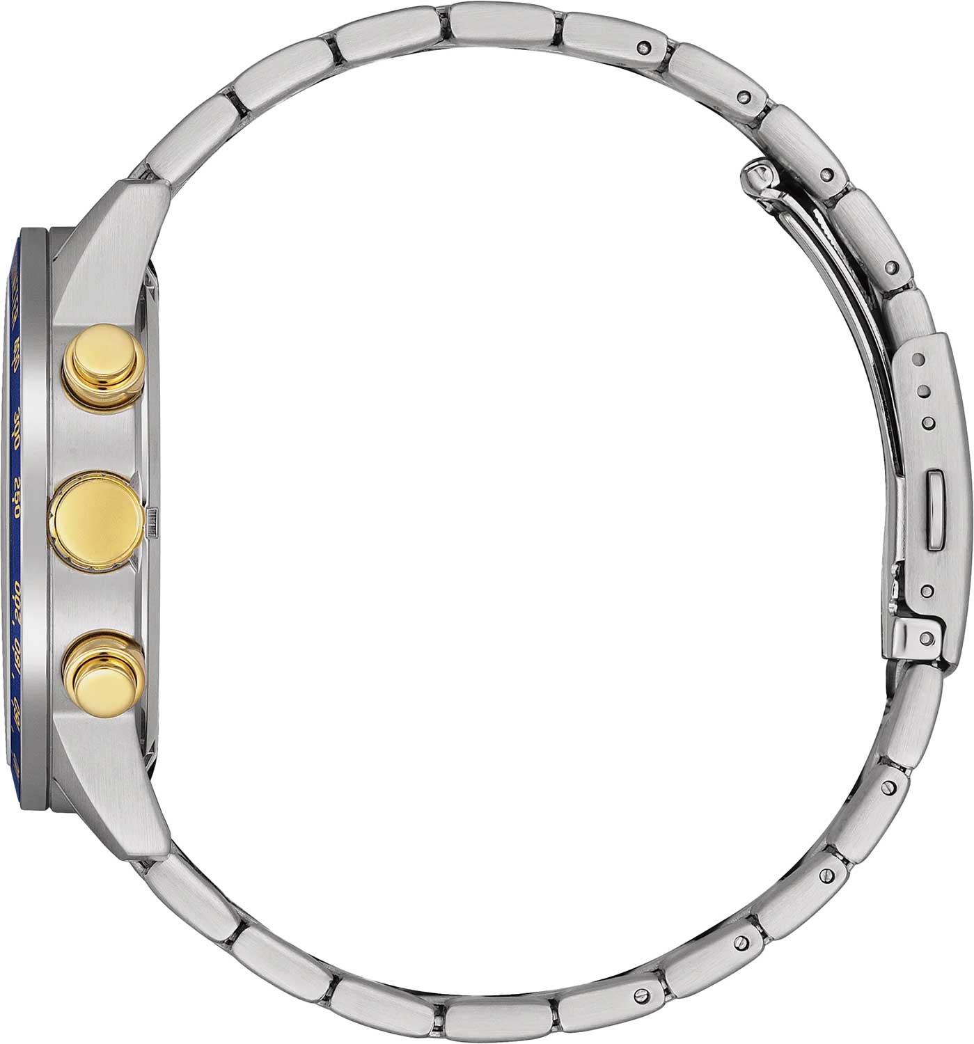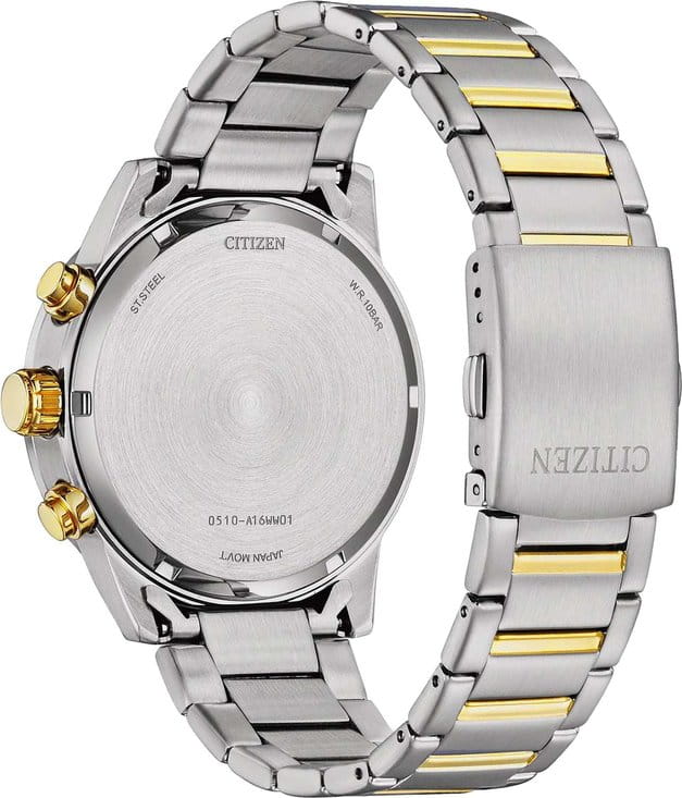 Citizen Chronograph AN3684-59L часы-хронографХронографФункция позволяет измерять отрезки времени с особой точностью: часы, минуты, секунды. Верным признаком хронографа является наличие на циферблате 3 дополнительных окошек-счётчиков. с секундомеромСекундомерСекундоме́р — прибор, способный измерять интервалы времени с точностью до долей секунды. спортивного дизайна с высоким уровнем водозащиты. Корпус из нержавеющей стали диаметром 44 мм идеально сбалансирован. Минеральное стеклоМинеральное стеклоМинеральное стекло представляет собой искусственно выращенный минерал кварца. Такое стекло отличается особой устойчивостью к повреждениям и царапинам. Уступает по некоторым качествам сапфировому стеклу. обеспечивает отличную защиту циферблата от царапин. Часы работают на основе кварцевого механизма. Стальной браслет на раскладной застёжкеРаскладная застёжкаТакой тип застёжки используется только на браслетах из металла. Она никогда не раскрывается полностью, происходит разделение на 2 и более частей. Раскладывающая застёжка снизит вероятность потери часов к минимуму. с частичным IP-покрытиемIP-покрытиеМетод ионного напыления. Демонстрирует повышенную устойчивость к истиранию, окислению и химическим веществам. Под воздействием высокого давления и температуры около 1500°C молекулы металла надёжно соединяются с частицами корпуса часов. идеально дополняют дизайн часов, обеспечивая комфортное ношение. Стрелки и метки на циферблате имеют люминесцентное покрытиеЛюминесцентное покрытиеПозволяет считывать показания времени в темноте. Производители наносят на стрелки, часовые индексы, безель или поверхность циферблата светонакопительный состав, дающий холодное свечение. позволяющее легко определять время даже в темноте. БезельБезельВнешний ободок, закрепляющий стекло. В спортивных часах так называется поворотное кольцо с делениями на циферблате, выполняет роль таймера – замеряет отрезки времени на шкале. Неподвижный безель – элемент декора. Однонаправленно вращающийся безель на дайверских часах позволяет фиксировать моменты погружения и выныривания на поверхность. с IP-покрытиемIP-покрытиеМетод ионного напыления. Демонстрирует повышенную устойчивость к истиранию, окислению и химическим веществам. Под воздействием высокого давления и температуры около 1500°C молекулы металла надёжно соединяются с частицами корпуса часов. и шкалой тахиметраТахиметрРазмеченная шкала, располагается на ободке или безеле часов. Тахиметр позволяет рассчитать скорость на определённом участке пути, расстояние измеряется в километрах или милях.. Секундомер с точностью 1с и временем измерения 12ч отображается центральной стрелкой. Окошко даты находится в положении 3 часа. Циферблат с метками в виде штрихов выполнен по технологии Sunray (солнечные лучи). Часы обладают впечатляющей водонепроницаемостью до 100WR, что делает их идеальными для повседневной носки.