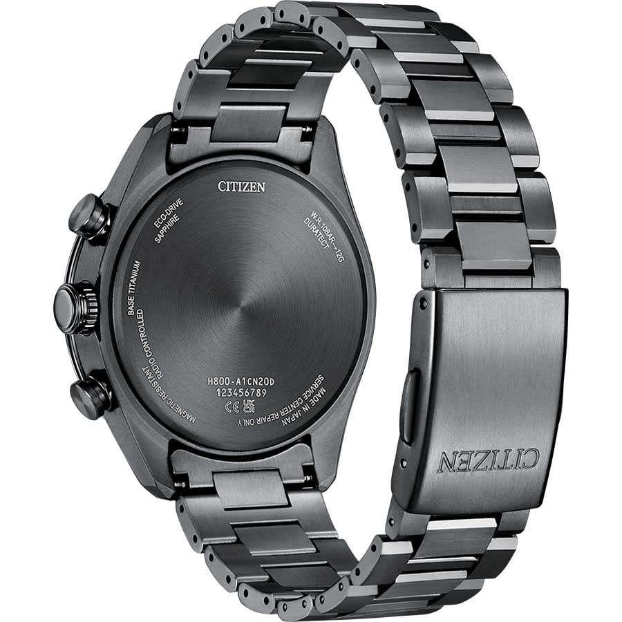 Citizen AT8286-65E — современные японские часы с кварцевым хронографомХронографФункция позволяет измерять отрезки времени с особой точностью: часы, минуты, секунды. Верным признаком хронографа является наличие на циферблате 3 дополнительных окошек-счётчиков. и секундомеромСекундомерСекундоме́р — прибор, способный измерять интервалы времени с точностью до долей секунды., выполненные в элегантном корпусе из титана с черным DLC-покрытиемDLC-покрытиеDiamond like carbon - одно из лучших видов покрытия, представляющее собой углерод с алмазными свойствами. На поверхность материала наносятся распавшиеся молекулы углерода, превращающиеся в плёнку из алмазоподобных связей, которая перенимает твёрдость алмаза. диаметром 42 мм и толщиной 11 мм. Модель оснащена инновационной технологией Eco-Drive, которая позволяет заряжать часы от солнечного света и обеспечивает запас хода до 180 дней, а при активации функции энергосбережения — до 10 месяцев без дополнительной подзарядки. Часы поддерживают автоматическую настройку времени по радиосигналу в Германии, Японии, США и Китае, а также позволяют отображать мировое времяМировое время Полезное часовое усложнение, отображающее время в основных городах и известных областях по всему миру, оно связано с часовыми поясами, удобно для путешественников и бизнесменов. для 26 городов и легко переключаться между летним и стандартным временем. Функционал включает индикацию даты и дня недели, а стрелки и часовые метки с люминесцентным покрытиемЛюминесцентное покрытиеПозволяет считывать показания времени в темноте. Производители наносят на стрелки, часовые индексы, безель или поверхность циферблата светонакопительный состав, дающий холодное свечение. обеспечивают отличную видимость в темноте. Прочное сапфировое стеклоСапфировое стеклоПрочный и надёжный материал из кристалла сапфира синтетического происхождения, характеризующийся особой твёрдостью и устойчивостью к царапинам и повреждениям. с антибликовым покрытиемАнтибликовое покрытиеСлой оксида металла в 0,13-0,3 микрон, благодаря которому стекло часов не бликует и не отражает свет. Антибликовое покрытие уменьшает отражение света в 10 раз, обеспечивая отличную читаемость показателей циферблата. устойчиво к появлению царапин и защищает лаконичный циферблат с индексами в виде штрихов. Титановый браслет с черным DLC-покрытиемDLC-покрытиеDiamond like carbon - одно из лучших видов покрытия, представляющее собой углерод с алмазными свойствами. На поверхность материала наносятся распавшиеся молекулы углерода, превращающиеся в плёнку из алмазоподобных связей, которая перенимает твёрдость алмаза. и с раскладной застёжкойРаскладная застёжкаТакой тип застёжки используется только на браслетах из металла. Она никогда не раскрывается полностью, происходит разделение на 2 и более частей. Раскладывающая застёжка снизит вероятность потери часов к минимуму. гармонично дополняет корпус, подчеркивая премиальный стиль модели. Водозащита уровня WR 100 позволяет использовать часы в повседневной жизни, в том числе во время плавания без погружения.