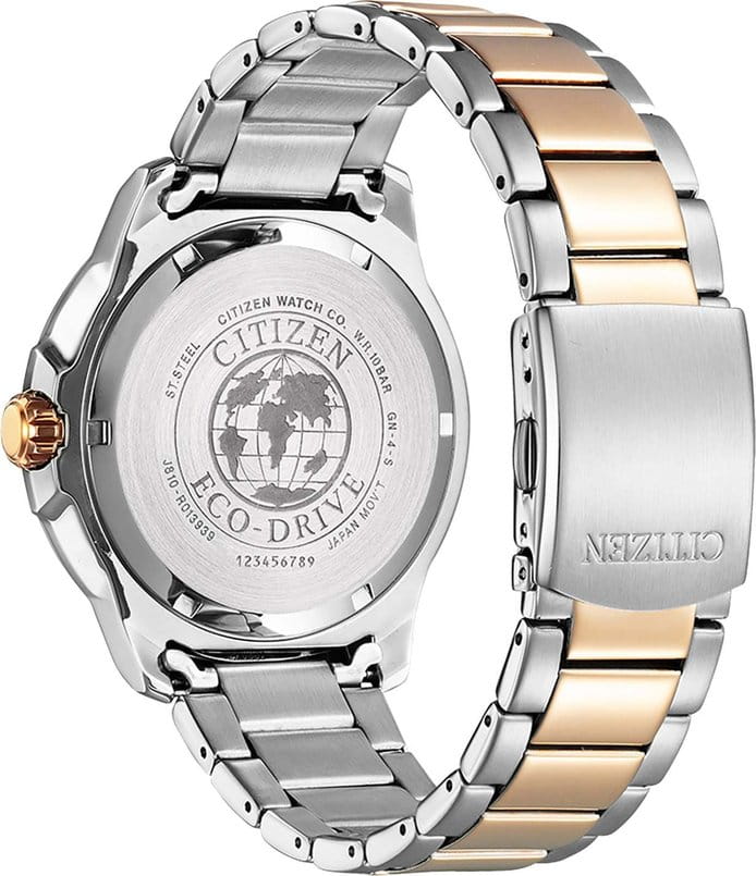 Часы Citizen AW1524-84E – это стильная и надежная модель японского производства, идеально подходящая для активного образа жизни. Корпус выполнен из высококачественной нержавеющей стали, в то время как на безельБезельВнешний ободок, закрепляющий стекло. В спортивных часах так называется поворотное кольцо с делениями на циферблате, выполняет роль таймера – замеряет отрезки времени на шкале. Неподвижный безель – элемент декора. Однонаправленно вращающийся безель на дайверских часах позволяет фиксировать моменты погружения и выныривания на поверхность. нанесено черное PVD-покрытиеPVDУльтратонкое покрытие наносится в технике вакуумного напыления, сочетает в себе нитрид титана особой прочности со слоем золота или оксида хрома. Несёт в себе декоративную или защитную функцию., браслет также стальной с элегантными вставками PVD-покрытияPVDУльтратонкое покрытие наносится в технике вакуумного напыления, сочетает в себе нитрид титана особой прочности со слоем золота или оксида хрома. Несёт в себе декоративную или защитную функцию. оттенка розового золота. Черный циферблат украшен метками в виде штрихов и оснащен календарем с окошком даты. Защиту от повреждений обеспечивает прочное минеральное стеклоМинеральное стеклоМинеральное стекло представляет собой искусственно выращенный минерал кварца. Такое стекло отличается особой устойчивостью к повреждениям и царапинам. Уступает по некоторым качествам сапфировому стеклу., а водонепроницаемость до 100 метров позволяет не снимать часы во время плавания и занятий спортом. Внутри установлен надежный кварцевый механизм Citizen J810 с инновационной системой Eco-Drive, которая питается от солнечной энергии и не требует замены батарейки, обеспечивая запас хода до 240 дней. Стрелки и часовые метки с люминесцентным покрытиемЛюминесцентное покрытиеПозволяет считывать показания времени в темноте. Производители наносят на стрелки, часовые индексы, безель или поверхность циферблата светонакопительный состав, дающий холодное свечение. обеспечивают отличную читаемость даже в темноте. Функция индикации заряда EOLEOLПредставляет собой систему, уведомляющую владельца часов о необходимости замены элемента питания. За 2 недели до полного разряда батарейки секундная стрелка перестаёт ходить чётко и начинает перепрыгивать на 3-4 деления. подскажет, когда потребуется подзарядка. Корпус диаметром 45,9 мм, толщина 11,8 мм, ширина браслета 22 мм, вес модели составляет 160 граммов. Завинчивающаяся задняя крышка украшена фирменной гравировкой Eco-Drive, а заводная головка оснащена защитой. Надежная раскладная застёжкаРаскладная застёжкаТакой тип застёжки используется только на браслетах из металла. Она никогда не раскрывается полностью, происходит разделение на 2 и более частей. Раскладывающая застёжка снизит вероятность потери часов к минимуму. браслета с системой блокировки гарантирует комфортное и безопасное ношение.