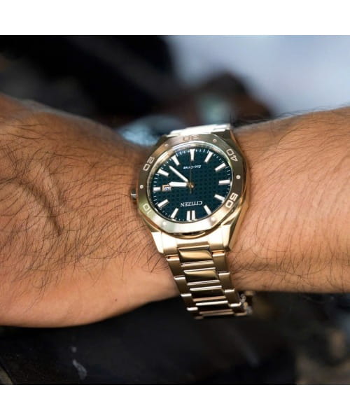 Часы Citizen BM7633-81X сочетают в себе современный стиль и высокую функциональность. Японский кварцевый механизм калибра Citizen E111 обеспечивает точную работу и надежность, а инновационная система Eco-Drive позволяет забыть о замене батареек — питание осуществляется за счет солнечной энергии, с запасом хода до 180 дней. Корпус и браслет выполнены из прочной нержавеющей стали с золотистым IP-покрытиемIP-покрытиеМетод ионного напыления. Демонстрирует повышенную устойчивость к истиранию, окислению и химическим веществам. Под воздействием высокого давления и температуры около 1500°C молекулы металла надёжно соединяются с частицами корпуса часов., что гарантирует долговечность и устойчивость к износу. На безелеБезельВнешний ободок, закрепляющий стекло. В спортивных часах так называется поворотное кольцо с делениями на циферблате, выполняет роль таймера – замеряет отрезки времени на шкале. Неподвижный безель – элемент декора. Однонаправленно вращающийся безель на дайверских часах позволяет фиксировать моменты погружения и выныривания на поверхность. выгравирована секундная и минутная шкала. Элегантный темно-зеленый циферблат со стрелками и метками с люминесцентным покрытиемЛюминесцентное покрытиеПозволяет считывать показания времени в темноте. Производители наносят на стрелки, часовые индексы, безель или поверхность циферблата светонакопительный состав, дающий холодное свечение. защищен устойчивым к царапинам минеральным стекломМинеральное стеклоМинеральное стекло представляет собой искусственно выращенный минерал кварца. Такое стекло отличается особой устойчивостью к повреждениям и царапинам. Уступает по некоторым качествам сапфировому стеклу. . Водозащита до 100 метров позволяет использовать часы при плавании и в повседневных ситуациях. Окно даты расположено на отметке «3 часа», а браслет оснащен удобной раскладной застёжкойРаскладная застёжкаТакой тип застёжки используется только на браслетах из металла. Она никогда не раскрывается полностью, происходит разделение на 2 и более частей. Раскладывающая застёжка снизит вероятность потери часов к минимуму.. Диаметр корпуса составляет 41 мм, толщина — 9,7 мм, ширина браслета — 22 мм, вес — 136 г. Эти часы станут отличным выбором для тех, кто ценит надежность, практичность и стильный внешний вид.