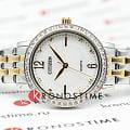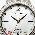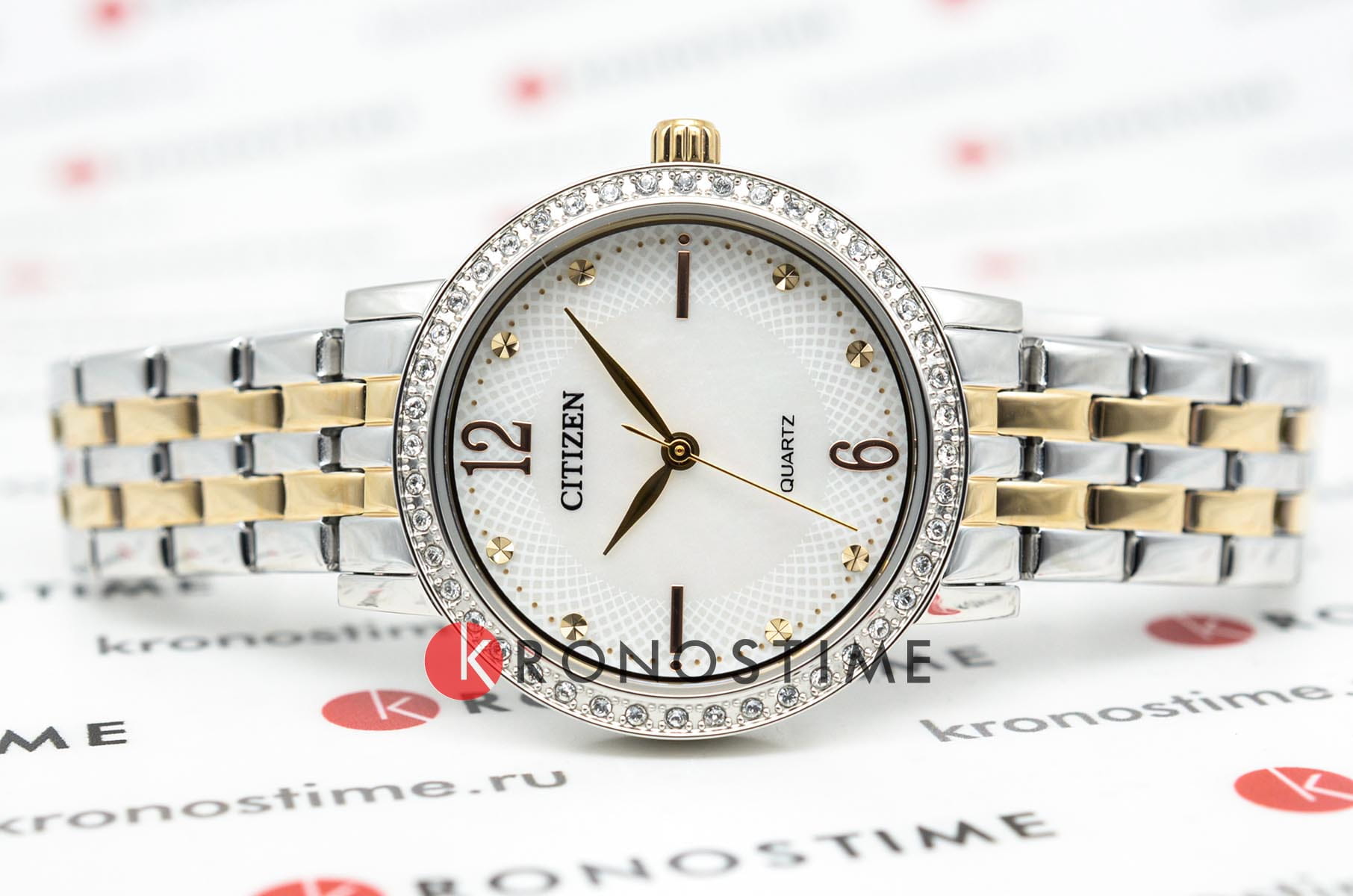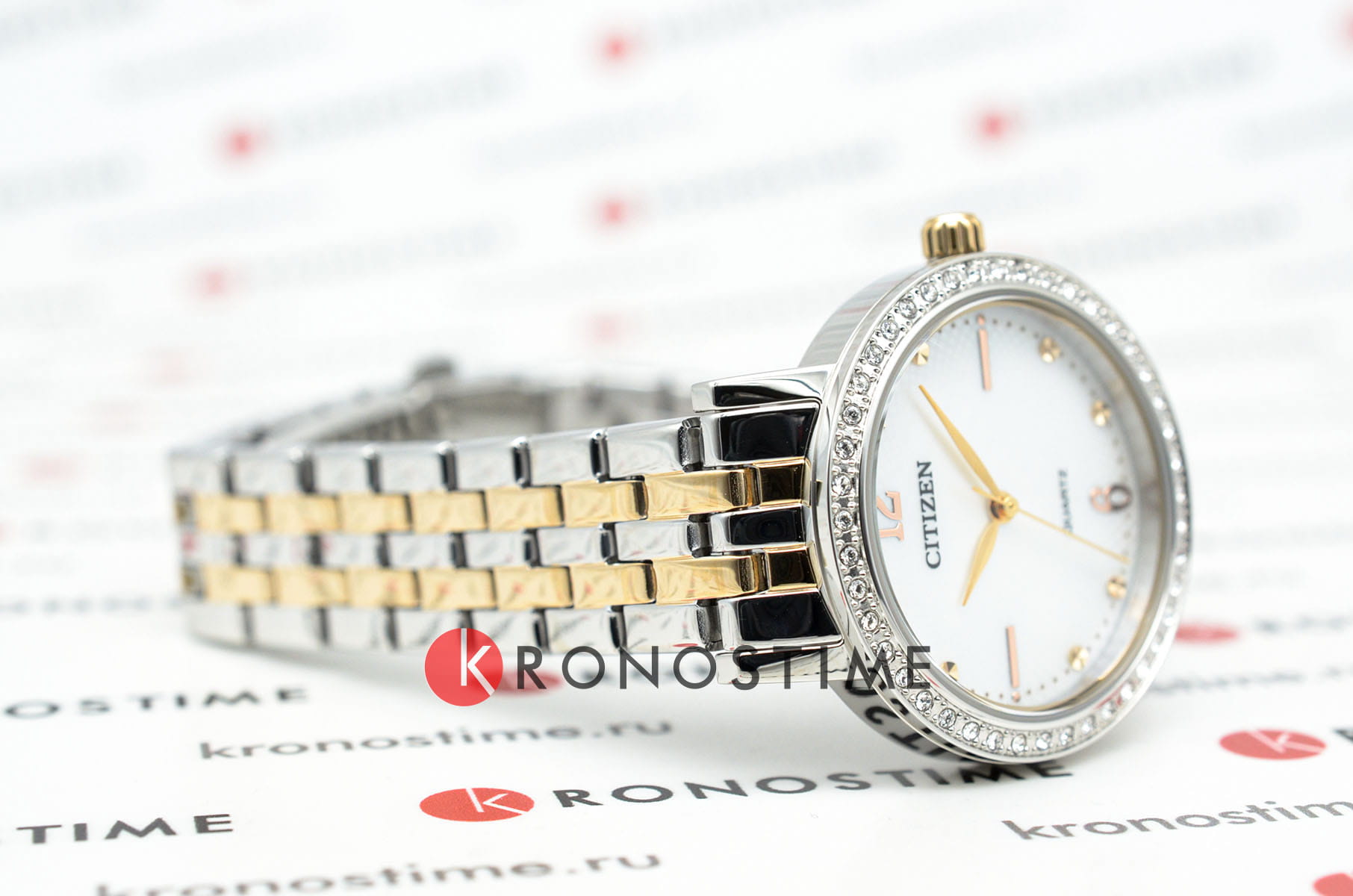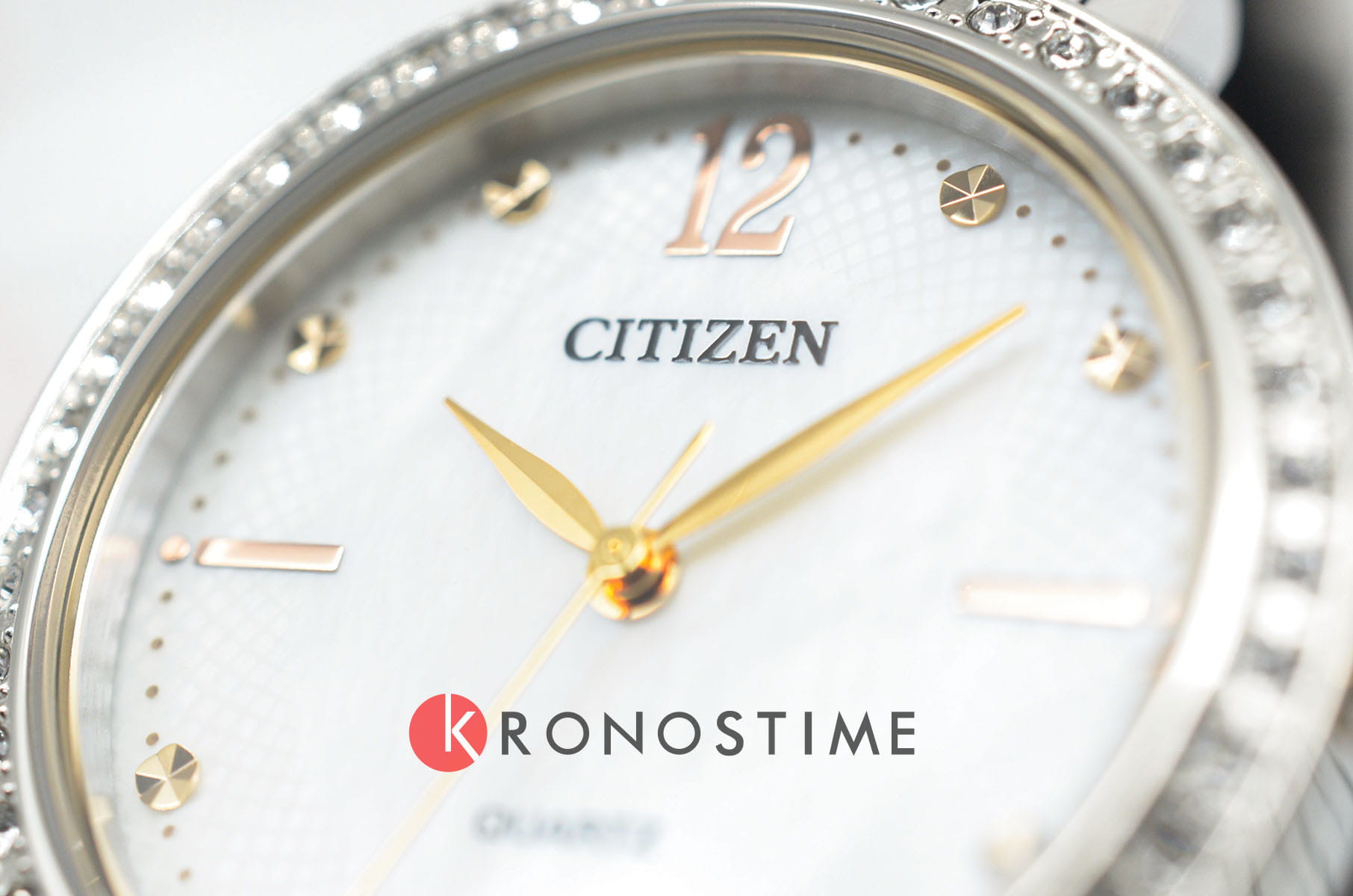 Часы Citizen EL3106-59D представляют собой элегантную модель, выполненную в Японии, сочетающую в себе современные технологии и утончённый дизайн. Корпус  изготовлен из прочной нержавеющей стали, что обеспечивает долговечность и привлекательный внешний вид. Диаметр корпуса составляет 31 мм, а толщина — всего 7 мм, что делает часы изящными и аккуратными на запястье. Особое внимание привлекает безельБезельВнешний ободок, закрепляющий стекло. В спортивных часах так называется поворотное кольцо с делениями на циферблате, выполняет роль таймера – замеряет отрезки времени на шкале. Неподвижный безель – элемент декора. Однонаправленно вращающийся безель на дайверских часах позволяет фиксировать моменты погружения и выныривания на поверхность., украшенный мерцающими кристаллами, которые придают часам особый шарм и изысканность. Надёжный кварцевый механизм гарантирует точность хода, а водозащита уровня WR 50 позволяет не снимать часы при мытье рук или во время дождя. Перламутровый циферблат украшен часовыми индексами в виде точек и цифр, а также оснащён центральными стрелками часов, минут и секунд для удобного считывания времени и кристаллами. Минеральное стеклоМинеральное стеклоМинеральное стекло представляет собой искусственно выращенный минерал кварца. Такое стекло отличается особой устойчивостью к повреждениям и царапинам. Уступает по некоторым качествам сапфировому стеклу. устойчиво к появлению мелких царапин, сохраняя прозрачность и презентабельный вид.  Стальной браслет с частичным золотистым IP-покрытиемIP-покрытиеМетод ионного напыления. Демонстрирует повышенную устойчивость к истиранию, окислению и химическим веществам. Под воздействием высокого давления и температуры около 1500°C молекулы металла надёжно соединяются с частицами корпуса часов. и раскладной застёжкойРаскладная застёжкаТакой тип застёжки используется только на браслетах из металла. Она никогда не раскрывается полностью, происходит разделение на 2 и более частей. Раскладывающая застёжка снизит вероятность потери часов к минимуму. надежно фиксирует часы на запястье, обеспечивая комфорт при ежедневном ношении.