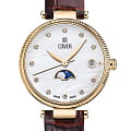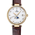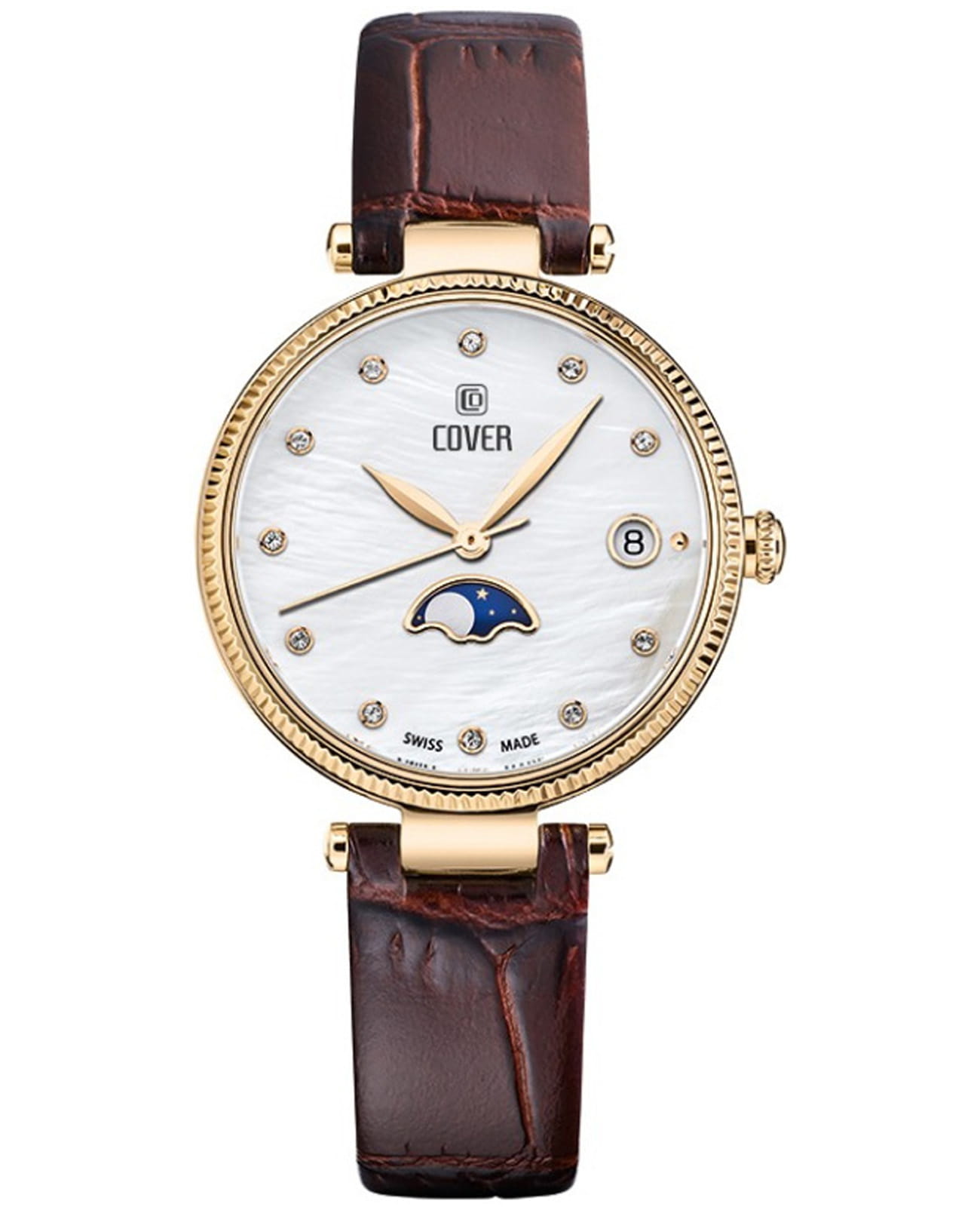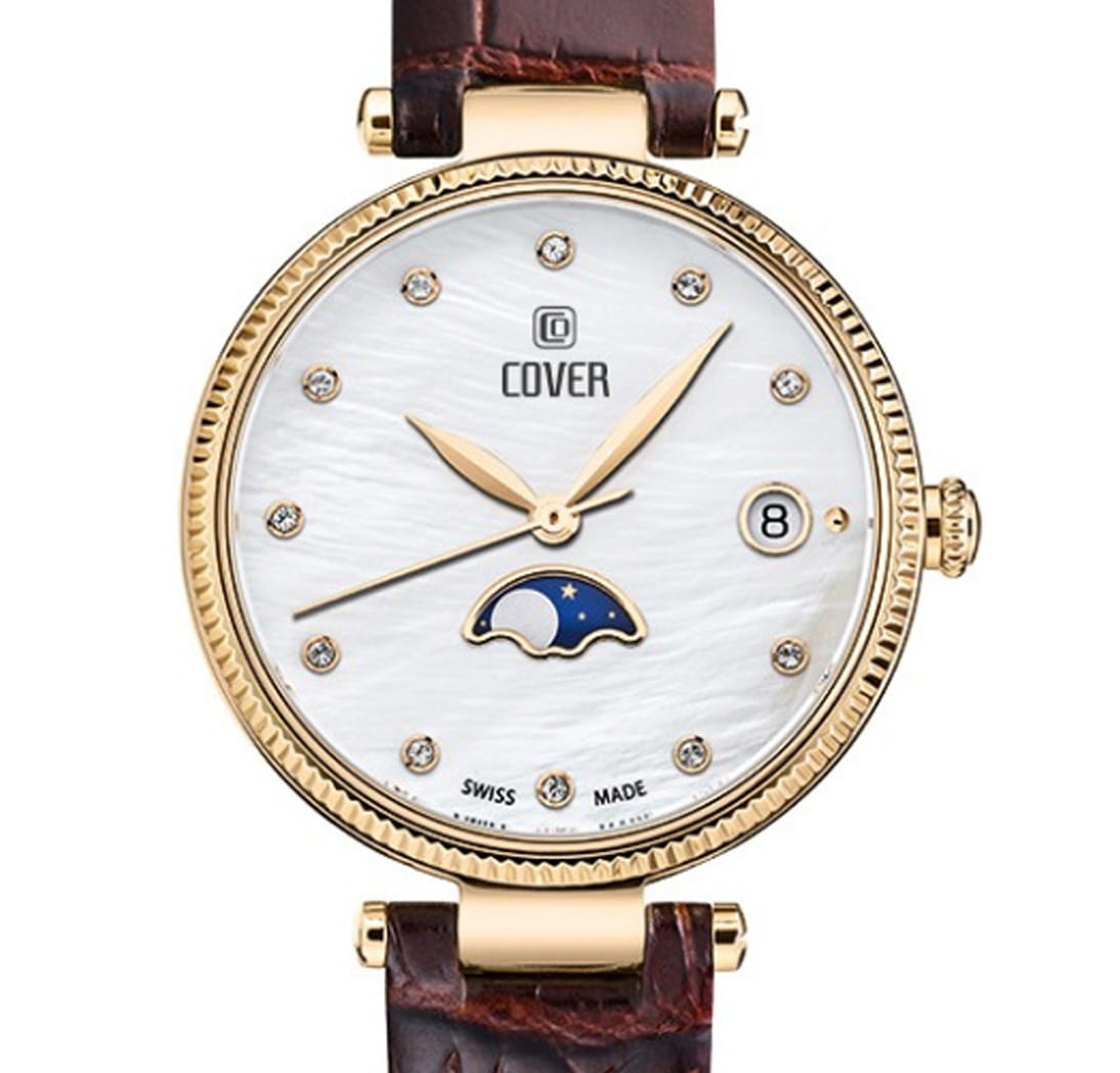 Женские часы Cover Moon CO196.05 - это аксессуар для истинных леди из коллекции Fly Me To The Moon. Часы работают на кварцевом калибре ETA. Циферблат выполнен в белом перламутровом исполнении, создавая игру света при каждом движении запястья, и украшен 11 кристаллами Swarovski, которые служат часовым индикатором, добавляя блики света и роскоши. Кроме того, модель имеет окно фаз Луны на «6 часах» и апертуру даты на «3 часах», что делает ее функциональной для ценителей астрономических усложнений. Часы имеют 32-миллиметровый корпус из нержавеющей стали с PVD-покрытиемPVDУльтратонкое покрытие наносится в технике вакуумного напыления, сочетает в себе нитрид титана особой прочности со слоем золота или оксида хрома. Несёт в себе декоративную или защитную функцию. цвета желтого золота.  Водонепроницаемость часов достигает 5 атмосфер (WR 50), что позволяет использовать их в повседневной жизни, однако не рекомендуется для контакта с водой во время плавания или дайвинга. Маркировка «Swiss Made». Кожаный ремешок на классической застежке.