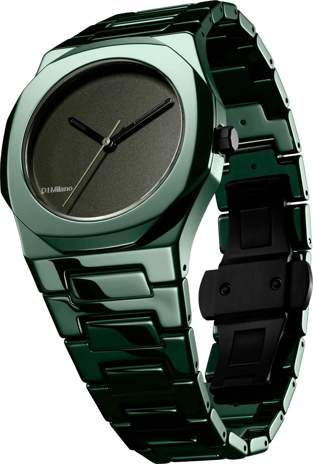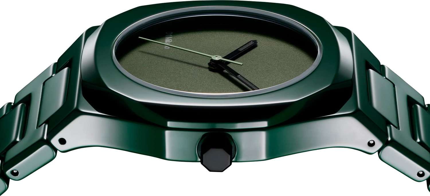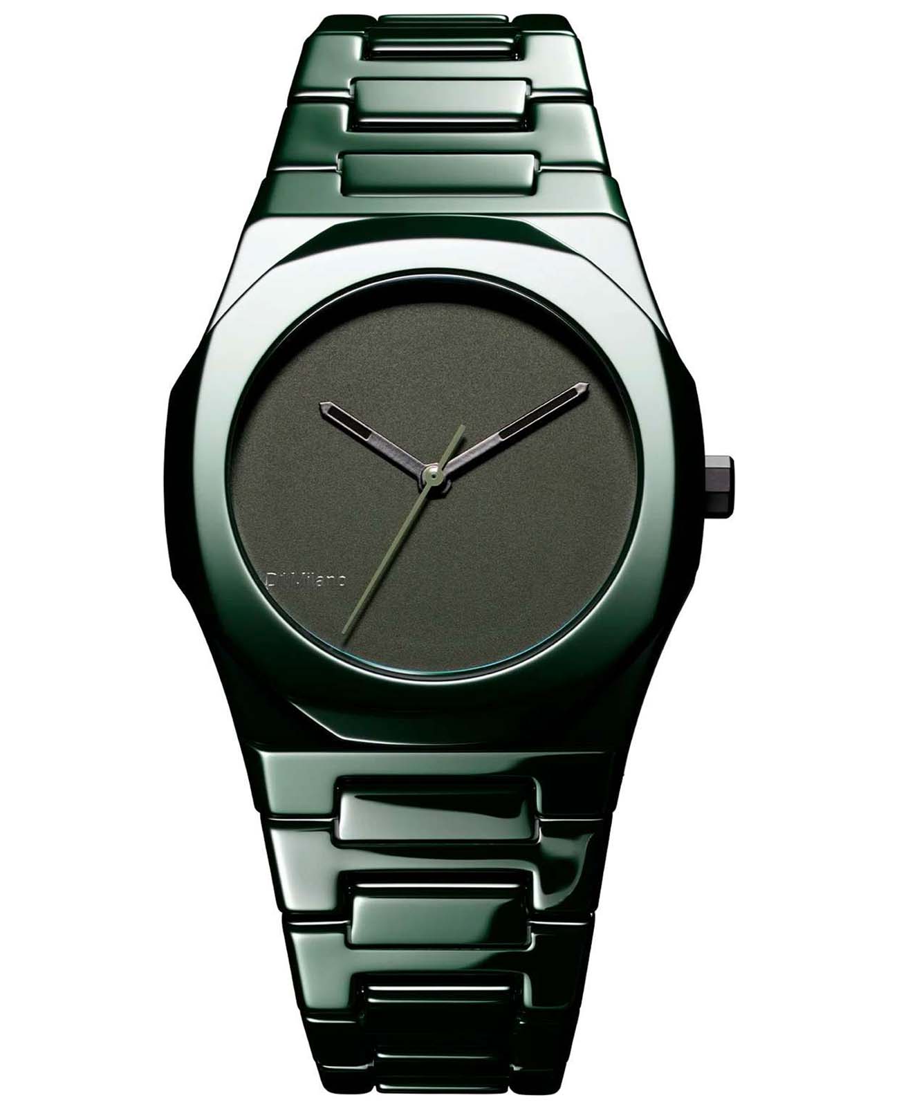 Часы D1 Milano Ceramic CEBU04 Pure Green – роскошный аксессуар для современных женщин и мужчин. Кварцевые часы с корпусом из зеленой керамики. Циферблат лаконичный, без индексов, с надписью бренда. Стрелки из латуни с люминесцентным покрытиемЛюминесцентное покрытиеПозволяет считывать показания времени в темноте. Производители наносят на стрелки, часовые индексы, безель или поверхность циферблата светонакопительный состав, дающий холодное свечение.. Стальная задняя крышка с PVD-покрытиемPVDУльтратонкое покрытие наносится в технике вакуумного напыления, сочетает в себе нитрид титана особой прочности со слоем золота или оксида хрома. Несёт в себе декоративную или защитную функцию. закреплена на 4 винтах, что обеспечивает надежность конструкции. Керамический браслет с застёжкой «бабочка» с кнопкамиЗастёжка "бабочка"Такой вид застёжки дополняется предохранителями, помогающими избежать случайного раскрытия браслета. Обладают изящным исполнением. . Часы сочетают в себе классический дизайн и современные технологии производства.