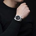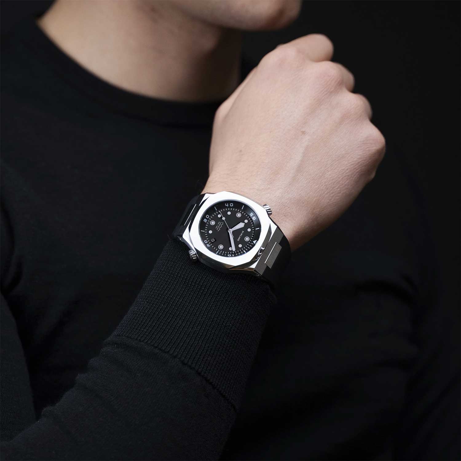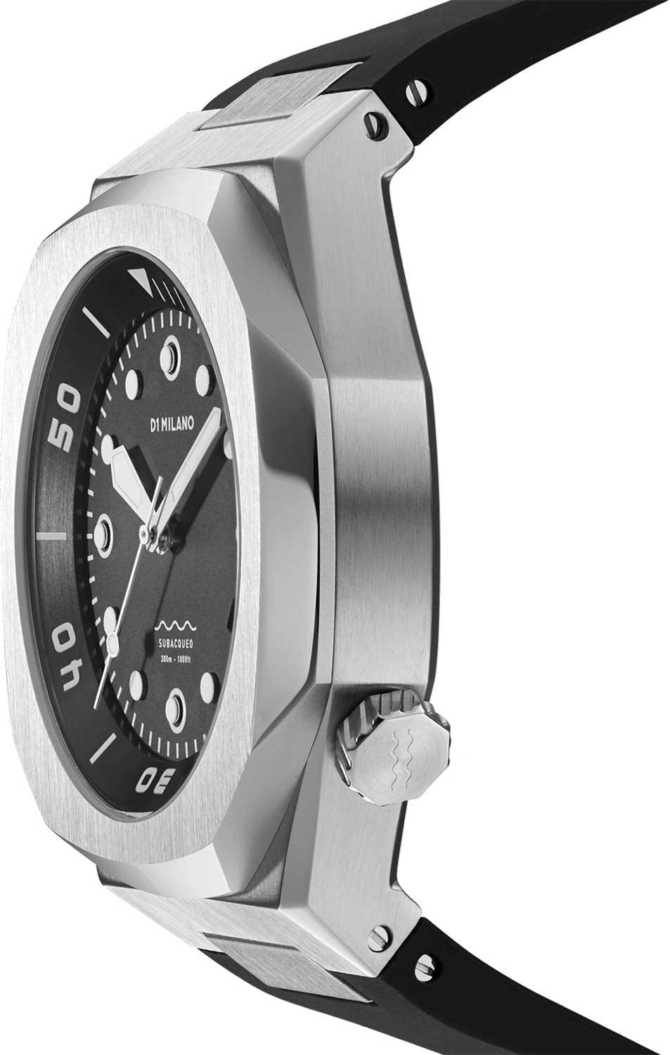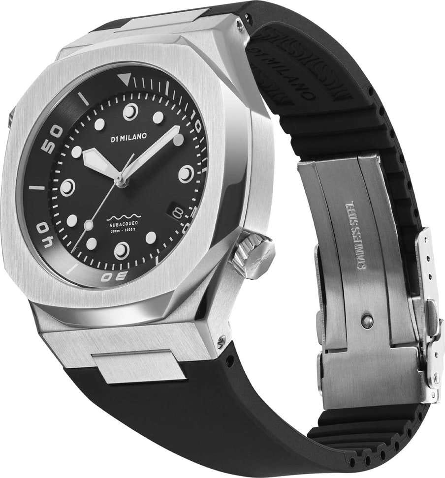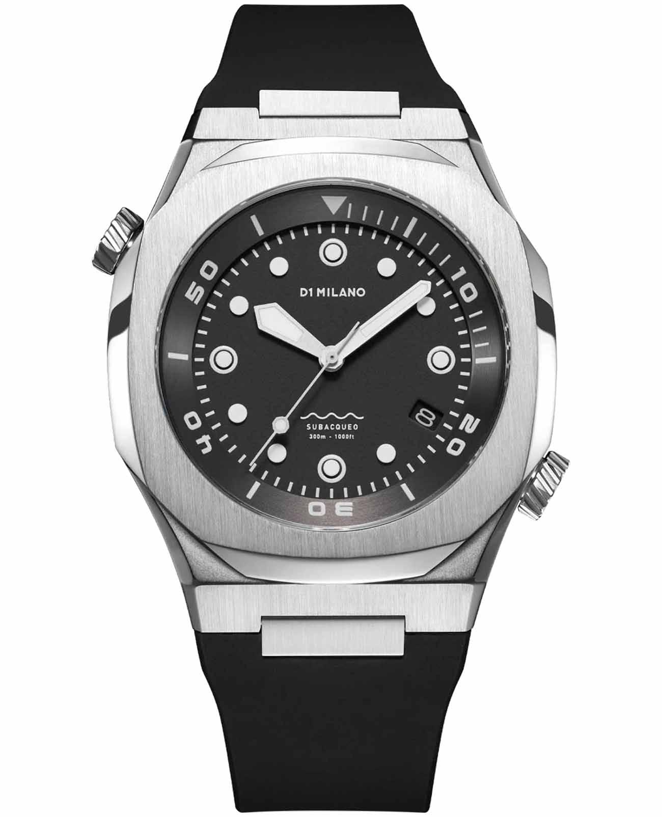 Часы D1 Milano DVRJ01 — это механические мужские часы с автоподзаводом, которые поражают своим спортивным стилем и точностью исполнения. С этими удобными часами покорение морских глубин выйдет на новый уровень. Корпус из нержавеющей стали серебристого цвета гармонично сочетается с черным циферблатом. Запас хода 41 час. Циферблат защищен сапфировым стекломСапфировое стеклоПрочный и надёжный материал из кристалла сапфира синтетического происхождения, характеризующийся особой твёрдостью и устойчивостью к царапинам и повреждениям., а черный силиконовый ремешок придает ему элегантный вид. На циферблате часов есть окошко даты в положении 4 часа. На часовую, минутную стрелки нанесено люминесцентное покрытиеЛюминесцентное покрытиеПозволяет считывать показания времени в темноте. Производители наносят на стрелки, часовые индексы, безель или поверхность циферблата светонакопительный состав, дающий холодное свечение., которое светится в темноте, создавая необычное изображение. Водонепроницаемость часов достигает 300 метров, что делает их подходящими для для дайвинга.