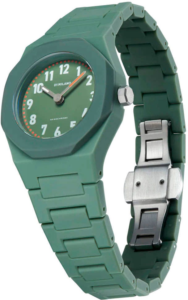 Часы D1 Milano Nanochrome Young Croco NCBJ02 – это стильные и молодежные наручные часы, идеально подходящие для подростков. Модель имеет компактный корпус диаметром 32 мм и толщиной 8,8 мм, изготовленный из поликарбоната с мягким на ощупь покрытием. Часы оснащены матовым зеленым циферблатом с белыми и оранжевыми деталями, что придает им яркий и современный вид. Минеральное стекло с антибликовым покрытием защищает циферблат от царапин. Часы работают от кварцевого механизма Seiko VJ20, обеспечивающего точный ход. Зеленый поликарбонатный ремешок с потайной раскладной застёжкойРаскладная застёжкаТакой тип застёжки используется только на браслетах из металла. Она никогда не раскрывается полностью, происходит разделение на 2 и более частей. Раскладывающая застёжка снизит вероятность потери часов к минимуму. удобно облегает запястье. Водонепроницаемость 5 ATM позволяет носить часы при плавании. Легкий вес всего 34 грамма делает их комфортными для повседневного использования. Часы D1 Milano Nanochrome NCBJ01 сочетают в себе итальянский дизайн, качество и доступность, что делает их отличным выбором для молодых людей, желающих выразить свой стиль.