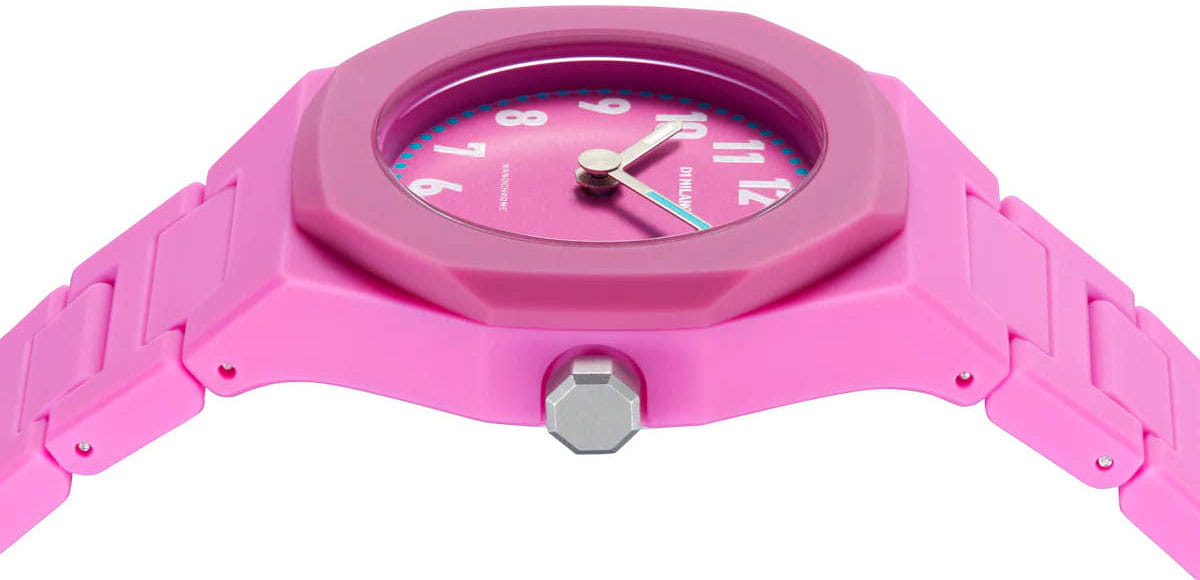 Часы D1 Milano Nanochrome Young Flamingo NCBJ03 –это стильные и молодежные наручные часы, идеально подходящие для подростков. Модель имеет компактный корпус диаметром 32 мм и толщиной 8,8 мм, изготовленный из поликарбоната с мягким на ощупь покрытием. Часы оснащены матовым розовым циферблатом с белыми и голубыми деталями, что придает им яркий и современный вид. Минеральное стекло с антибликовым покрытием защищает циферблат от царапин. Часы работают от кварцевого механизма Seiko VJ20, обеспечивающего точный ход. Розовый поликарбонатный ремешок с потайной раскладной застёжкойРаскладная застёжкаТакой тип застёжки используется только на браслетах из металла. Она никогда не раскрывается полностью, происходит разделение на 2 и более частей. Раскладывающая застёжка снизит вероятность потери часов к минимуму. удобно облегает запястье. Водонепроницаемость 5 ATM позволяет носить часы при плавании. Легкий вес всего 34 грамма делает их комфортными для повседневного использования. Часы D1 Milano Nanochrome NCBJ01 сочетают в себе итальянский дизайн, качество и доступность, что делает их отличным выбором для молодых людей, желающих выразить свой стиль.