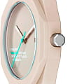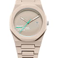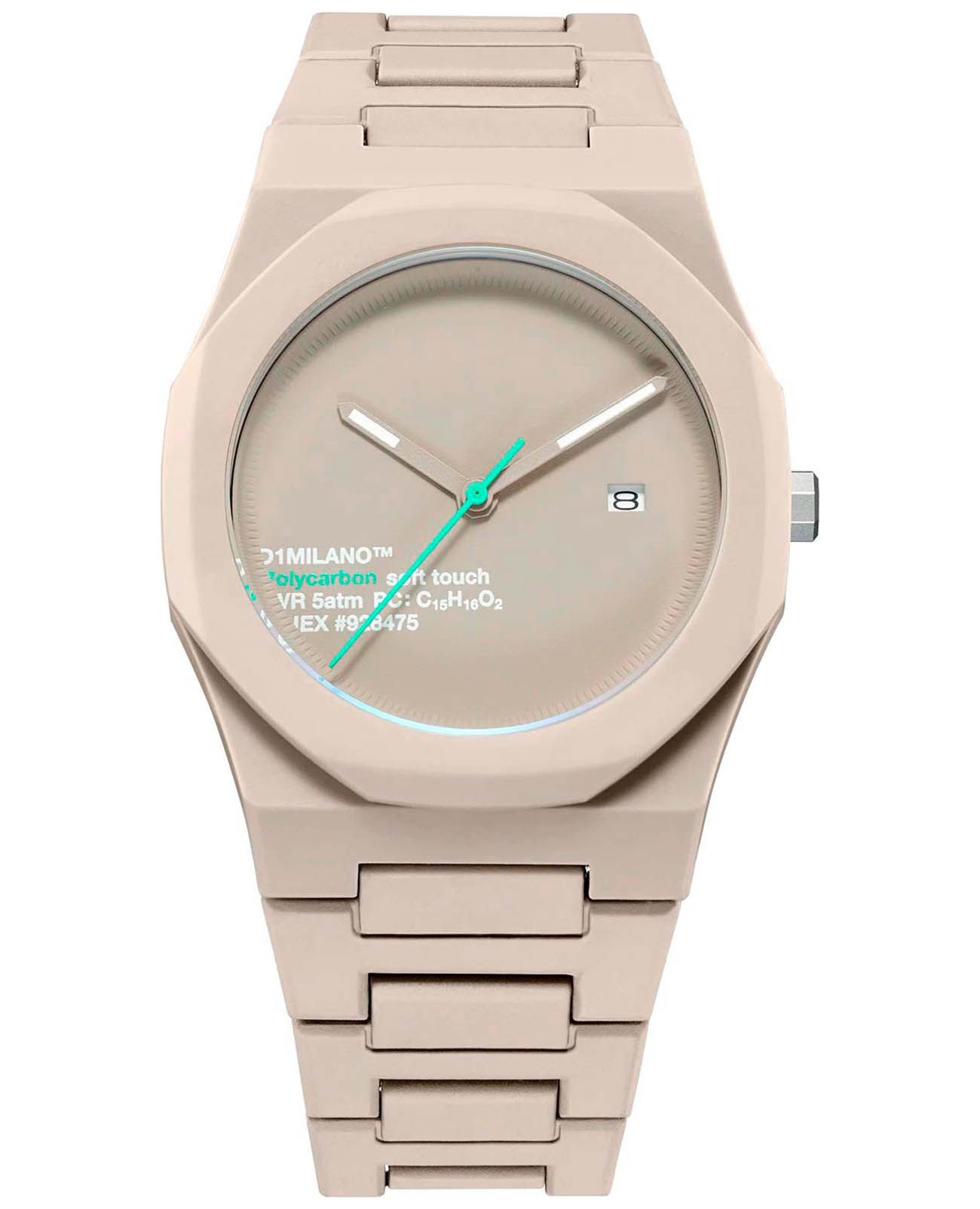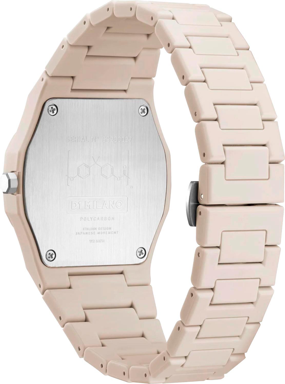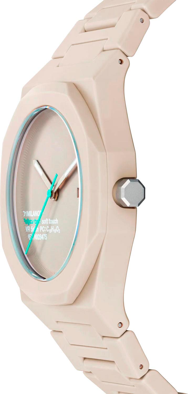 Часы D1 Milano Polycarbon PCBJ30 – молодежные часы в стиле унисекс для повседневных образов. Кварцевые часы с калибром Seiko VJ32B. Модель Hot Stone Polycarbon  имеет бежевый корпус из поликарбоната с покрытием Софт-Тач. Циферблат лаконичный без индексов, защищен минеральным стекломМинеральное стеклоМинеральное стекло представляет собой искусственно выращенный минерал кварца. Такое стекло отличается особой устойчивостью к повреждениям и царапинам. Уступает по некоторым качествам сапфировому стеклу. с антибликовым покрытием. Стрелки с люминесцентным покрытиемЛюминесцентное покрытиеПозволяет считывать показания времени в темноте. Производители наносят на стрелки, часовые индексы, безель или поверхность циферблата светонакопительный состав, дающий холодное свечение.. Окошко даты находится в положении 3 часов. Яркая секундная стрелка дополняет стильный образ. Стальная задняя крышка на 4 винтах. Пластиковый браслет на  застёжке «бабочка» с кнопкамиЗастёжка "бабочка"Такой вид застёжки дополняется предохранителями, помогающими избежать случайного раскрытия браслета. Обладают изящным исполнением.