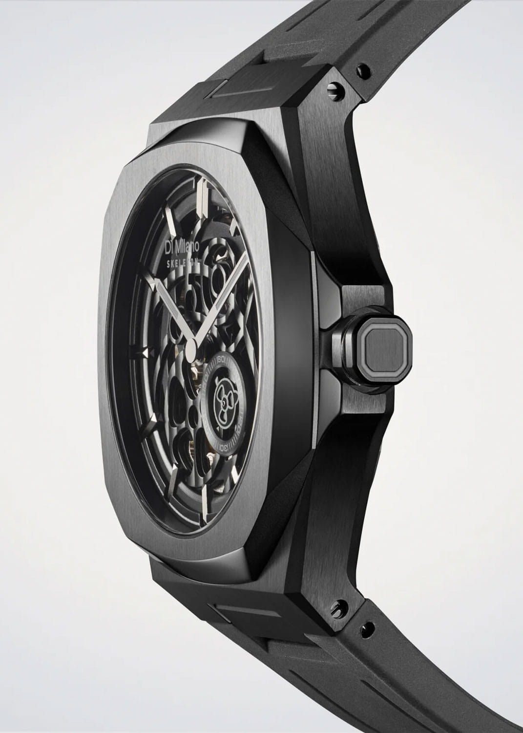 Часы D1 Milano Skeleton SKRJ17 — это эффектные механические мужские часы, разработанные для ценителей уникальных аксессуаров. Их утонченный дизайн и высокое качество исполнения делают эти часы незаменимым элементом вашего стиля. Изготовленные в Италии, они оснащены надежным механизмом Miyota 8N40 с автоподзаводом, обеспечивающими запас хода до 42 часа. Частота работы механизма составляет 21600 полуколебаний в час. Часы имеют корпус из нержавеющей стали с PVD-покрытиемPVDУльтратонкое покрытие наносится в технике вакуумного напыления, сочетает в себе нитрид титана особой прочности со слоем золота или оксида хрома. Несёт в себе декоративную или защитную функцию. черного цвета, что гарантирует долговечность и стойкость к внешним воздействиям. Скелетонизированный циферблат защищен сапфировым стекломСапфировое стеклоПрочный и надёжный материал из кристалла сапфира синтетического происхождения, характеризующийся особой твёрдостью и устойчивостью к царапинам и повреждениям. с антибликовым покрытиемАнтибликовое покрытиеСлой оксида металла в 0,13-0,3 микрон, благодаря которому стекло часов не бликует и не отражает свет. Антибликовое покрытие уменьшает отражение света в 10 раз, обеспечивая отличную читаемость показателей циферблата., подчеркивающим элегантность и изысканность модели и защищает от царапин. Стрелки с люминесцентным покрытиемЛюминесцентное покрытиеПозволяет считывать показания времени в темноте. Производители наносят на стрелки, часовые индексы, безель или поверхность циферблата светонакопительный состав, дающий холодное свечение.. Метки в виде штрихов и прозрачная задняя крышка, закрепленная на 8 винтах, придают часам особый шарм. Каучуковый ремешок с классической застежкой обеспечивает комфортное и надежное ношение. Водозащита до 50 WR делает эти часы подходящими для повседневного использования.