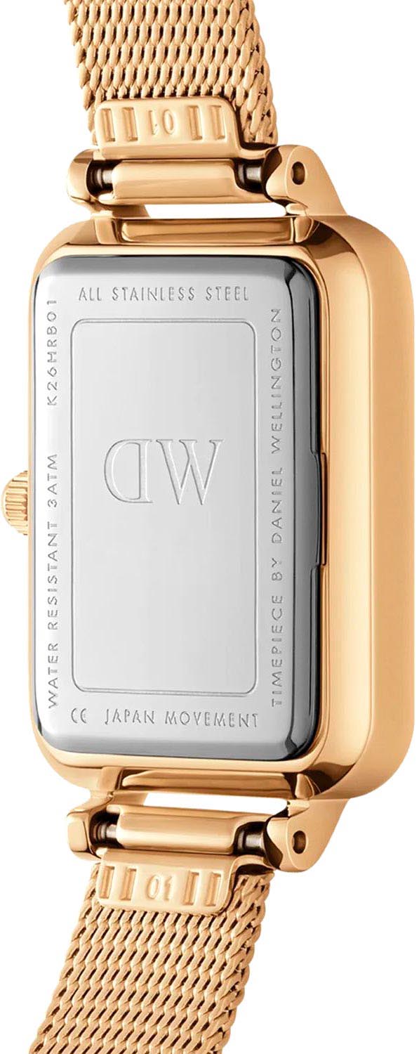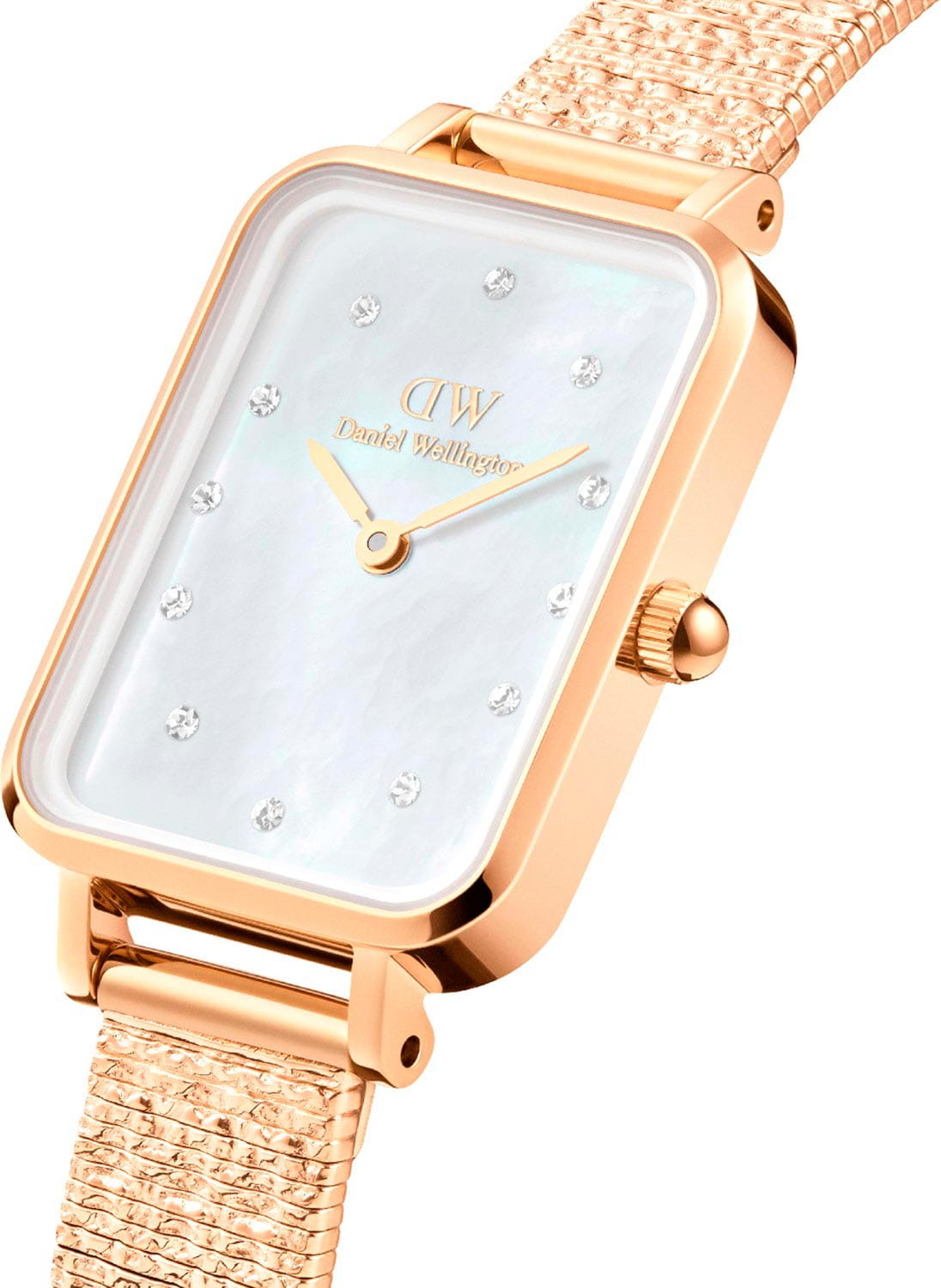 Женские наручные часы с минеральным стекломМинеральное стеклоМинеральное стекло представляет собой искусственно выращенный минерал кварца. Такое стекло отличается особой устойчивостью к повреждениям и царапинам. Уступает по некоторым качествам сапфировому стеклу. Daniel Wellington Quadro Lumine Pressed Piano DW00100582, кварцевый механизм с высокой точностью. Корпус часов изготовлен из нержавеющей стали с PVD-покрытиемPVDУльтратонкое покрытие наносится в технике вакуумного напыления, сочетает в себе нитрид титана особой прочности со слоем золота или оксида хрома. Несёт в себе декоративную или защитную функцию.. Накладные метки в виде штрихов. Японский кварцевый механизм. Рифленая заводная головка. Класс водозащиты: 30 метров, позволит защитить корпус от случайных брызг или капель дождя. Стальной браслет миланского плетения с рельефным рисунком в виде облаков на раскладном замкеРаскладной замокДанный вариант застежки используется только на часах с металлическим браслетом. Отличительная особенность такого крепления в том, что длина браслета становится универсальной и вы можете самостоятельно отрегулировать нужный вам размер – застежка просто двигается по браслету часов. с PVD-покрытиемPVDУльтратонкое покрытие наносится в технике вакуумного напыления, сочетает в себе нитрид титана особой прочности со слоем золота или оксида хрома. Несёт в себе декоративную или защитную функцию..