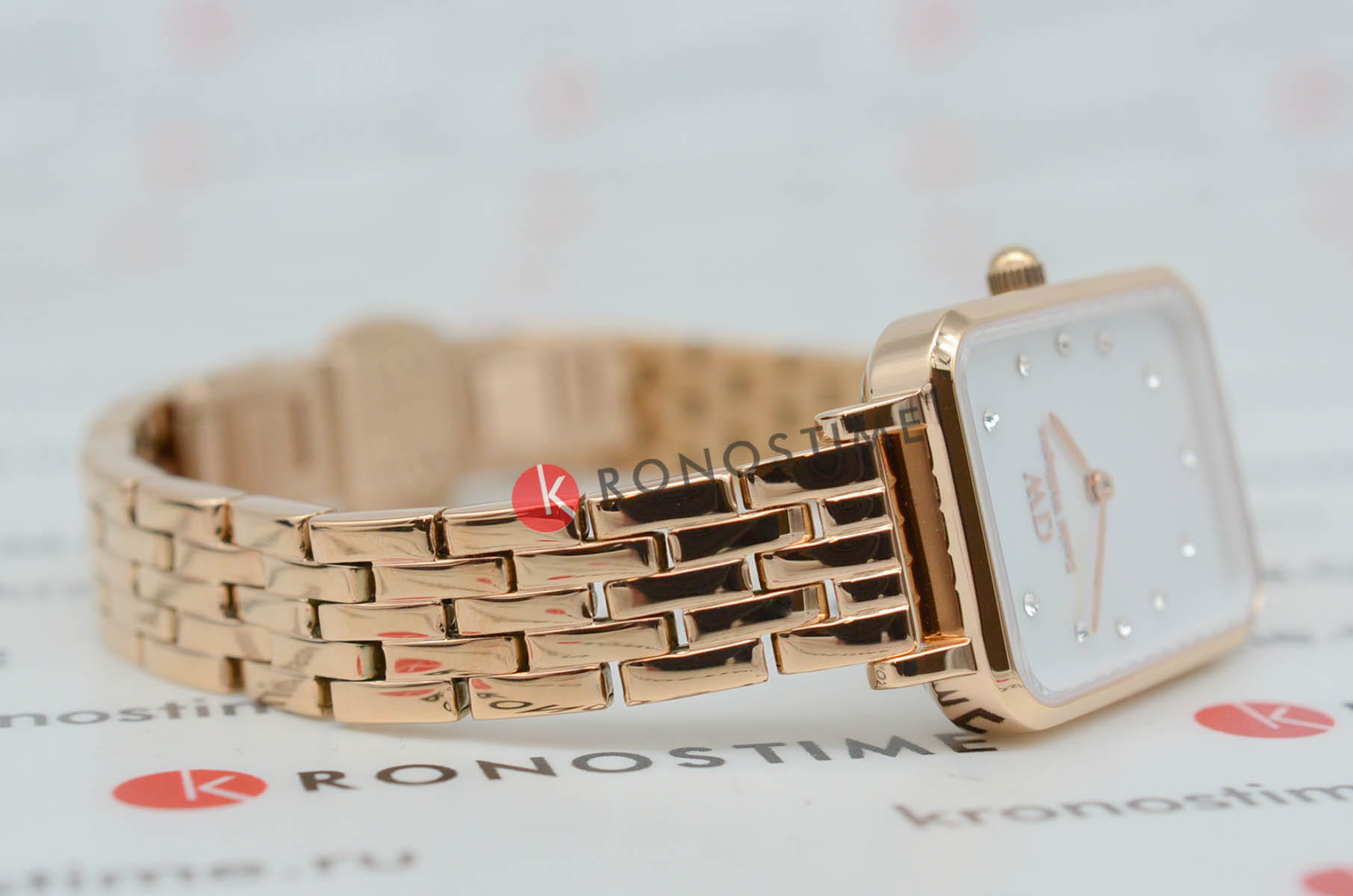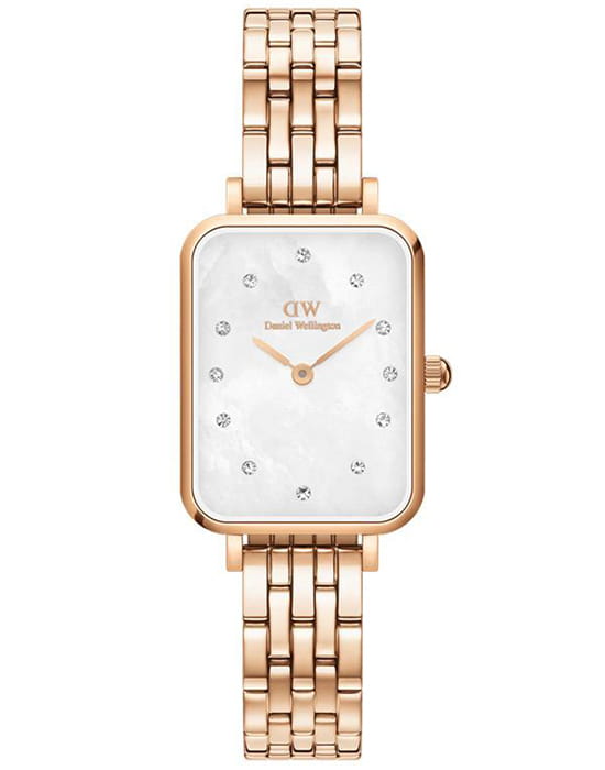 Daniel Wellington Quadro DW00100620 — элегантные женские часы с характерным скандинавским минимализмом. Прямоугольный корпус из нержавеющей стали с PVDPVDУльтратонкое покрытие наносится в технике вакуумного напыления, сочетает в себе нитрид титана особой прочности со слоем золота или оксида хрома. Несёт в себе декоративную или защитную функцию.-покрытием в цвете розового золота подчёркивает утончённость дизайна. Перламутровый циферблат украшен аккуратными метками-камнями, создающими изысканный блеск при каждом движении. Часы надёжно защищены минеральным стекломМинеральное стеклоМинеральное стекло представляет собой искусственно выращенный минерал кварца. Такое стекло отличается особой устойчивостью к повреждениям и царапинам. Уступает по некоторым качествам сапфировому стеклу., стойким к мелким повреждениям. Браслет из нержавеющей стали с утончённым плетением фиксируется с помощью застёжки «бабочка»Застёжка "бабочка"Такой вид застёжки дополняется предохранителями, помогающими избежать случайного раскрытия браслета. Обладают изящным исполнением. , которая обеспечивает комфорт и надёжность при носке. Модель работает на базе точного кварцевого механизма и подойдёт как для повседневных, так и для вечерних образов, подчеркивая индивидуальность своей обладательницы.