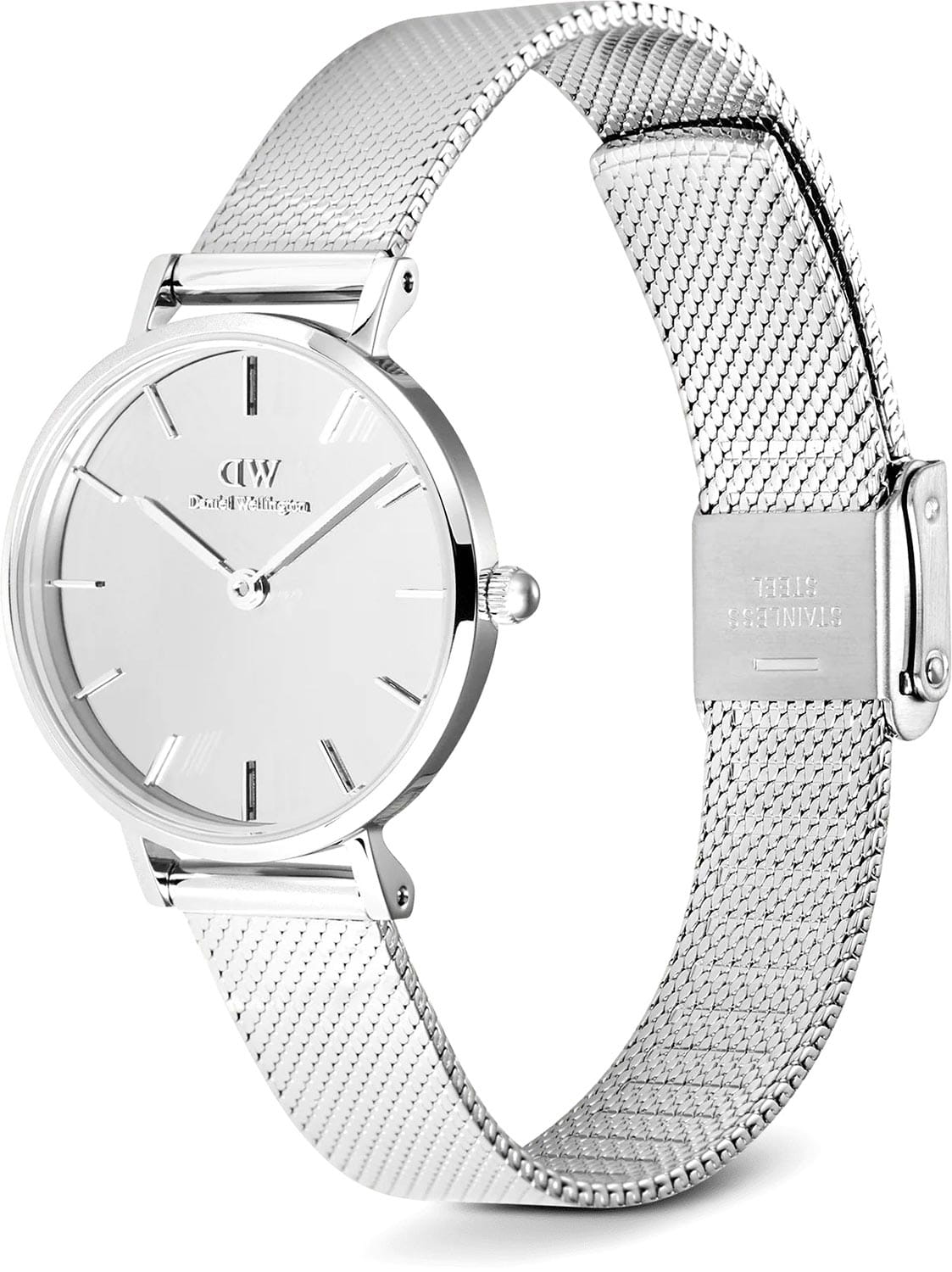 Женские наручные часы с минеральным стекломМинеральное стеклоМинеральное стекло представляет собой искусственно выращенный минерал кварца. Такое стекло отличается особой устойчивостью к повреждениям и царапинам. Уступает по некоторым качествам сапфировому стеклу. Daniel Wellington Petite Reflection Silver DW00100796, кварцевый механизм с высокой точностью. Корпус часов изготовлен из нержавеющей стали. Накладные метки в виде штрихов. Японский кварцевый механизм. Рифленая заводная головка. Класс водозащиты: 30 метров, позволит защитить корпус от случайных брызг или капель дождя. Стальной браслет миланского плетения на раскладном замкеРаскладной замокДанный вариант застежки используется только на часах с металлическим браслетом. Отличительная особенность такого крепления в том, что длина браслета становится универсальной и вы можете самостоятельно отрегулировать нужный вам размер – застежка просто двигается по браслету часов..